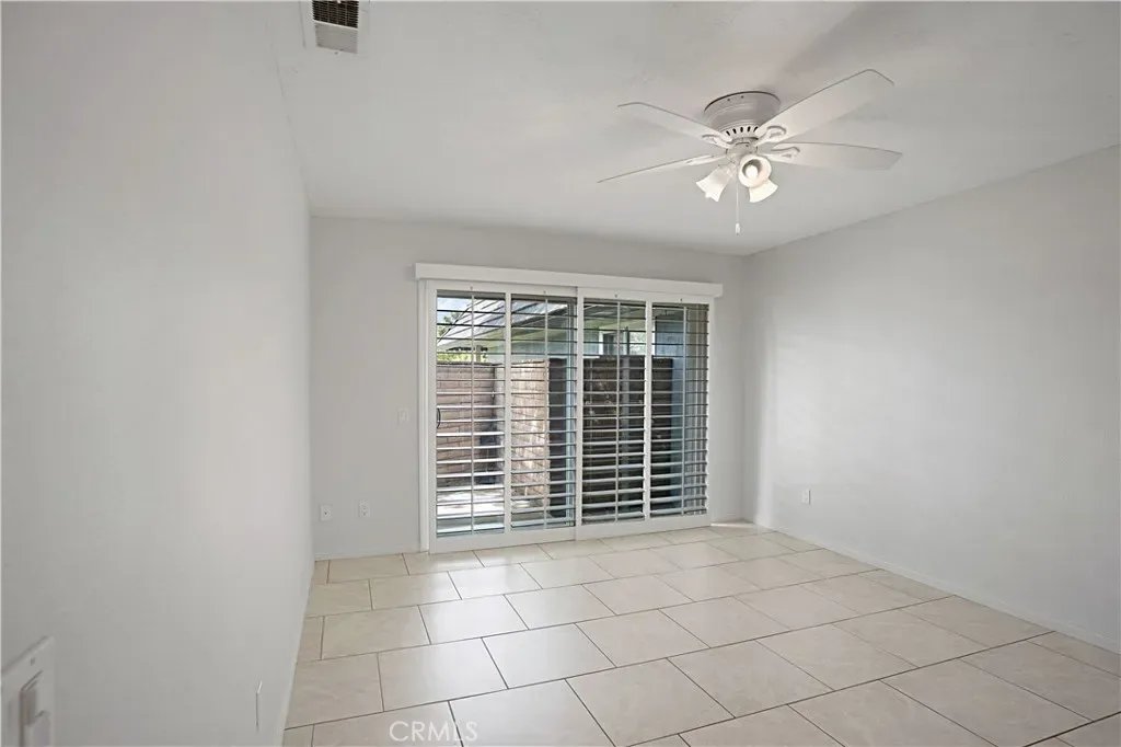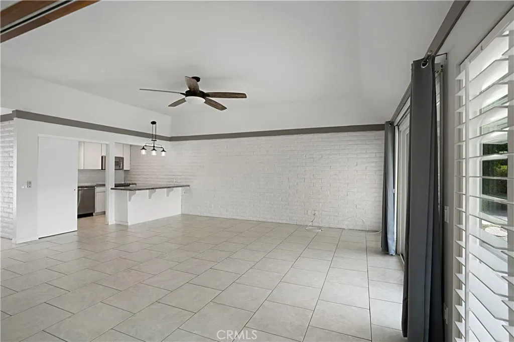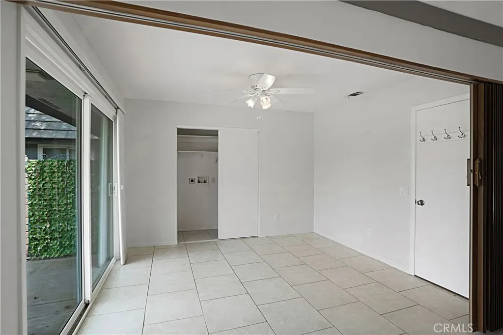 The interior showcases tile flooring throughout, elegant window shutters, and a beautifully updated kitchen with stainless steel appliances, including a refrigerator. In-unit washer and dryer hookups add everyday convenience, while the open-concept layout is filled with natural light, creating an inviting space for both living and entertaining.
