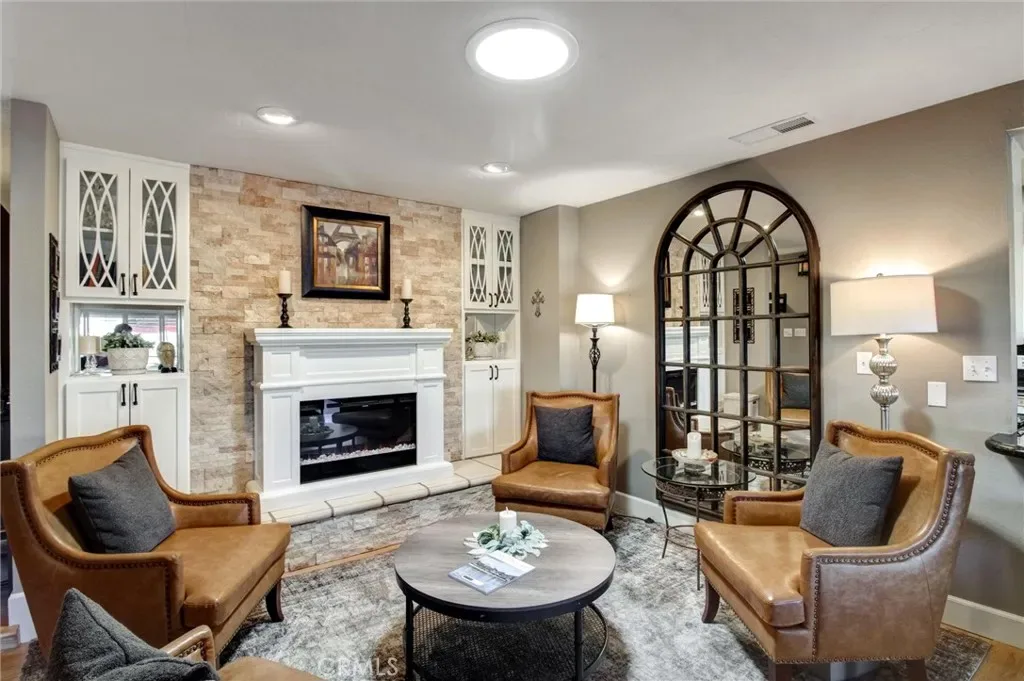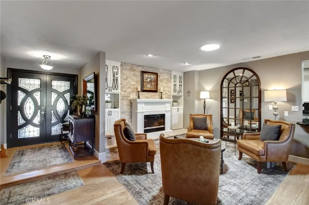 Enter through a charming arched gateway into a private, covered extended living area—perfect for entertaining or relaxing with family. Step inside the rich wood front door to a bright, open living space where panoramic lake views greet you from nearly every window plus 2 beautiful designer-stone fireplaces warming the two living areas. The galley kitchen is ideal for the home chef, offering a streamlined workflow and seamless connection to the formal dining area with built-in hutch.