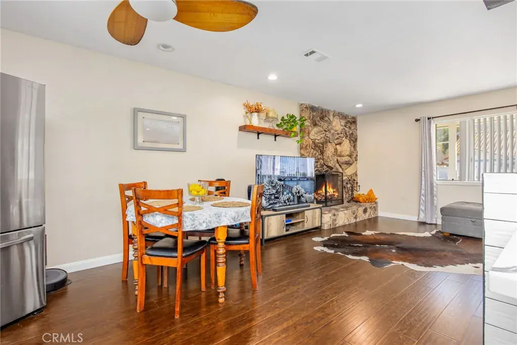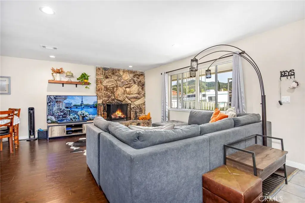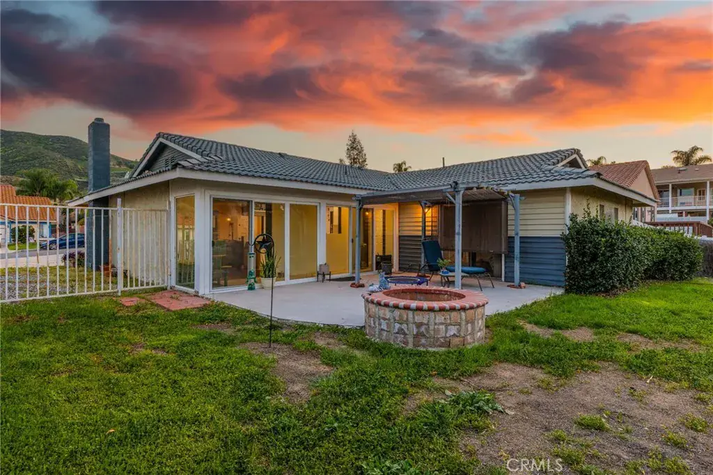 Welcome to this beautifully maintained single-story home offering 3 bedrooms, 2 bathrooms, 1,754 sqft of living space, and desirable RV parking. From the moment you step inside, you’re greeted by an inviting open floor plan centered around a stunning stone fireplace that anchors the main living space and creates a warm, welcoming atmosphere. The kitchen features upgraded countertops, white cabinetry, and durable tile flooring, opening seamlessly to the dining and living areas—perfect for both everyday living and entertaining. Wood and tile flooring flow throughout the home, and the bathrooms have been tastefully updated with modern counters. Two of the bedrooms are connected by a convenient Jack & Jill bathroom, offering both functionality and privacy. The spacious primary suite includes a sliding door with direct access to the backyard, creating a peaceful retreat. A fully enclosed patio adds additional usable space, ideal for a game room, home gym, or relaxed indoor-outdoor living. The home also includes a whole-house water purification system for added comfort and convenience. Both the front and back yards are designed for low-maintenance living, while still offering plenty of room for outdoor seating, barbecues, and play areas. Situated on an elevated lot, the property offers the potential for future decking that could capture scenic lake views. With RV parking, a functional layout, and thoughtful upgrades throughout, this home is a fantastic opportunity for comfortable, easy living. Canyon Lake offers offers a low 1.1% tax base with no Mello Roos bonds, 384 acre waterski/fishing lake, 16 parks most with beaches and playsets, basketball courts, baseball fields, tennis & pickle ball courts, equestrian center, 18 hole golf course, pools, dog park,has golf cart friendly streets, slalom course, ski jump, restaurants, community events and so much more!!! Live life on vacation in Canyon Lake!
