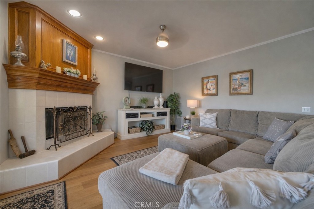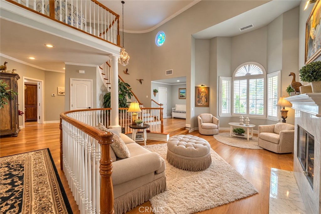 Spanning approximately 3,330 square feet, the home features 4 bedrooms and 3 bathrooms, including a main-floor bedroom suitable for guests or multigenerational living. The entry opens to high ceilings, a formal entry space, and a sunken living room that adds architectural character. Interior features include quartz countertops, recessed lighting, plantation shutters, and a kitchen equipped with double ovens and multiple dining areas for everyday living and entertaining.