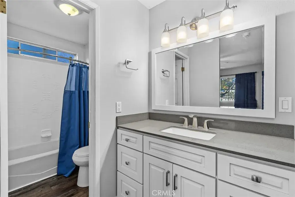 The upgraded kitchen boasts Corian countertops, a tile backsplash, and ample cabinetry with self-closing drawers. Both bathrooms have been tastefully upgraded, and vinyl flooring runs throughout the home. A cozy wood-burning tiled fireplace adds warmth and charm to the living area.