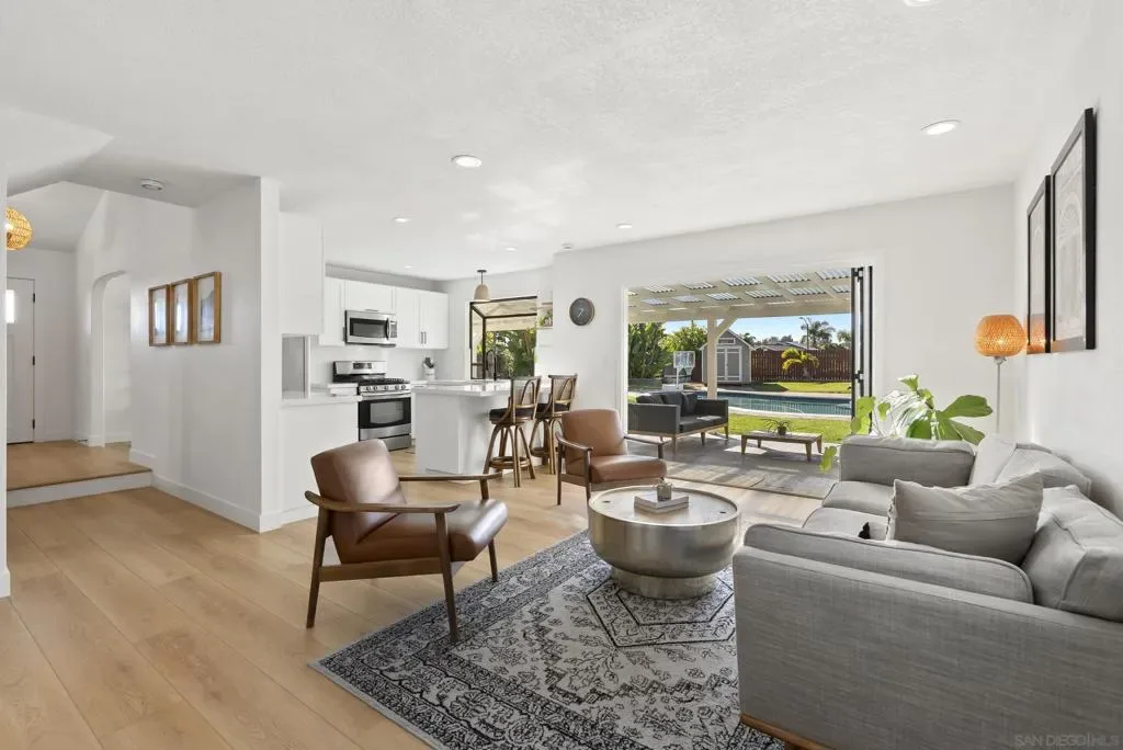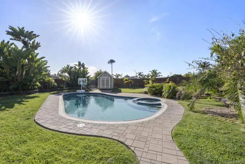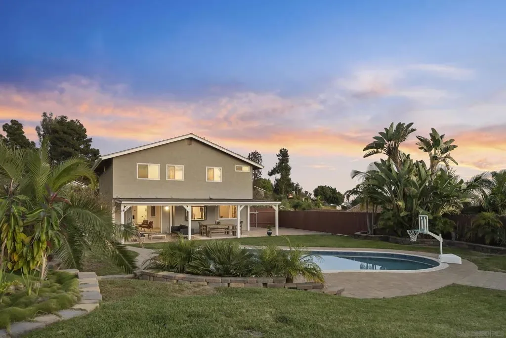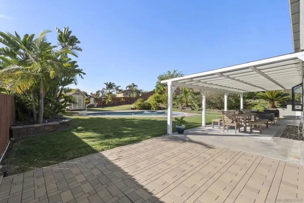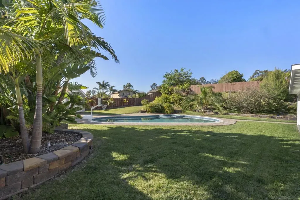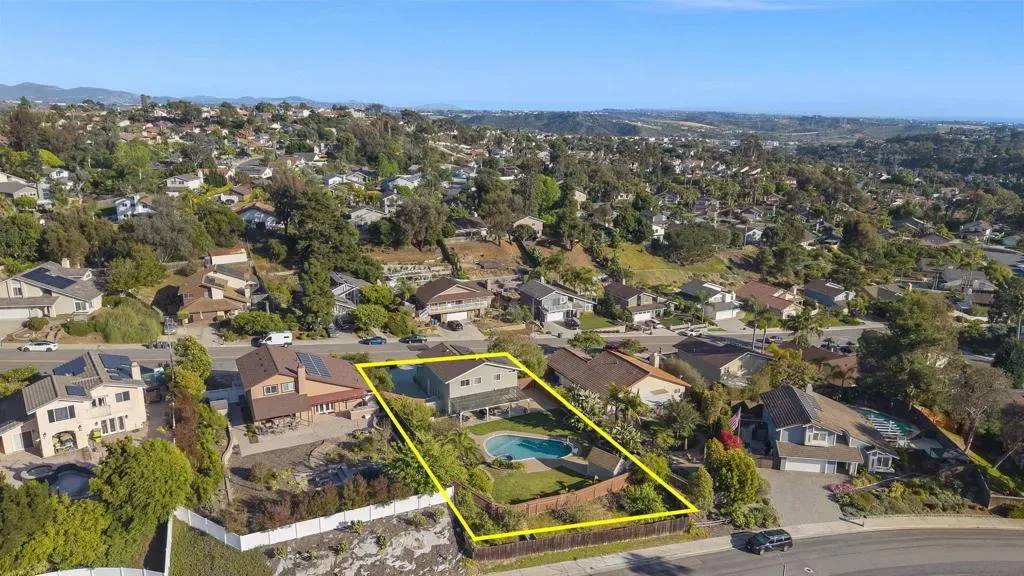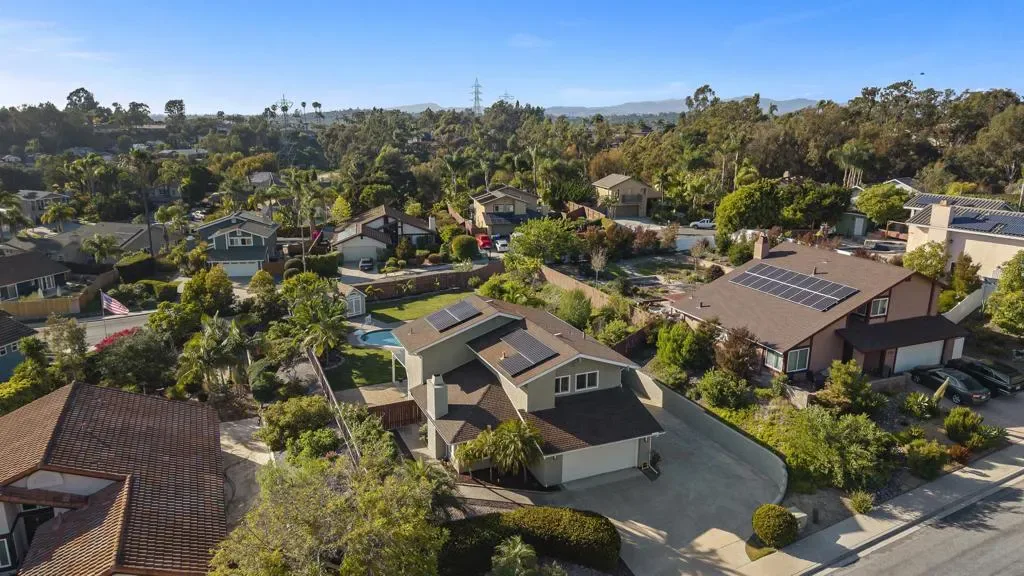 Beautifully remodeled 4-bedroom, 2.5-bath residence set on an expansive 14,343 sq. ft. lot with lush mature landscaping, fruit trees, a private pool, and spa. Enjoy exceptional privacy with no rear neighbors – an increasingly rare offering in the area. Designed for effortless California living, bi-fold doors open to a fully covered patio, creating a seamless indoor-outdoor experience. The home features a bright, open-concept layout with vaulted ceilings and generous living and dining spaces. The upgraded kitchen offers quartz countertops and modern fixtures, complemented by new flooring throughout. Thoughtfully upgraded bathrooms include a fully tiled primary suite with dual shower heads and a solid teak vanity. Extensive improvements include new flooring, kitchen surfaces and fixtures, new pool equipment, and updated exterior paint, gutters, doors, and patio roofing. The spacious lot also offers room for a potential ADU. Additional highlights include fully paid solar, RV parking, and no HOA or Mello-Roos. Ideally located just minutes from Carlsbad Village, pristine beaches, and the scenic trails of Calavera Hills Preserve, with access to top-rated schools.