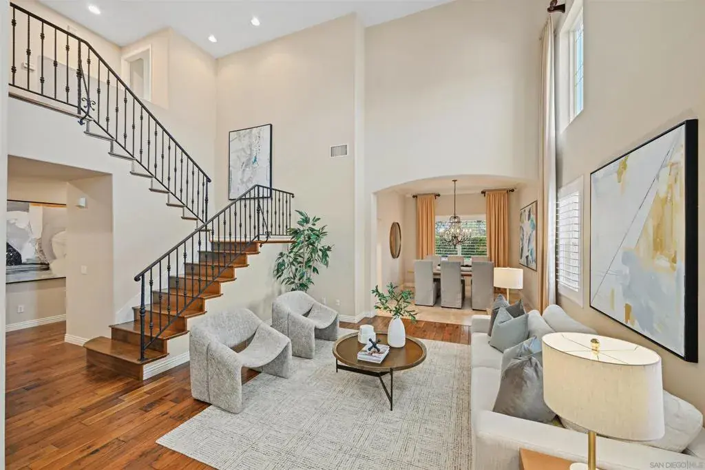 Coastal living at its finest awaits in this stunning five-bedroom, three-bath home in the desirable Rancho Carrillo community. A bright, open floor plan with soaring two story ceilings creates a welcoming first impression. The chef’s kitchen is beautifully appointed with quartz countertops and stainless steel appliances, with seamless flow into the cozy family room accented by stunning built-ins and direct access to the serene backyard. A convenient bedroom and full bath on the main level offer flexibility for guests or multigenerational living. The expansive primary suite opens to a private balcony and features an oversized walk-in closet and a spa-inspired bathroom retreat. Upstairs, a 5th bedroom can also be utilized as a large bonus room providing the perfect space for a home office, media room, or entertainment area. An attached 3 car garage provides room for all your toys and keeps you organized. The inviting backyard offers tranquil relaxation as you sip your favorite beverage soaking in the sounds of the soothing fountain or dine al fresco under the covered patio while loved ones frolic in the plentiful grassy areas. Splendid views and breathtaking sunsets can be enjoyed on any of the multiple decks or in the backyard. Less than a mile away enjoy Alga North Park offering a skateboard area, dog park and olympic size pool. Ideally located near great schools, shopping, dining, entertainment venues and only 6 miles from the ocean! This showcase home awaits your arrival!