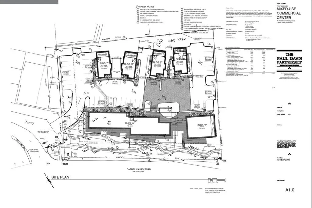 25-27 W Carmel Valley Rd is a 1.57 acre vacant parcel in the center of Carmel Valley Village. Included in the sale are plans for a mixed use project that includes 8,500 SF of retail/ office space and 4,300 SF of residential space. The property is walking distance to 20+ wineries/ tasting rooms, 16 restaurants, a grocery store, multiple inns, spas and art galleries. There are 5 open permits (2 discretionary planning permits, and 3 construction permits) and approximately 1.163 acre feet of water on record with the Monterey Peninsula Water Management District.