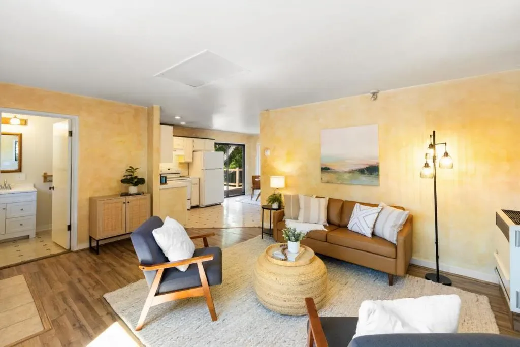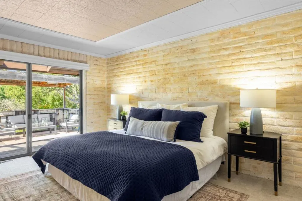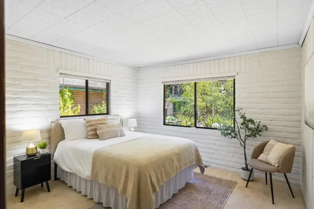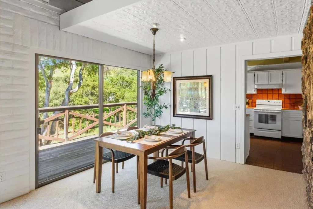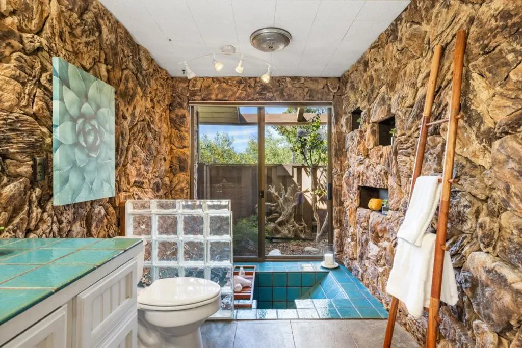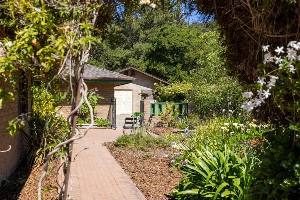 Weathered sage doors with carved accents and a lizard knocker announce that whoever lives here sees the world differently. Ivy twists up a warm brick facade, past lace curtains and painted shutters. Built in 1976 and suffused with the organic warmth of that era, this single-level home sits on nearly an acre of sun-drenched land where birdsong and fountain tinkle are the only sounds that reach you. A massive double-sided river rock fireplace anchors a sunken living room where wall-to-wall windows slide open onto a wraparound deck with a built-in hot tub. Keep walking, and find yourself amid gardens of breathtaking whimsy: pebble paths winding through succulents and wildflowers, rust-patinated iron sculptures, and a covered yoga area. Bright orange kitchen tiles, wood paneling, and earth tones create an eclectic yet cohesive interior. Nothing prepares you for the primary bathroom: river rock walls, a sunken turquoise-tiled tub, and a window framing sculptural driftwood. It feels like a grotto. A detached guest house awaits with a full kitchen, family room, dining area, private bedroom, and its own deck. Perfect as a rental income opportunity or a retreat for visiting family. This spectacular property makes you reconsider what a home can be.