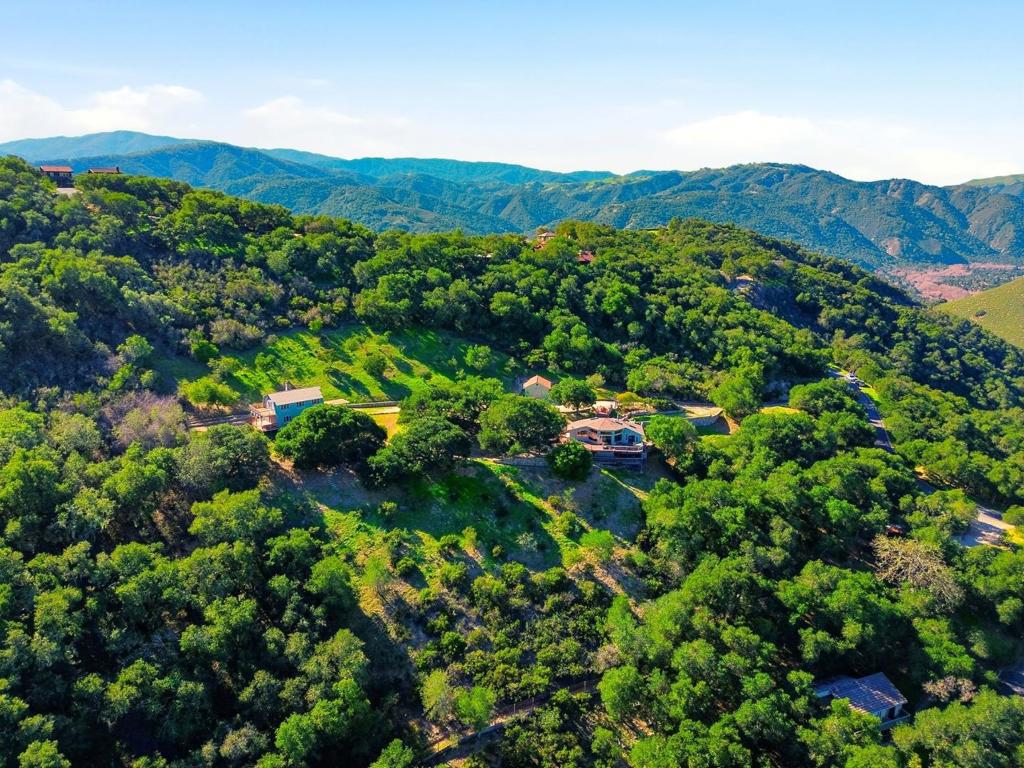 Nestled in the beautiful serene hills of Los Tulares, just minutes from Carmel Valley Village, is a unique private retreat. Enter via a curving stone-lined drive to arrive at a totally secluded oasis framed by statuesque oaks. Two distinct residences are connected by meandering stone paths, outdoor gathering areas, a peaceful waterfall and koi pond. The circular homes main floor features a warm, lodge-style living room with a wall of windows that bathe the space in natural light. A massive chandelier and stunning stone wood-burning fireplace add a cozy focal point, while the open kitchen and dining area make everyday living and entertaining effortless. Off this area, find the unique and comfortable primary suite, two full baths, and a flexible bonus room. Outside, a huge deck captures sweeping valley views of the prestigious “Village Ranches” and no neighbors, just lowing cattle. Downstairs, with access to the wine cellar, a separate lower-level suite offers its own kitchenette, bathroom, bedroom, living space, and separate deck with the same stunning view and easy access to both the front and rear of the property. Continuing further on the drive we find the separate two-story barn-style ADU with 1,484 sq. ft. of multi-purpose use, including 2 bedrooms, a bath, and kitchen.