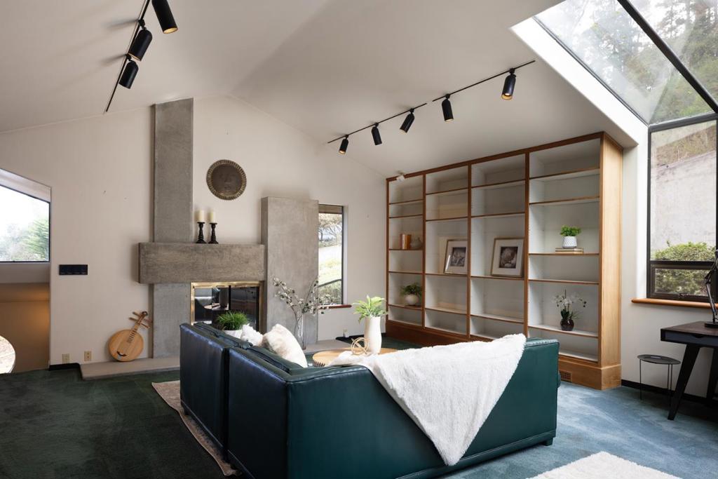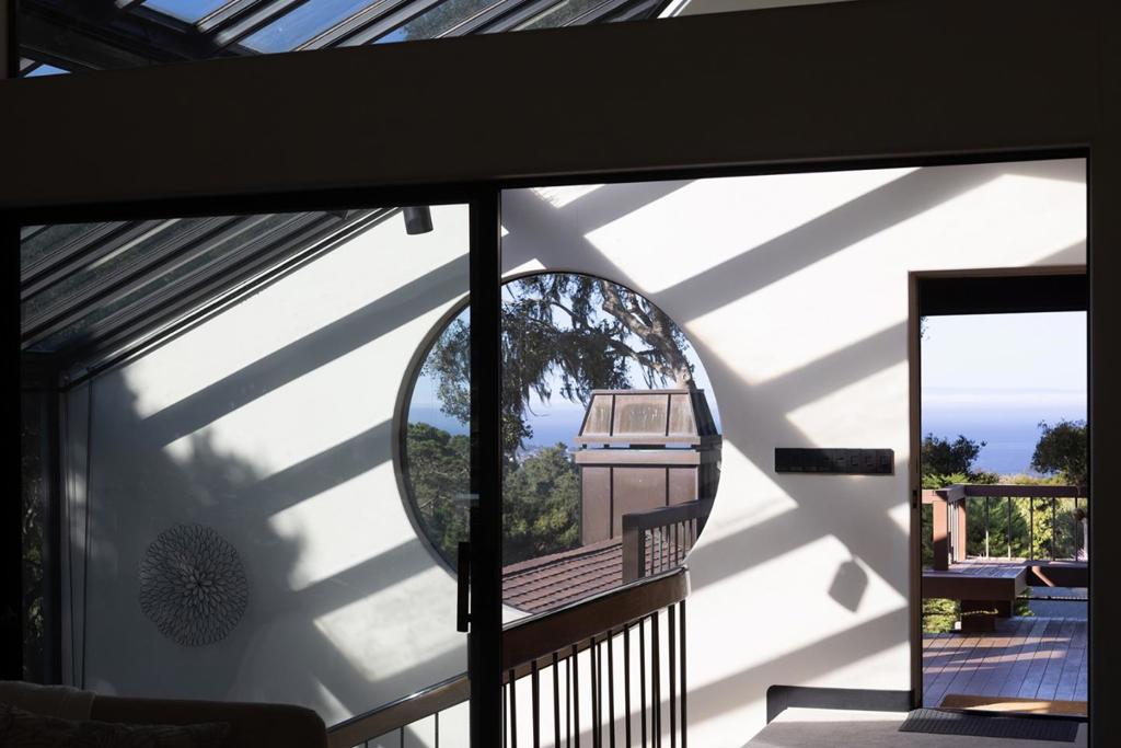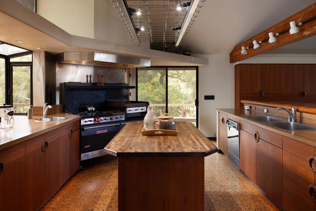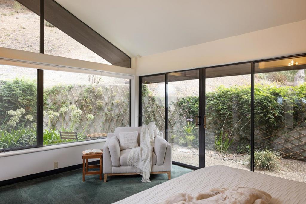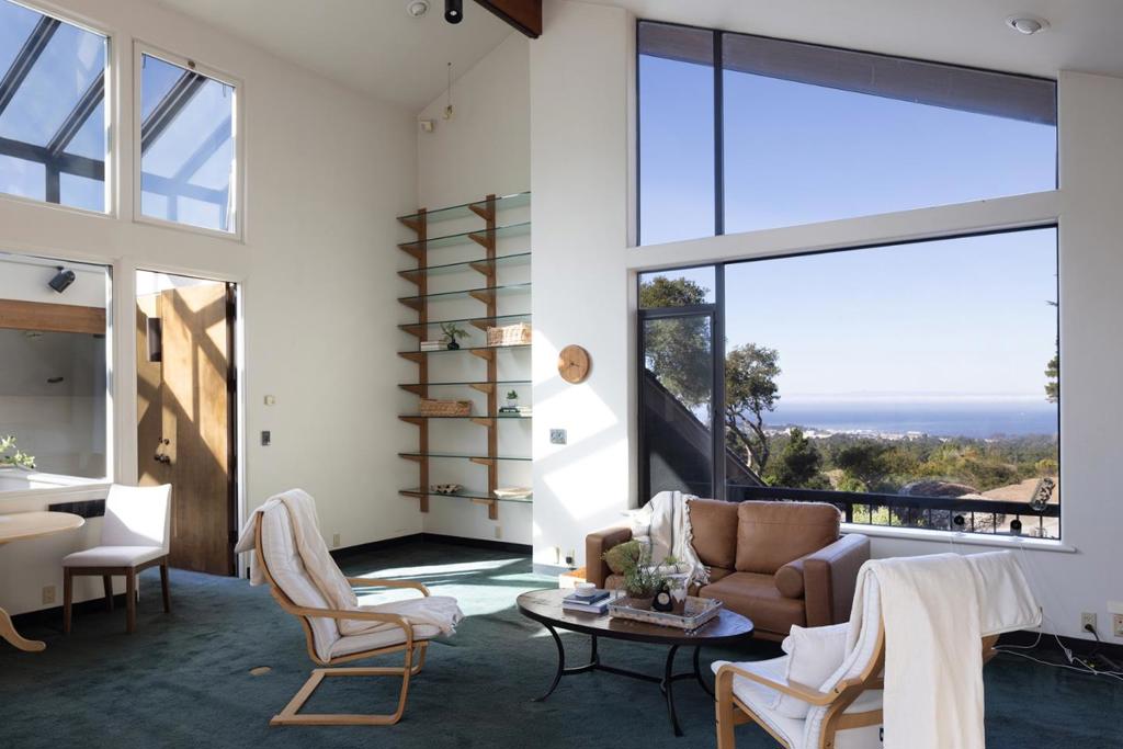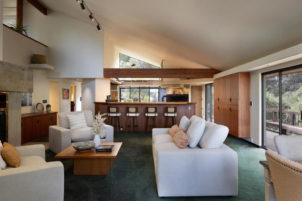 Designed by local acclaimed architect Olof Dahlstrand, this architectural gem blends timeless design with the tranquility of its five-acre Carmel setting. Crafted in redwood and teak, the ~5,777 sq. ft. residence frames sweeping views of Monterey Bay and the surrounding forest through walls of glass and expansive decks. Inside, warm textures and fine materials define every space, including five sculptural concrete fireplaces and custom built-ins throughout. Perfect for entertaining, the home features multiple living areas, including a library and family room, and two full kitchens; one with a commercial-grade Vulcan range and dual Traulsen refrigerators. Four ensuite bedrooms each open to private patios, while the primary suite offers its own fireplace and kitchenette. Additional amenities include a sauna, two laundry rooms, an artist studio with water, and a detached four-car garage. Centrally located within a few minutes’ drive into downtown Carmel, Monterey, and all the incredible amenities the Peninsula has to offer, this rare architectural retreat is a place where design, nature, and light exist in perfect harmony.