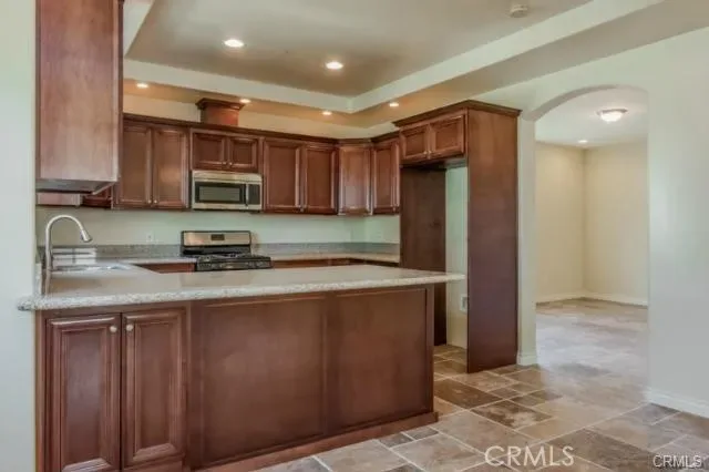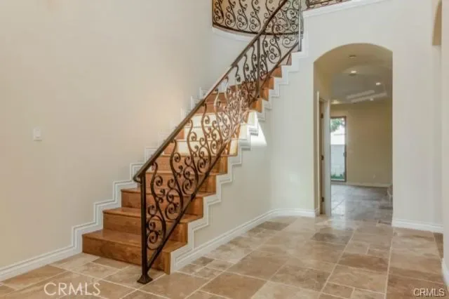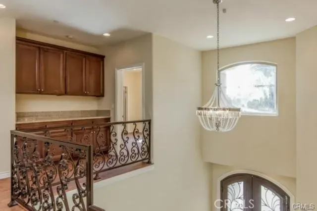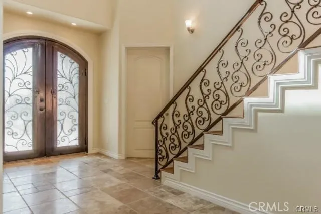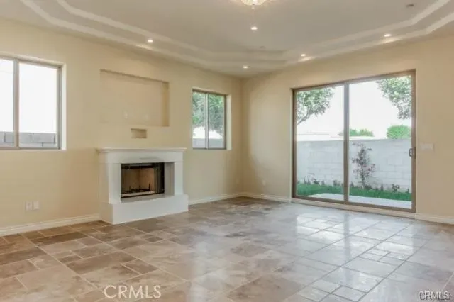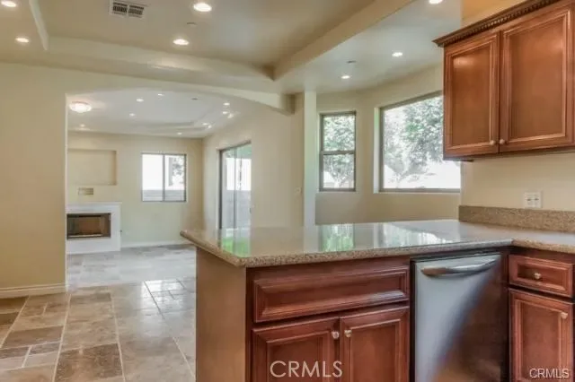 The home welcomes you with a striking wrought-iron double-door entry featuring operable glass panels for natural light and airflow. Inside, travertine flooring on the ground level, soaring ceilings, and architectural metal railings create an impressive foyer. The entry level is bright and open, featuring a ground-floor bedroom with ensuite, ideal for guests, in-laws, or a home office. The living room is designed for comfort and ambiance, showcasing a gas fireplace, powder room, dramatic inverted recessed tray ceiling, and sliding glass doors that lead to the backyard. Just a few steps up, the kitchen offers easy access for everyday living and entertaining.