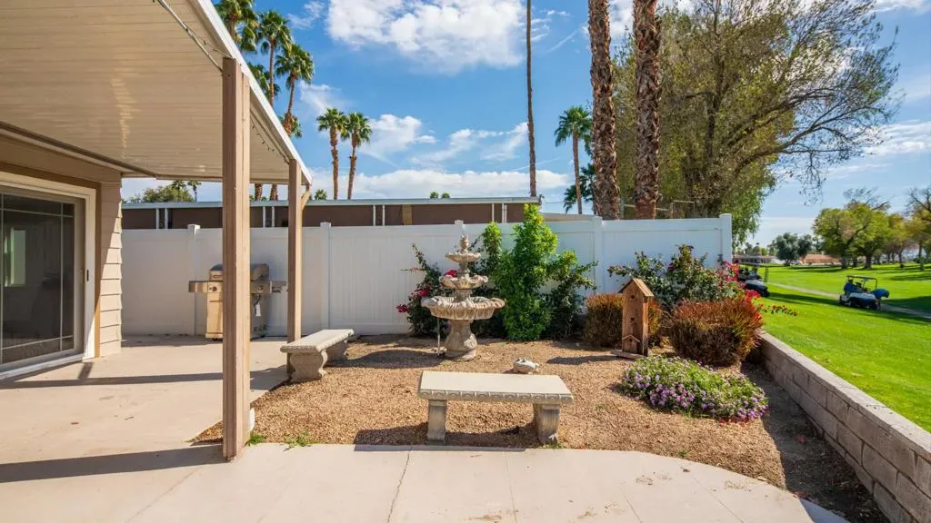 Set in a prime golf course location, this beautifully cared-for three-bedroom, two-bath home captures sweeping mountain views and sparkling city lights from its elevated perch. The raised setting offers enhanced privacy and an exceptional outdoor lifestyle, where the expansive patio is perfect for quiet mornings, sunset views, and effortless entertaining under the desert sky.Designed for easy living, the property features low-maintenance landscaping and a true move-in-ready presentation. Thoughtful upgrades are evident throughout, including new flooring in the lounge, New double-pane windows on both sides of the home , new roof with drains cleared, new gas lines under the house , new built in wall oven and microwave, repainted kitchen cabinets, repainted cabinets in guest bathrooms, new front screen retractable door installed and numerous additional improvements ( we have a list ) that reflect the pride of ownership and care poured into this home. The interior feels bright and airy, filled with natural light and an open, welcoming atmosphere.Unwind in the beautifully upgraded primary bath, highlighted by a jetted soaking tub, granite-topped dual vanities, and an ambiance reminiscent of a private spa.. The guest bathroom is beautifully updated with a spacious tiled walk-in shower and quartz countertop, offering comfort and style for visitors.A welcoming dining area with a built-in wet bar adds both charm and functionality, making it ideal for entertaining and everyday enjoyment.Lovingly maintained and thoughtfully updated, this home offers a rare blend of location, views, comfort, and quality, all within the sought-after Date Palm Country Club. Furniture included per sellers inventory list !!