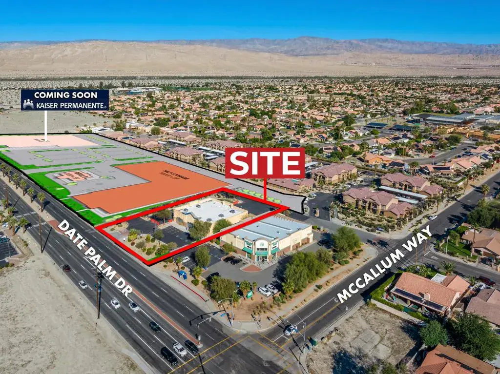 7,000 SF retail/commercial building on .91 acre lot. Impressive traffic counts with 96′ of frontage on Date Palm Dr. Large showroom and one roll-up door. Located at the signalized intersection of Date Palm Dr and McCallum Way. Easy access to Interstate 10 and major arterial roads. Excellent building signage including freestanding pylon signs. Adjacent to Dollar Tree and Rosemount Self Storage and retail center coming soon. In an area of explosive growth, with a 204-unit apartment complex coming soon and a proposed retail center just north of the subject property.