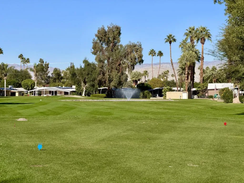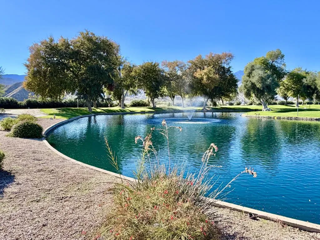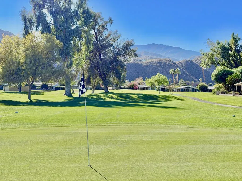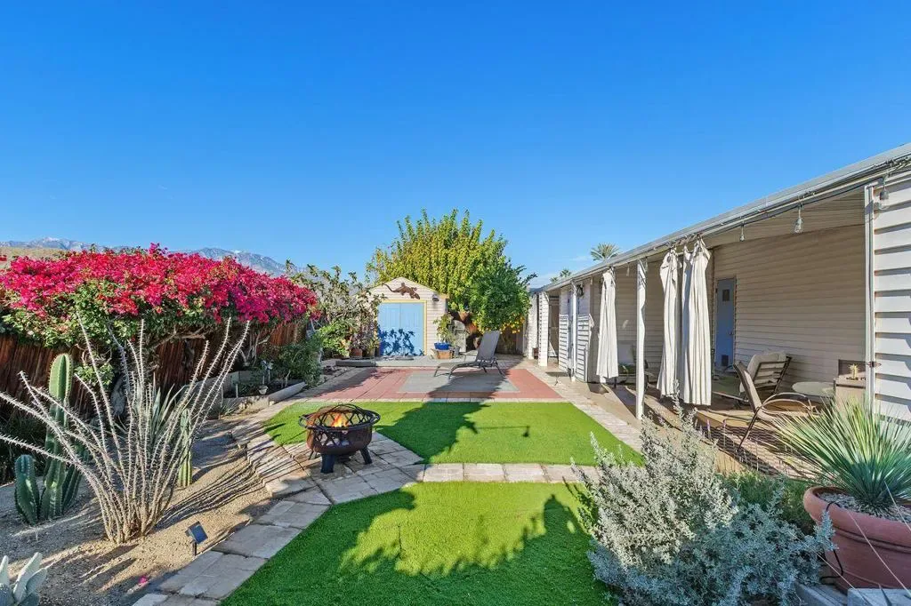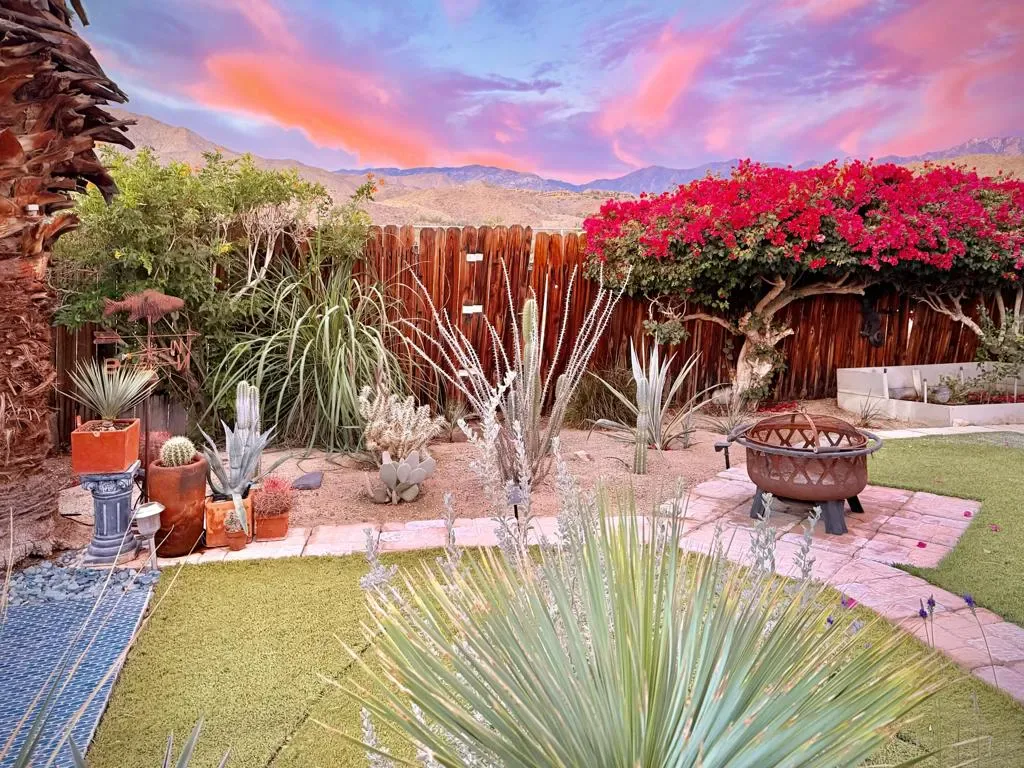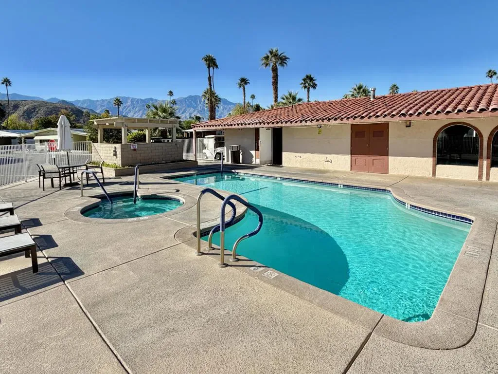 Enjoy a blissful spa experience at home at this exceptional desert haven with jaw-dropping panoramic mountain views. In a tranquil, private corner of Date Palm Country Club is a 2 bedroom, 2 bathroom home like no other. Highlighted by striking desert landscaping and lush fruit trees, the exceptionally serene back yard boasts a new hot tub/spa, an outdoor shower, and fire pit with an emphasis on privacy. Imagine waking up every morning to savor your coffee in the garden or taking a long soak in the hot tub while enjoying the sunset over the mountains. The inside is warm, spacious and inviting, upgraded with many quality materials throughout. 310 Via Don Benito features gorgeous Saltillo tile flooring, plantation shutters and efficient mini-split cooling & heating. The open kitchen has Corian countertops, a butcher block island, custom cabinets, under-cabinet lighting, and new KitchenAid appliances with air fryer. Both of the bedrooms also feature custom cabinetry to help stay neat and organized. The primary bathroom showcases a beautifully tiled walk-in shower and a Talavera hand-painted sink. New wireless ceiling fans have been installed. The patio’s commercial misters can keep you cool in the summer and the standalone workshop/art studio is powered and air conditioned. The property is amply powered by a leased solar system with 38 panels. The inside electrical panel and water heater have been newly upgraded. The landscaping is watered by a drip irrigation system, managed by an advanced Smart sprinkler controller, which self-adjusts to weather conditions. Abundant storage throughout, with an additional powered shed. This warm, inclusive community caters to individuals aged 55 and older and residents have access to fantastic amenities, including a golf course, pickleball and tennis courts, pro shop, three swimming pools, gym equipment, and a restaurant.