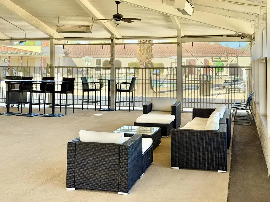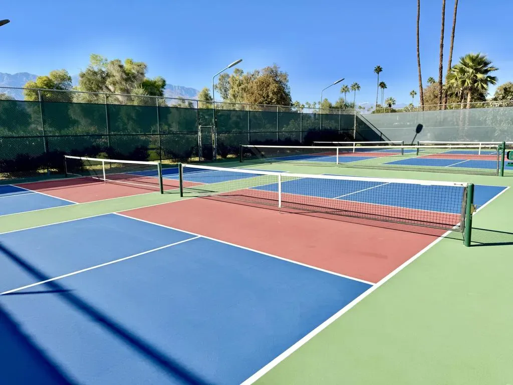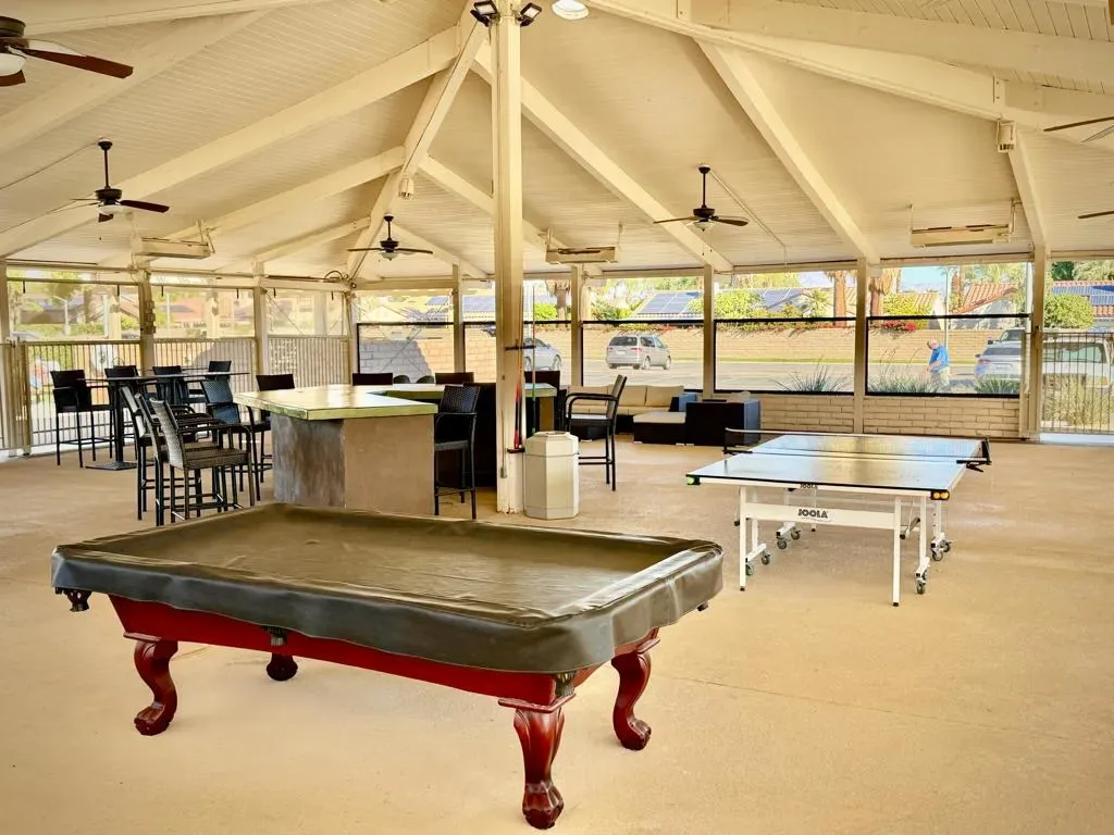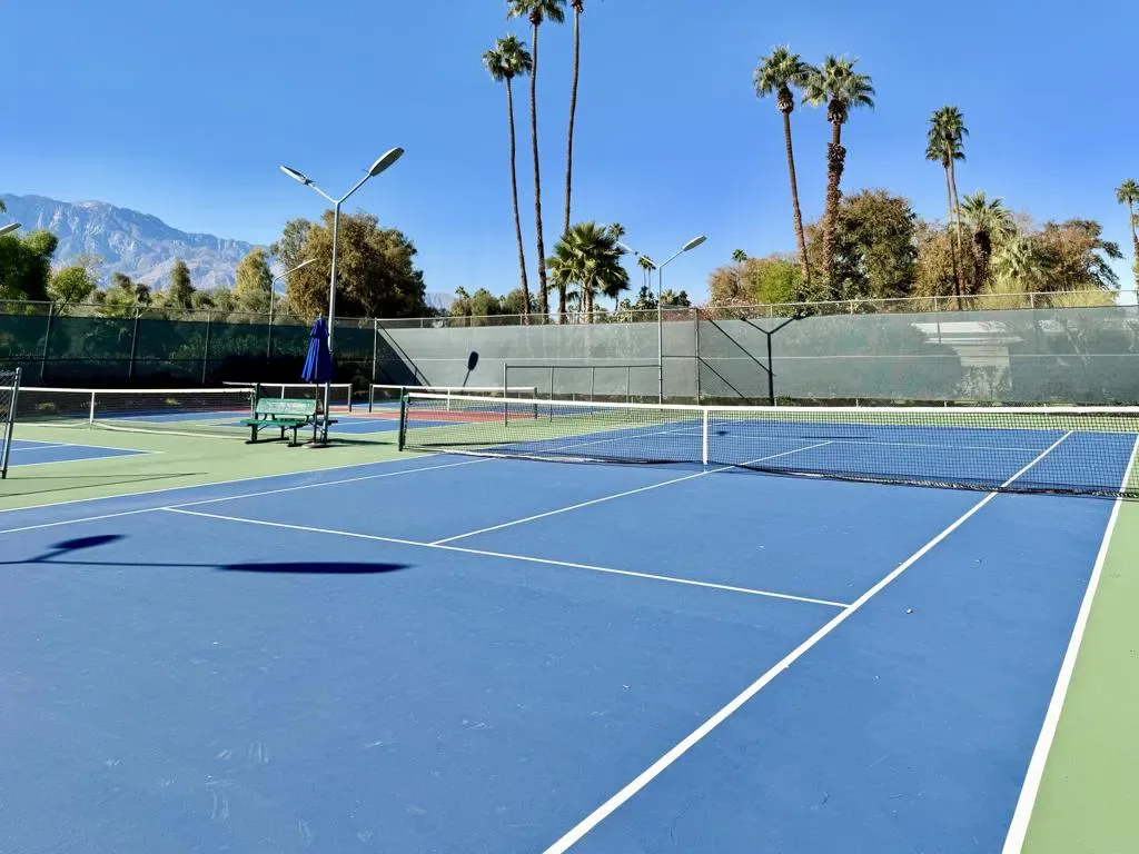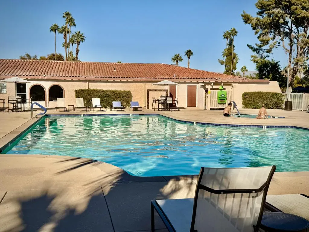 Enjoy a blissful spa experience at home at this exceptional desert haven with jaw-dropping panoramic mountain views. In a tranquil, private corner of Date Palm Country Club is a 2 bedroom, 2 bathroom home like no other. Highlighted by striking desert landscaping and lush fruit trees, the exceptionally serene back yard boasts a new hot tub/spa, an outdoor shower, and fire pit with an emphasis on privacy. Imagine waking up every morning to savor your coffee in the garden or taking a long soak in the hot tub while enjoying the sunset over the mountains. The inside is warm, spacious and inviting, upgraded with many quality materials throughout. 310 Via Don Benito features gorgeous Saltillo tile flooring, plantation shutters and efficient mini-split cooling & heating. The open kitchen has Corian countertops, a butcher block island, custom cabinets, under-cabinet lighting, and new KitchenAid appliances with air fryer. Both of the bedrooms also feature custom cabinetry to help stay neat and organized. The primary bathroom showcases a beautifully tiled walk-in shower and a Talavera hand-painted sink. New wireless ceiling fans have been installed. The patio’s commercial misters can keep you cool in the summer and the standalone workshop/art studio is powered and air conditioned. The property is amply powered by a leased solar system with 38 panels. The inside electrical panel and water heater have been newly upgraded. The landscaping is watered by a drip irrigation system, managed by an advanced Smart sprinkler controller, which self-adjusts to weather conditions. Abundant storage throughout, with an additional powered shed. This warm, inclusive community caters to individuals aged 55 and older and residents have access to fantastic amenities, including a golf course, pickleball and tennis courts, pro shop, three swimming pools, gym equipment, and a restaurant.