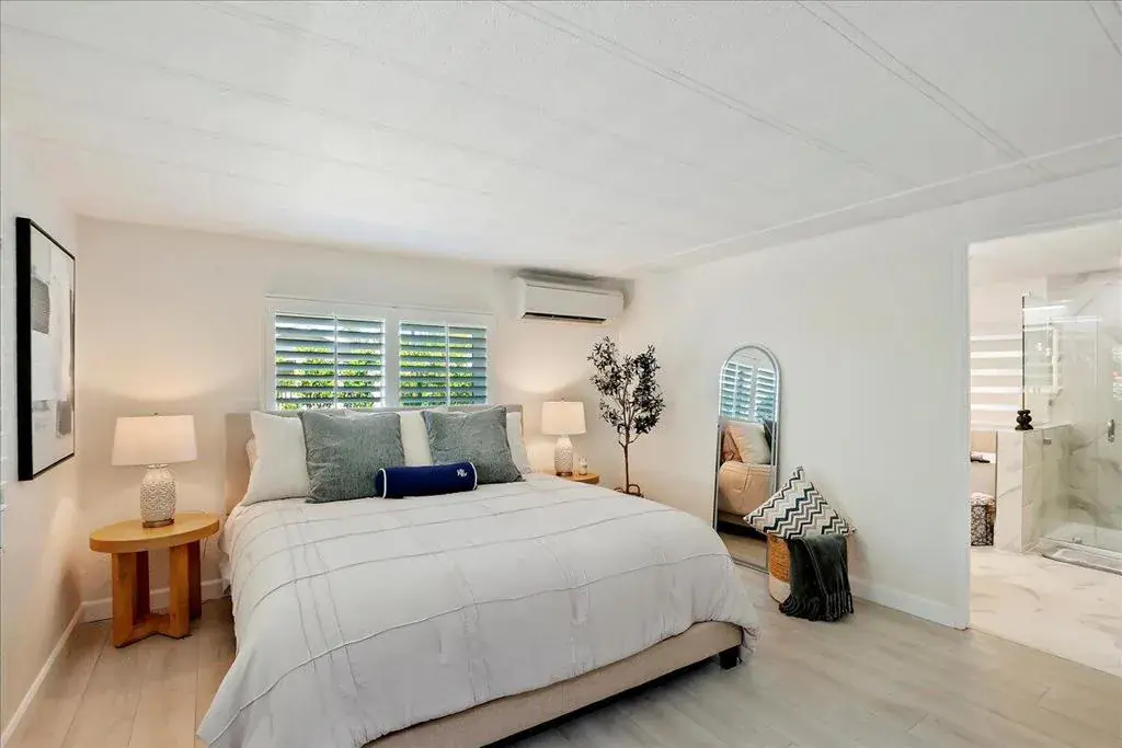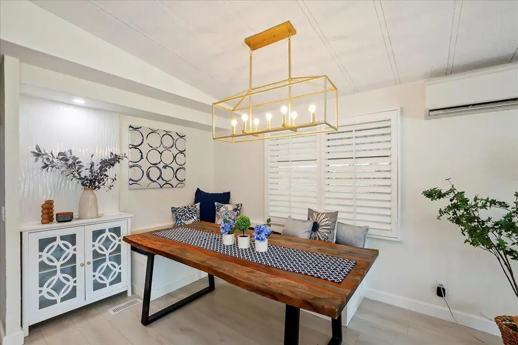 Designed to the 9’s with Amazing Mountain & Sunset Views! Nestled within the premium ”back nine greens” of the Date Palm Country Club, this extraordinary home resides directly on the community’s epic Ted Robinson designer golf course with fabulous views of the Santa Rosa andSan Jacinto Mountains. Overlooking a lovely fairway pond with sparklingfountain, the spacious wrap-around covered patio is literally an entertainer’sdelight with an abundance of space to host an evening amongst friends orto indulge in a private picturesque morning with a cup of coffee. Uponentering one is greeted by an inviting coastal-rustic themed interior, with ahint of retro, coupled with a remarkable amount of natural light that illumesfrom the dual sliding patio doors. The fresh, modern paint colors, stunningaccessories and ideal accents throughout the inside and outside permeate anew yet timeless charm and appeal that will be appreciated every day thishome is your very own. The elegantly upgraded living room with vaultedceilings, custom fireplace wall and richly refined full bar with stylish stoolsmakes a wonderful indoor oasis for creating cherished moments or a relaxingretreat. Dine in style seated at the custom banquette dining area just off theimmaculate kitchen that boasts quartz-countertops throughout, a chicbreakfast bar, stainless-steel appliances, fashionable fixtures, and whiteshaker cabinets with gorgeous gold handles. The luxurious primary suiteoffers both her and his closets in addition to a phenomenal master bath witha contemporary tiled shower, free standing soaking tub, and dual vanity with a brilliant touch-lit mirror. The spacious second bedroom provides a mirror-wall closet and direct access to the exquisite guest bath with an ovation-curved shower/tub. Adding to the convenience and value of this incrediblehome is a third bedroom that can be used as an office, den, or guest roomfor the grandkids. The indoor laundry room includes a stainless-steel basinadjacent to a space saving stacked washer and dryer. All the old windowsthroughout have been replaced with new insulated windows that include alifetime warranty. The old lawn sprinklers have been upgraded to a reliableeasy-to-program irrigation system to maintain the vast amount of new lushlandscaping. Most impressively this amazing property is primarily poweredby solar panels leased at only $119 per month. An opportunity of a lifetimefor those