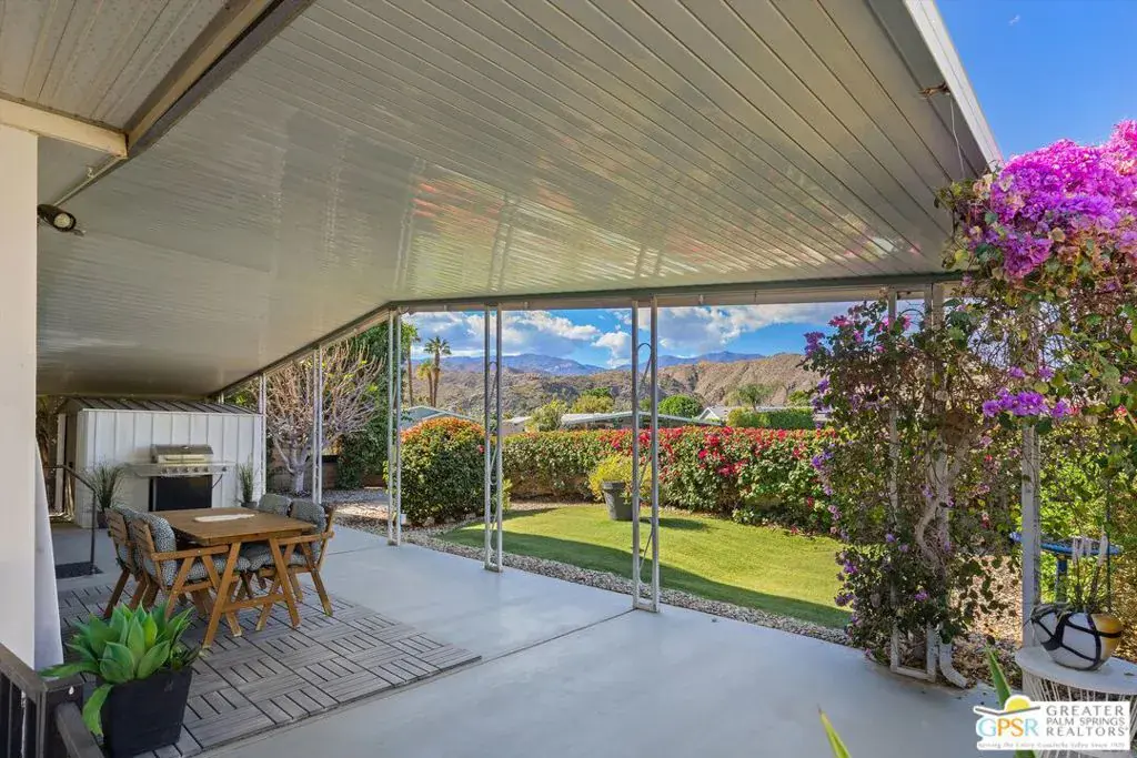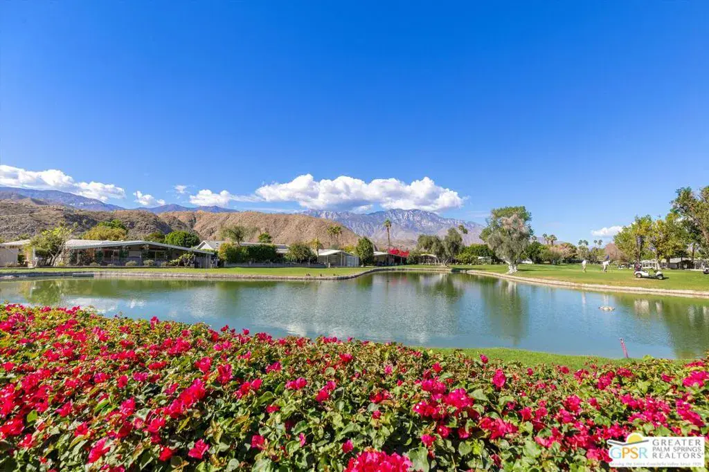 From relaxing mornings with coffee to evening cocktail parties, the spectacular views at this move-in-ready Cathedral City home provide an ideal backdrop for every occasion. Stretching directly across lush fairways and the largest lake at Date Palm Country Club, views reach the summit of Mount San Jacinto and frame stunning sunsets. Enjoyed from indoors and a private backyard with lawn and covered patio, the panoramic vistas complement a double-wide manufactured home that spans approximately 1,440 square feet and presents two bedrooms and two baths. Remodeled and fully furnished, the residence now features drywall in place of paneling on all walls and ceilings, woodgrain laminate flooring, fresh paint and an open floorplan. Free flowing living and dining areas offer seamless access to a custom kitchen with white cabinetry, preferred stainless steel appliances, new countertops, a full tile backsplash and movable butcher-block island with seating. Baths display new vanities, new sinks, and new showers with fashionable tile surrounds and frameless roller-style glass doors. Two sinks, a rain shower and walk-in closet are showcased in the private primary suite. Designer lighting fixtures, recessed LED lighting, a front-loading washer and dryer set, and upscale furnishings are also included. Outdoors, a covered carport is located to the left of the home, and on the right, a gated patio wraps around to the backyard. Reserved for homeowners 55 and better, the guard gated Date Palm Country Club reveals a resort setting with 18-hole golf course, full-featured pro shop, newly remodeled luxury clubhouse, a popular restaurant, three pools and spas, tennis and pickleball courts, a fitness center, dog park, library/meeting room, and scenic greenbelts and lakes. Restaurants, shopping, theaters, a casino and recreational attractions are moments from home, and Palm Springs and Rancho Mirage are equally convenient.
