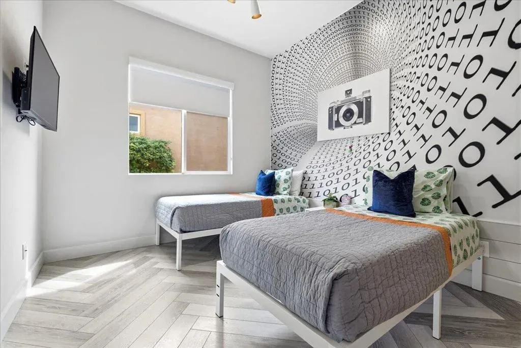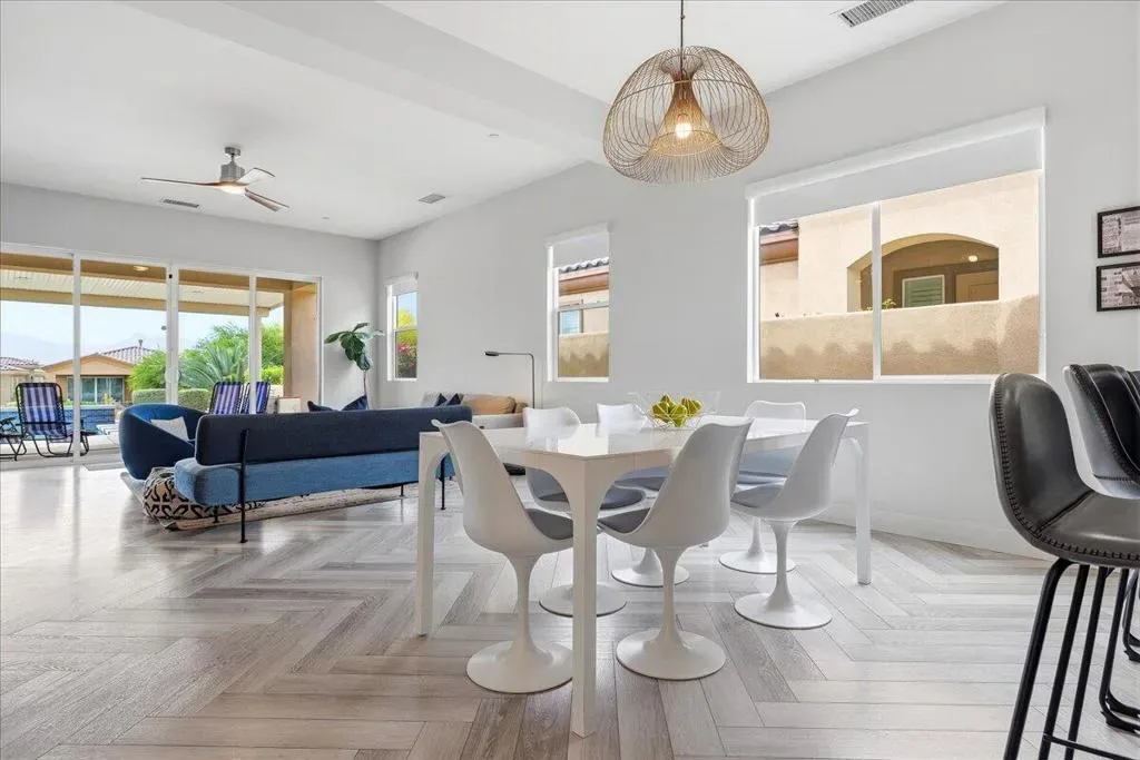Located in the highly sought-after Desert Princess Country Club, adjacent to the DoubleTree by Hilton Golf Resort, this upgraded vacation home sits on a premium lot with stunning San Jacinto Mountain views. Designed for both lifestyle and income potential, this property is a true standout. The home features a striking mid-century modern saltwater pool and spa with a discreet underground equipment pit, creating a clean and elevated outdoor aesthetic. Inside, you’ll find designer upgrades throughout, including herringbone-style flooring, a spa-inspired primary bath, and a fully remodeled gourmet kitchen with stainless steel appliances, LG Bespoke refrigerator with built-in water pitcher, glass subway tile backsplash, and extended cabinetry. The well-designed floor plan offers a spacious primary suite, while two private guest bedrooms are positioned on the opposite side of the home and connected by a Jack-and-Jill bathroom–ideal for guests or short-term rental flexibility. Additional features include built-in closets and an EV charger in the garage. Desert Princess offers resort-style living with a 27-hole PGA Championship golf course, 35 pools and spas, clubhouse with restaurant, fitness center, tennis, pickleball, bocce ball, and 24-hour guard-gated security. HOA includes landscaping, water, trash, cable, and high-speed internet. Rare advantage: Fee simple land ownership (no land lease), adding long-term value and financing ease. Perfect as a primary residence, second home, or income-producing investment–this is desert living at its finest.