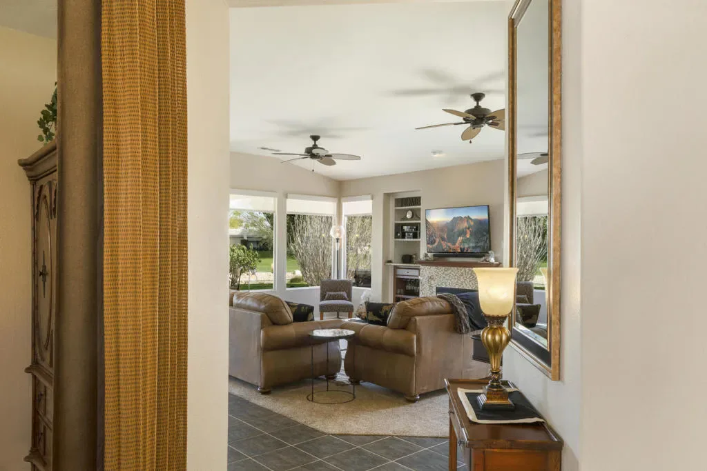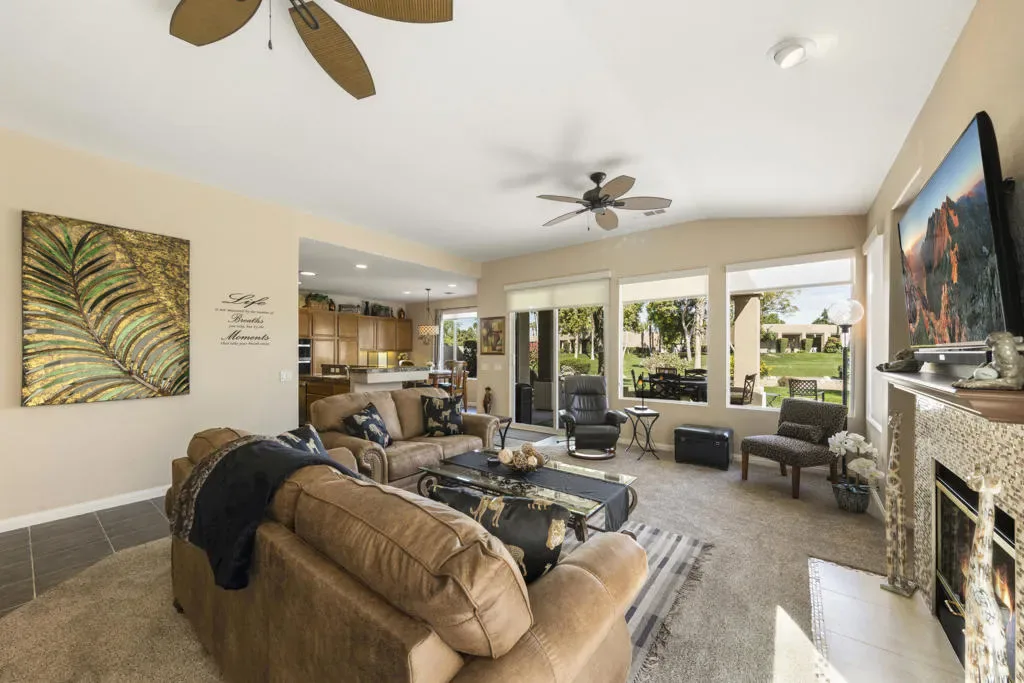 Marketing Remarks: If you are looking for the perfect home that has it all, then look no longer. Featuring a Pebble Beach Model home Turnkey Furnished with a Golf Cart on the golf course overlooking the #8 tee box and lake of the Cielo Golf Course. Sit on your spacious patio and watch all the golfers tee off and look at the Beautifull Mountains and Lakes This 2-bedroom 2.25 bath home with a den/office/or 3rd bedroom featuring an open floor plan with natural lighting illuminating throughout the home. The Kitchen features granite countertops, a center island with newer stainless-steel appliances. The Desert Princess CC offers a 27-hole PGA championship golf course, beautifully maintained open year-round (except for overseeding). Member golf rates are some of the lowest in the valley. HOA includes social membership to the very active golf club, and cable internet including HBO and Showtime. Features 34 swimming pools and spas. Some of the amenities include bocce ball and 12 pickleball courts, EV charging station, tennis courts, and fitness center. Desert Princess Country Club is conveniently located just minutes away from Palm Springs International Airport, Downtown Palm Springs, restaurants, shopping, nightlife and hiking. Several casinos are nearby. Be sure to see the restaurant, clubhouse, tennis courts, and fitness center. Monthly ground rent is $114.23 per month. Grounds are maintained to your doorstep (you pay only for inside water).