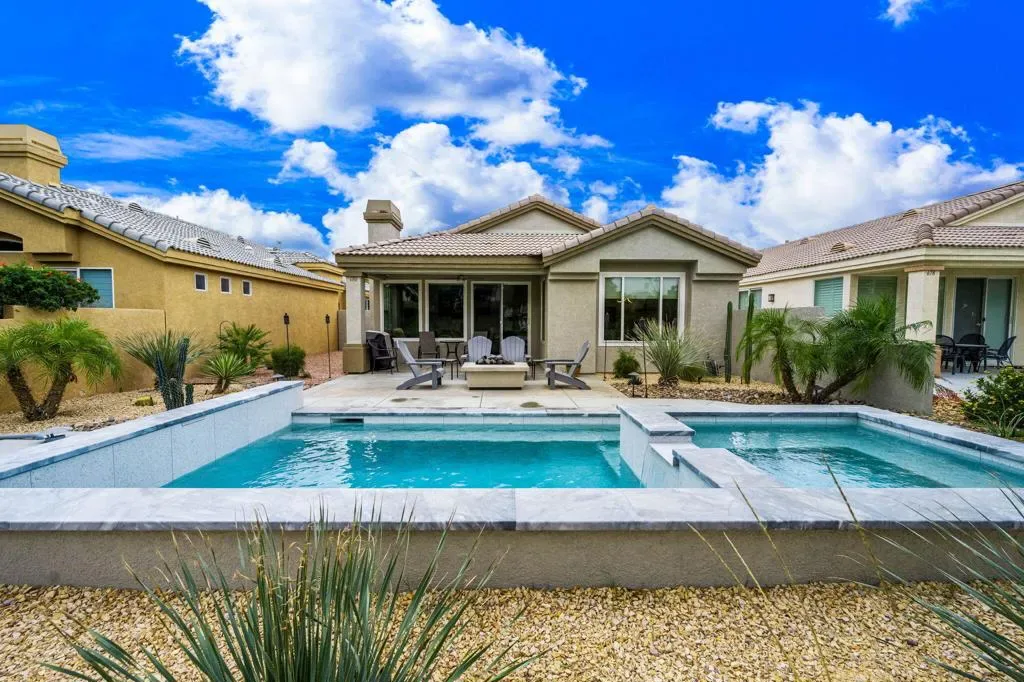 Prepare to be impressed! NEW pool, completely remodeled, and paid solar–what more could you ask for? Enjoy the benefits of paid solar with little to no electric bills. This stunning, one-of-a-kind 2-bedroom home with a bonus office/den has been thoughtfully upgraded throughout. Over $300,000 in remodel/upgrades including new windows, a high-efficiency heat pump system (just 3 months old), and a mini-split AC in the great room for added comfort. From the moment you enter, you’ll be drawn to the fabulous pool and deck area with firepit–perfect for relaxing or entertaining. The completely remodeled kitchen and baths showcase top-quality finishes, including quartz countertops, a beautiful backsplash, and all new appliances. The open great room is ideal for gatherings and everyday living. New desert landscaping in both the front and back enhances the beauty and privacy of this luxury villa, while the recently painted exterior adds to its fresh, modern appeal. This is a rare opportunity to own a truly remarkable home–just imagine yourself enjoying the poolside lifestyle in this exceptional property!. Homes exterior recently painted. Make this gorgeous home yours today! Land Lease expires 2069. Monthly Ground Rent $106.11.HOA dues include: 2 DVR or HD cable boxes and service, high-speed internet, grounds maintained to your door by HOA maintenance crews, outside pest control when requested, and outside water. Gated community with 24-hour guarded gate access and regular patrols for added safety and security, health and fitness center membership, tennis, bocce ball, and pickleball courts. Discounts and preferred tee-times for owners at the Desert Princess 27-hole PGA Championship golf course, no initiation fees, rated among the best in the valley by Golf Digest. Don’t miss the opportunity to live in luxury with every modern comfort at your fingertips. 34 pools and spas on property. A true country club!