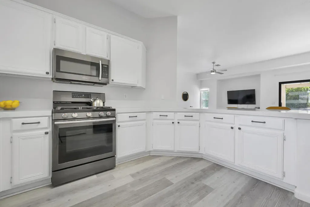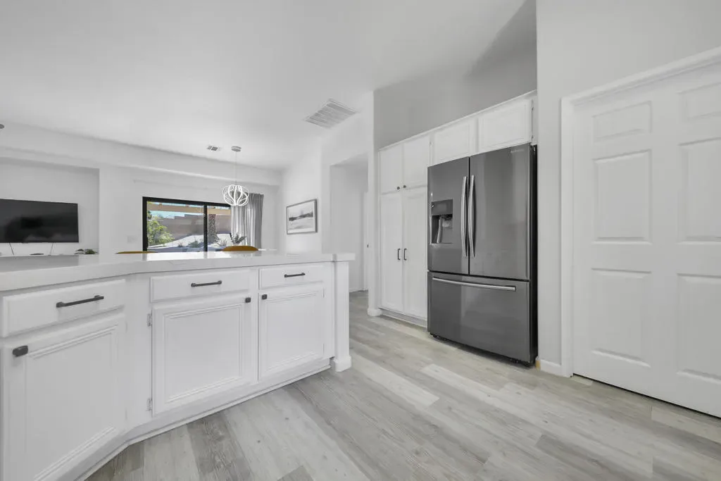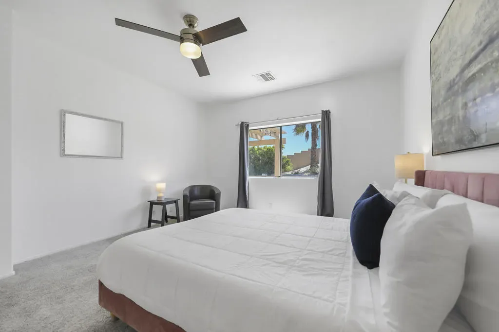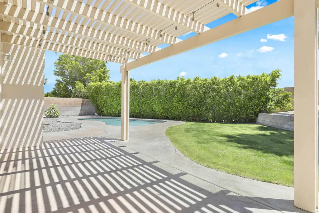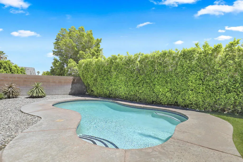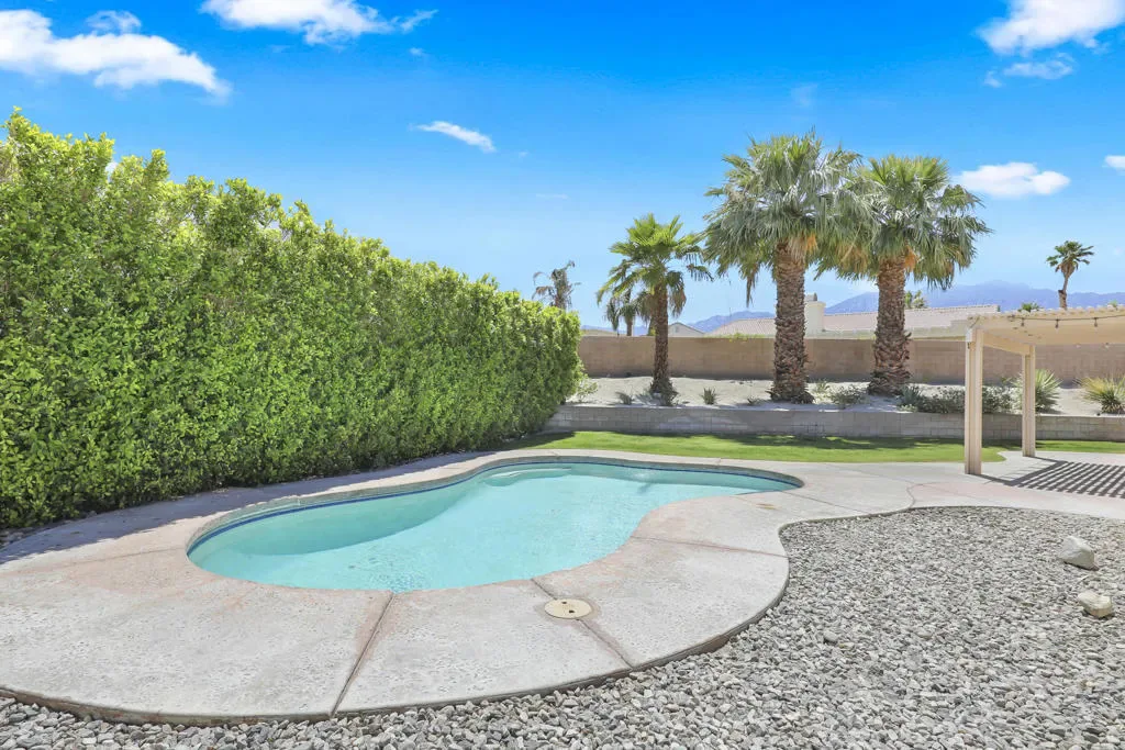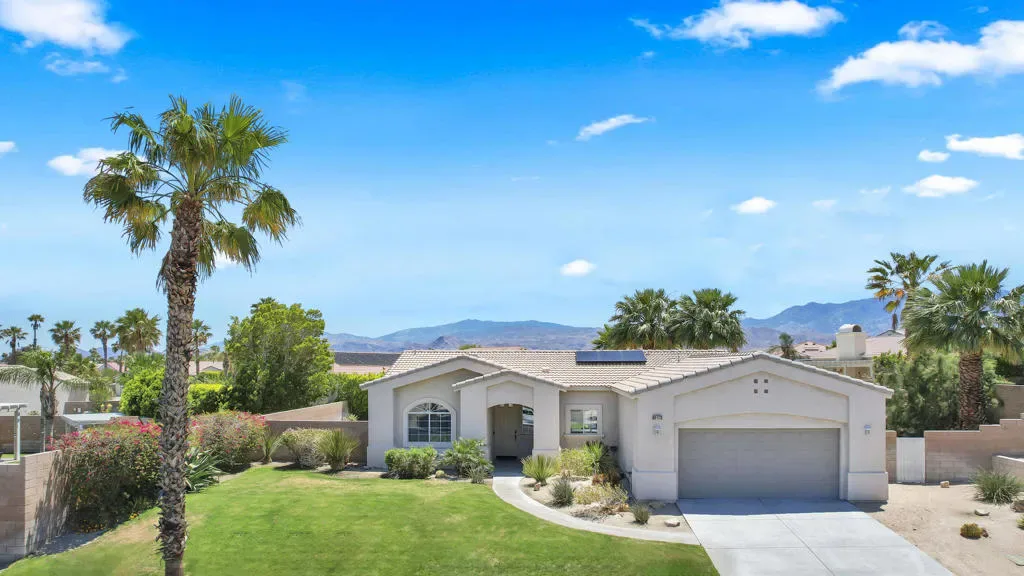 Tucked into the La Pasada neighborhood of Cathedral City, this stylish desert retreat offers the perfect balance of comfort and privacy. Set back from the street, the home sits on an oversized 10,890 square foot lot, featuring 3 bedrooms, 2 bathrooms, separate laundry room, and a light-bright, open-concept layout that maximizes space, and indoor-outdoor flow. At the heart of the home, a renovated kitchen with a breakfast bar, sleek quartz countertops, newer stainless steel appliances, and a seamless connection to the main living and dining areas, all under soaring ceilings that add volume and airiness. The primary suite is a true sanctuary, featuring an updated spa-like bathroom with a soaking tub, walk-in shower, and a generously sized walk-in closet. In addition there are two expansive guest rooms that have high ceilings, fans and large windows. Step into your private south facing backyard paradise, complete with a heated pool, outdoor shower, and stunning mountain views. This home has an impressive 29 solar panel system for energy efficiency installed 5 years ago, buyer to assume lease. Washer, Dryer, kitchen Refrigerator and Rain Soft ECS Water Filtration System included with purchase. Whether you’re looking for a full-time residence, seasonal escape, or investment property, this home checks all the boxes with smart upgrades… Close to shopping, dining and I-10 access.