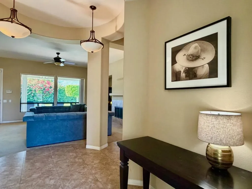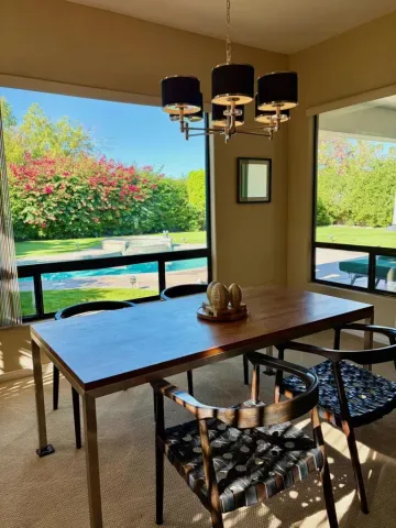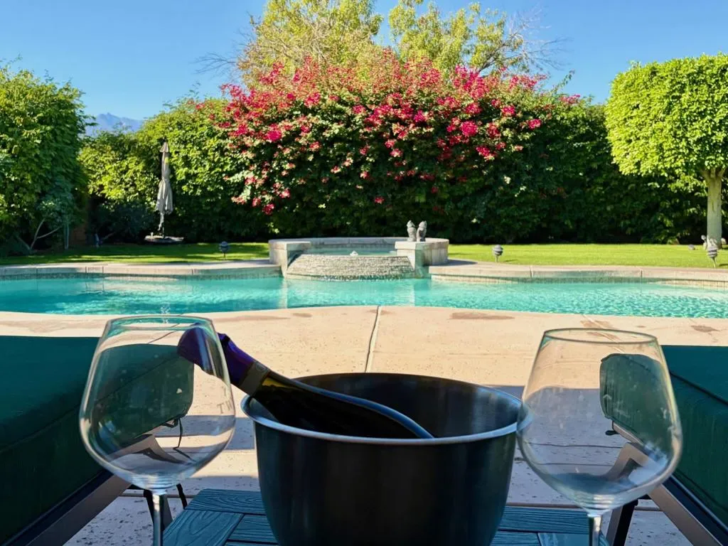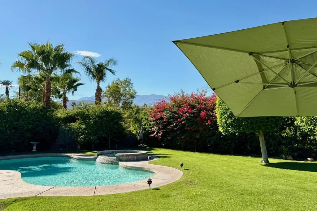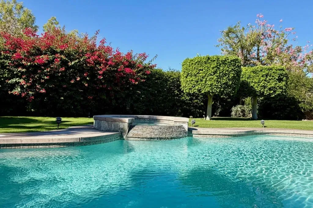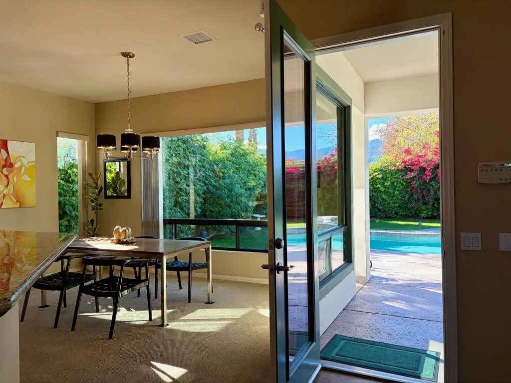 Price adjustment! Enjoy the serenity of a small, gated community – conveniently located between Rancho Mirage and Palm Springs. This freshly painted, 2463 square foot home is a spa oasis: lush, private landscaping, a heated pool/spa, and beautiful views of the Santa Rosa & San Jacinto mountains – all on fee-simple land. You enter the home through a courtyard into the welcoming entry rotunda. Ahead will be the large great room with high ceilings, gas fireplace and beautiful views of the pool, landscape and mountains. To the left of the great room is the large kitchen with granite counters and stainless (gas) appliances — and an inviting dining area. Heading through the kitchen toward the 2-car garage, you’ll find the laundry room (with washer/dryer/sink) and a convenient office area. Heading from the kitchen toward the rotunda, you’ll pass the walk-in kitchen pantry and half bath before reaching the first of three bedrooms. This bedroom/den features double doors and a 3/4 en-suite bathroom. Continuing down the hallway — to the right is very large second bedroom with full en-suite bathroom and a separate dressing/sitting area. Down the hall is the primary bedroom – a serene setting with gas fireplace, access to the covered patio and pool, beautiful views of San Jacinto Mountains and a large en-suite bathroom with soaking tub, shower stall, double vanities and a large walk-in closet. This home features a leased Solar panel system, and a recently installed HVAC system (2023) and water heater (2024).