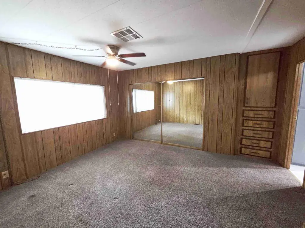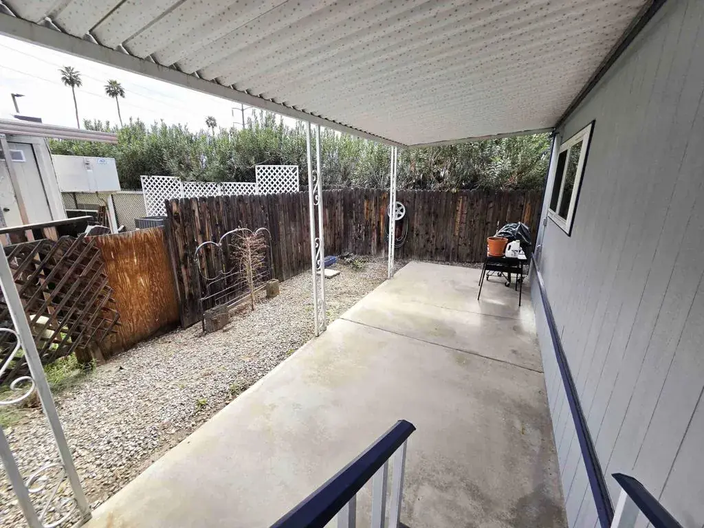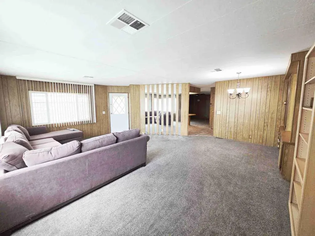 This 1976 Baron home, a 1,344-square-foot, two-bedroom, two-bath residence, is located on a perimeter lot in the Royal Palms Manufactured Home Community, a 55-or-better development. The entrance to the home is via the east-facing, covered deck, which opens into the living room, which spans the 24-foot width of the house. Two large north-facing picture windows let in ample light, brightening the space. A dining room, complete with a built-in hutch, is open to the living area. The circular kitchen, with a gas cooktop, a gas wall oven, a dishwasher, and a newer stainless-steel refrigerator, has a convenient layout and the original butcher-block-style counters. Sliding glass doors in the family room also lead to the east-facing deck and the south-facing concrete slab patio. The guest bedroom is currently outfitted with a queen-size adjustable bed. Its ensuite three-quarter bath is also accessible from the laundry room. At the rear of the house is the primary bedroom, an impressively sized space complete with a remodeled three-quarter bath. The windows and sliding glass doors are newer and dual-pane. Space rent for 362 Buffalo is $893 per month, and park approval is required. Call today for your private showing.
