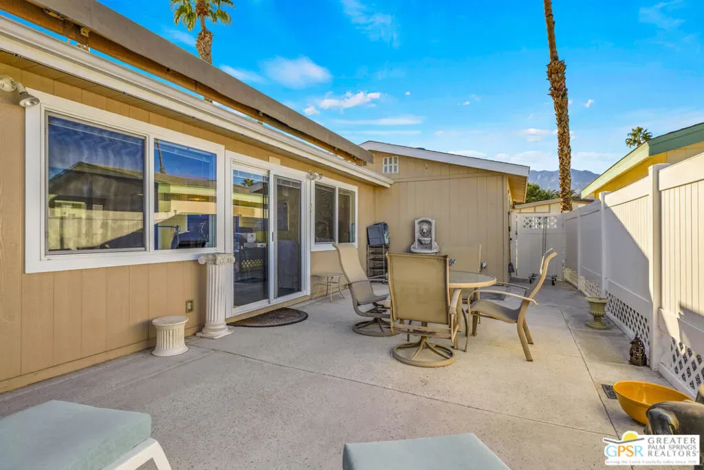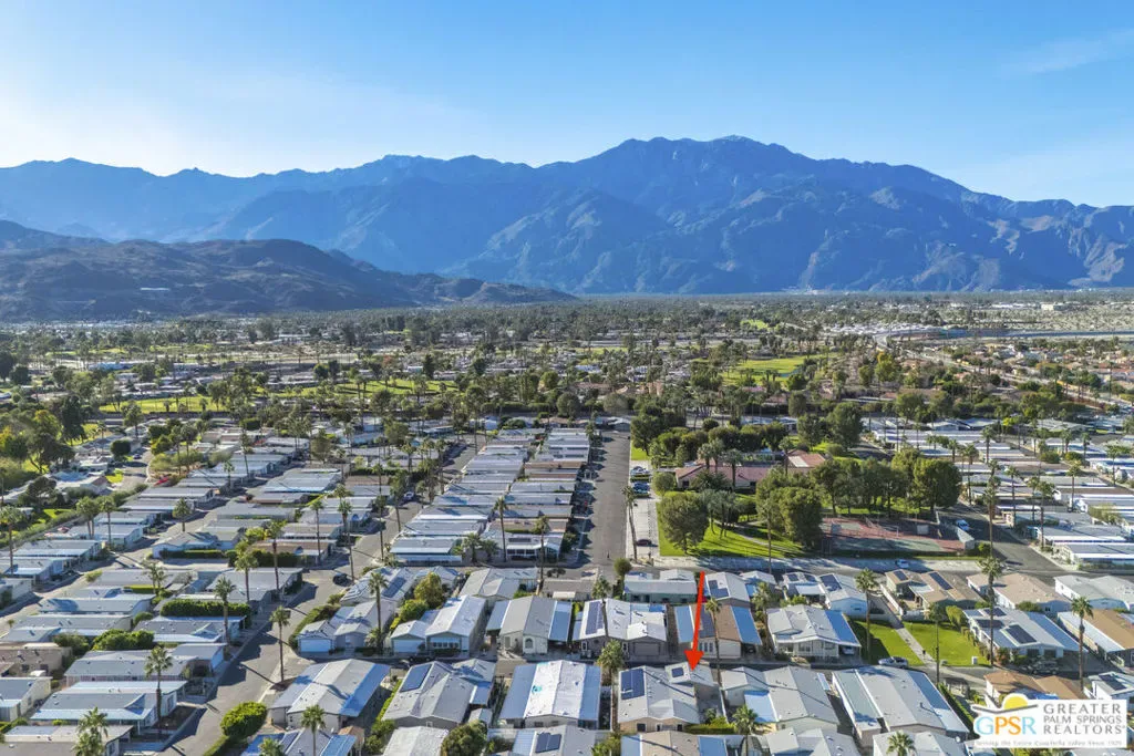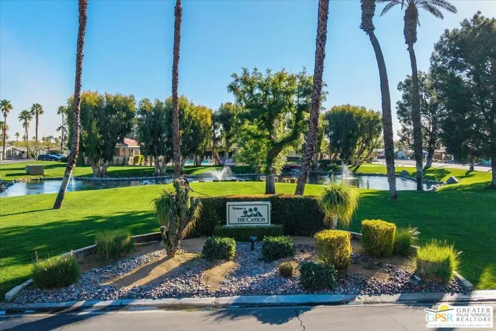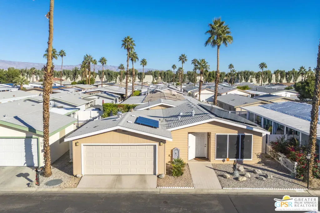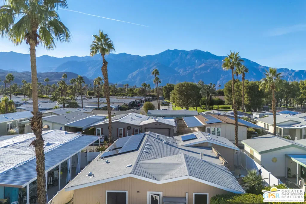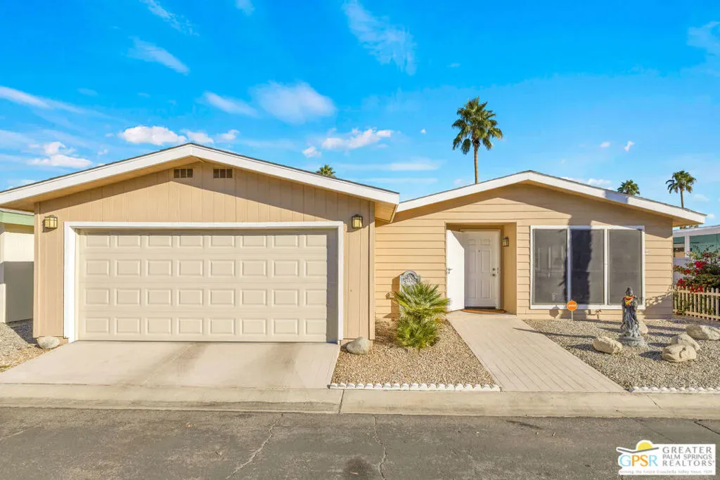 BACK ON THE MARKET: Location + Garage + Solar = A fantastic opportunity at The Canyon, one of the area’s most desirable mobile home communities. This spacious 2 Bed / 2 Bath home with a bonus sunroom offers 1,558 sq. ft. of comfortable, well-maintained living space. With drywall throughout, recent updates include: new water heater, garage door, and garage insulation (2024) – new kitchen appliances; gas range, refrigerator, microwave, and dishwasher (2020) – new AC coil and furnace (2021) – new AC/heater mini-split in sunroom, new electrical panel, and patio misting system (2019). From the cozy living room, take in the mountain views and gorgeous desert sunsets. The kitchen features granite tile countertops and custom cabinetry. The large primary bedroom with ensuite bath creates a private retreat within the home. The primary and guest baths both offer granite countertops and custom cabinetry, with the primary bath featuring dual sinks. The bonus sunroom offers versatile possibilities and features a gas fireplace. Energy efficiency is a highlight with 20 leased solar panels installed in 2020 by Sunrun, and a vented evaporative cooler, helping keep energy bills low. Enjoy the convenience of the laundry room adjacent to the attached two-car garage. Outside, the private, fenced backyard includes an electric patio awning and two mature citrus trees. Community amenities at The Canyon include two sparkling heated pools and spas, tennis & pickleball courts, a welcoming clubhouse with library/card room, billiard/game room, fitness room, crafts room, indoor shuffleboard, and a beautiful multi-function room with a stage and professional-style kitchen, ideal for events. This home is conveniently located on a quiet street, just one block away from the clubhouse. The Canyon is a gated, well-maintained 55+ community. Buyers must obtain park approval, which requires a minimum 750 credit score and proof of income three times the monthly space rent of $995. One pet up to 20 lbs is permitted. Buyers and their agents to verify current space rent and square footage. With PSP Airport, shopping, and restaurants just minutes away, this home is perfect for year-round living or as a vacation retreat.
