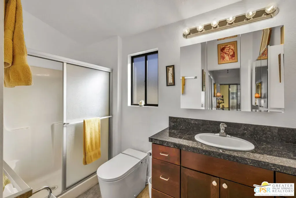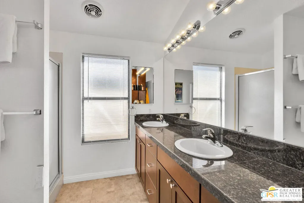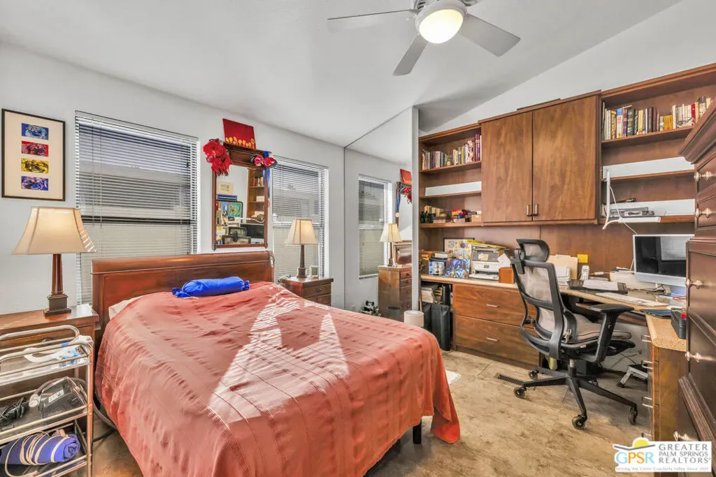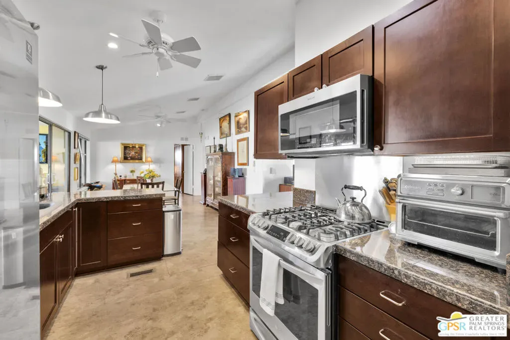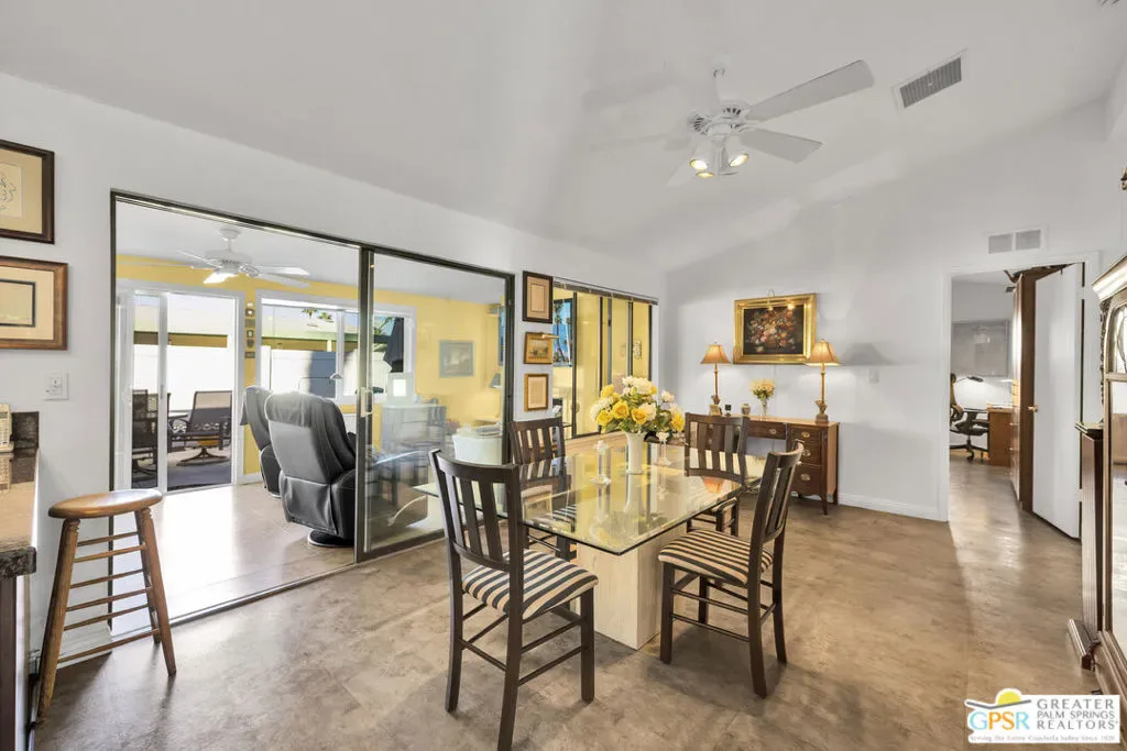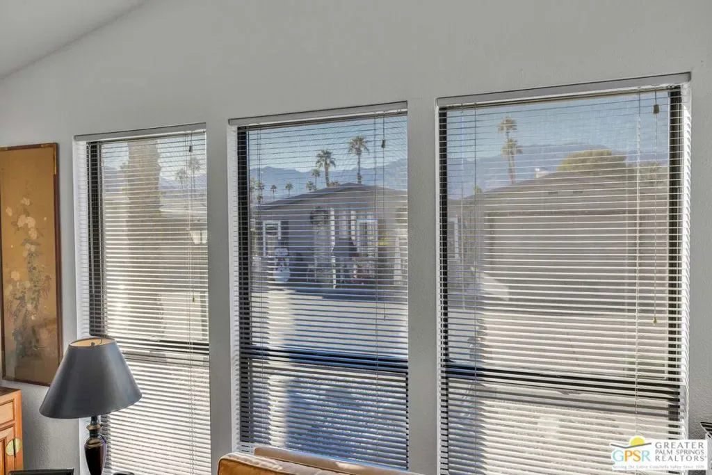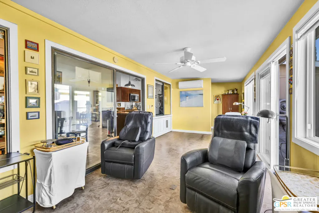 BACK ON THE MARKET: Location + Garage + Solar = A fantastic opportunity at The Canyon, one of the area’s most desirable mobile home communities. This spacious 2 Bed / 2 Bath home with a bonus sunroom offers 1,558 sq. ft. of comfortable, well-maintained living space. With drywall throughout, recent updates include: new water heater, garage door, and garage insulation (2024) – new kitchen appliances; gas range, refrigerator, microwave, and dishwasher (2020) – new AC coil and furnace (2021) – new AC/heater mini-split in sunroom, new electrical panel, and patio misting system (2019). From the cozy living room, take in the mountain views and gorgeous desert sunsets. The kitchen features granite tile countertops and custom cabinetry. The large primary bedroom with ensuite bath creates a private retreat within the home. The primary and guest baths both offer granite countertops and custom cabinetry, with the primary bath featuring dual sinks. The bonus sunroom offers versatile possibilities and features a gas fireplace. Energy efficiency is a highlight with 20 leased solar panels installed in 2020 by Sunrun, and a vented evaporative cooler, helping keep energy bills low. Enjoy the convenience of the laundry room adjacent to the attached two-car garage. Outside, the private, fenced backyard includes an electric patio awning and two mature citrus trees. Community amenities at The Canyon include two sparkling heated pools and spas, tennis & pickleball courts, a welcoming clubhouse with library/card room, billiard/game room, fitness room, crafts room, indoor shuffleboard, and a beautiful multi-function room with a stage and professional-style kitchen, ideal for events. This home is conveniently located on a quiet street, just one block away from the clubhouse. The Canyon is a gated, well-maintained 55+ community. Buyers must obtain park approval, which requires a minimum 750 credit score and proof of income three times the monthly space rent of $995. One pet up to 20 lbs is permitted. Buyers and their agents to verify current space rent and square footage. With PSP Airport, shopping, and restaurants just minutes away, this home is perfect for year-round living or as a vacation retreat.