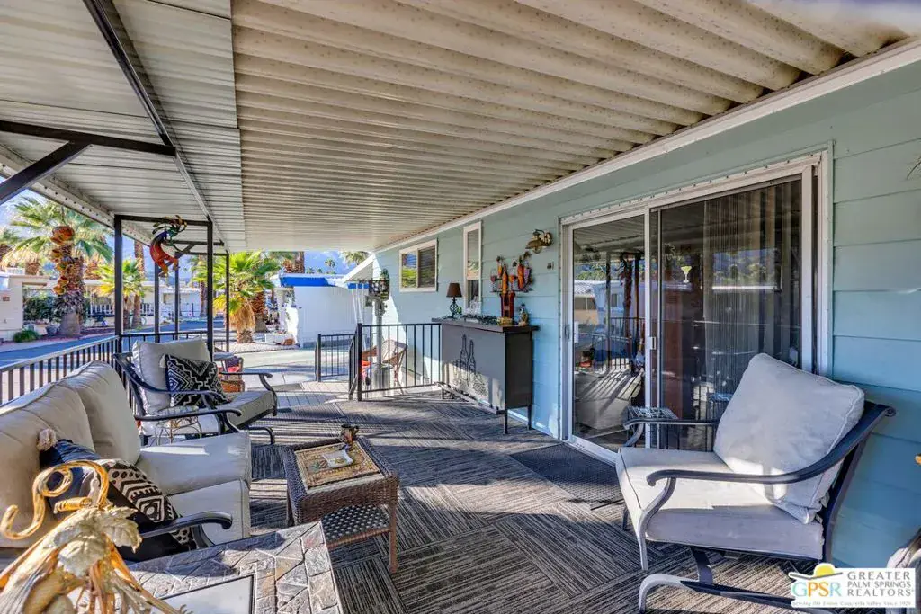 Stylish Traditional Home in TramView Mobile Home Park. Tucked away on one of the most desirable streets in TramView Mobile Home Park, this upgraded and well-kept 2-bedroom, 2-bath home offers a serene desert retreat with exceptional charm. Located toward the quiet back end of the community, the property enjoys peaceful surroundings, beautifully maintained landscaping, and paved walkways all framed by sweeping mountain views and vistas overlooking Cathedral Canyon Country Club. Inside, the home features updated bathrooms and a refreshed kitchen, complemented by laminated hardwood floors that add warmth and modern appeal. The standout feature is the expansive two-level, covered outdoor deck, an ideal space for relaxing, dining, or entertaining year-round. Comfort is ensured with central air conditioning and thoughtful amenities throughout, making this an excellent choice for full-time living or a perfect desert getaway. Residents enjoy access to the community clubhouse, ground-level pool and spa, shuffleboard courts, all included in the HOA. Please note that all future residents must be approved by park management. The large clubhouse is designed for entertaining, complete with two full kitchens, a piano, pool table, and multiple card tables for owners’ use. Ideally located near Target, Trader Joe’s, and Starbucks, with Palm Springs International Airport and Downtown Palm Springs just a short drive away, offering effortless access to shopping, dining, and travel. A clean, contemporary home in a peaceful setting this is low-maintenance desert living at its best. PLEASE NOTE: This community is undergoing a conversion of gas and electric utility so that each home will be connected directly to SoCal Electric and SC Gas which will greatly improve the living experience here at TramView. The Sellers are offering an incentive of 12 months of paid lease payments to mitigate any inconvenience during the construction. All of the amenities with none of the cost for one year! This unit should not be missed! Call LA1 for an appointment to view.