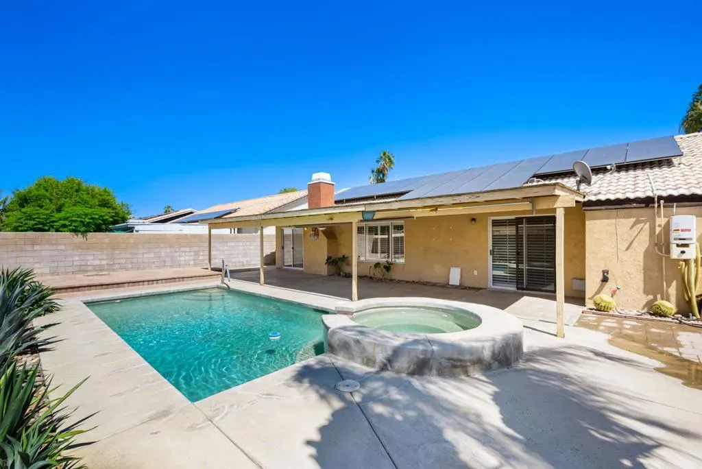 Welcome to this well-appointed 3-bedroom, 2-bath home offering 1,509 square feet of comfortable living in Cathedral City. Vaulted ceilings create an open, airy feel, while tile flooring and classic window shutters add both style and functionality throughout.The kitchen features quartz countertops and a newer stove, seamlessly connecting to the main living area anchored by a cozy fireplace. The primary suite offers a recently updated bathroom with clean, modern finishes.Designed with both efficiency and outdoor living in mind, the home includes owned solar with 39 panels, a soft water system and a salt water pool. A covered patio extends the living space outdoors, creating an ideal setting for relaxing or entertaining.