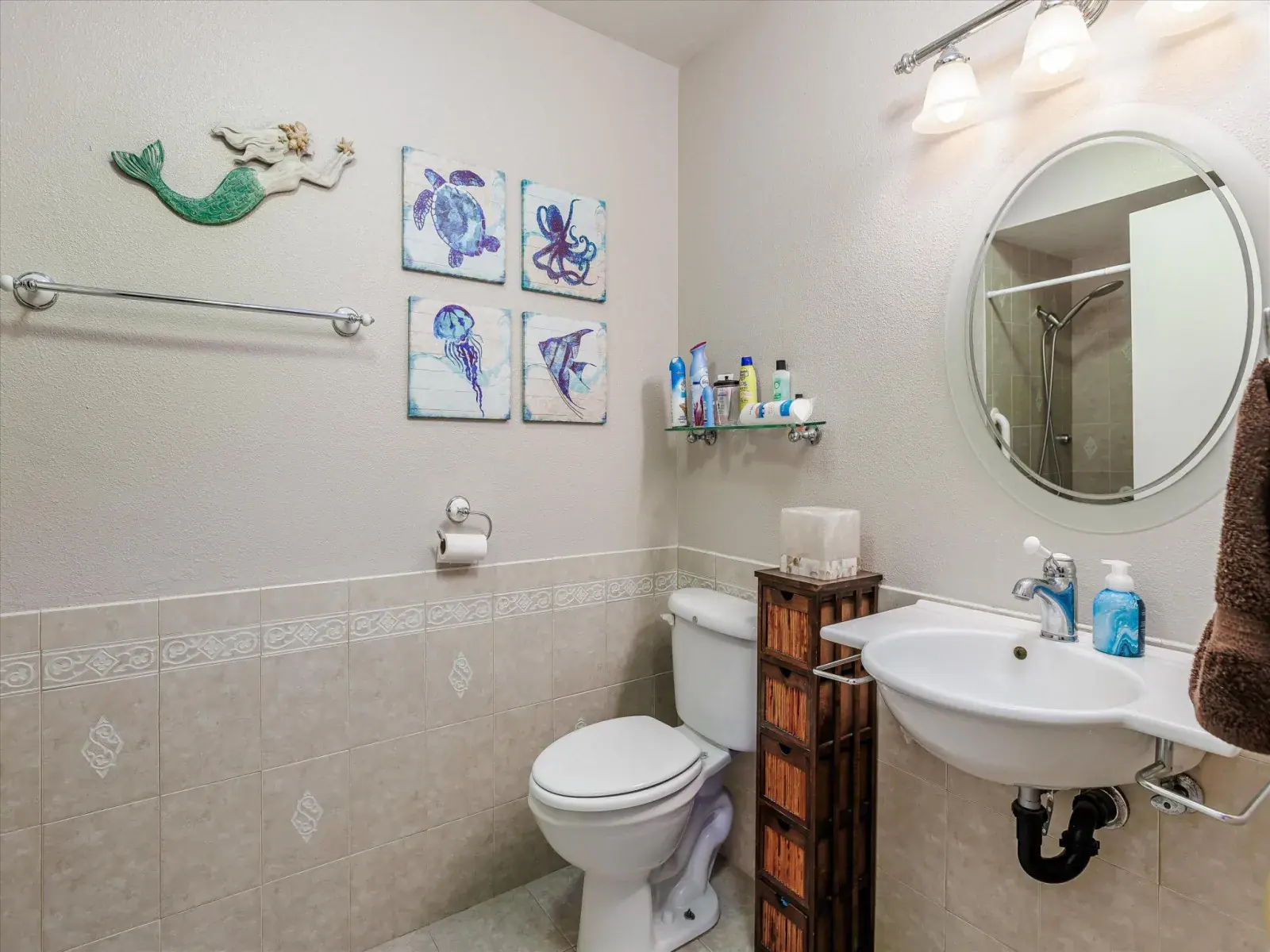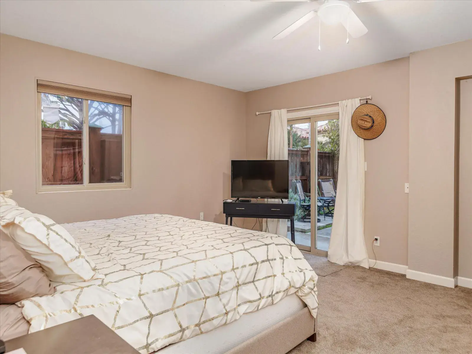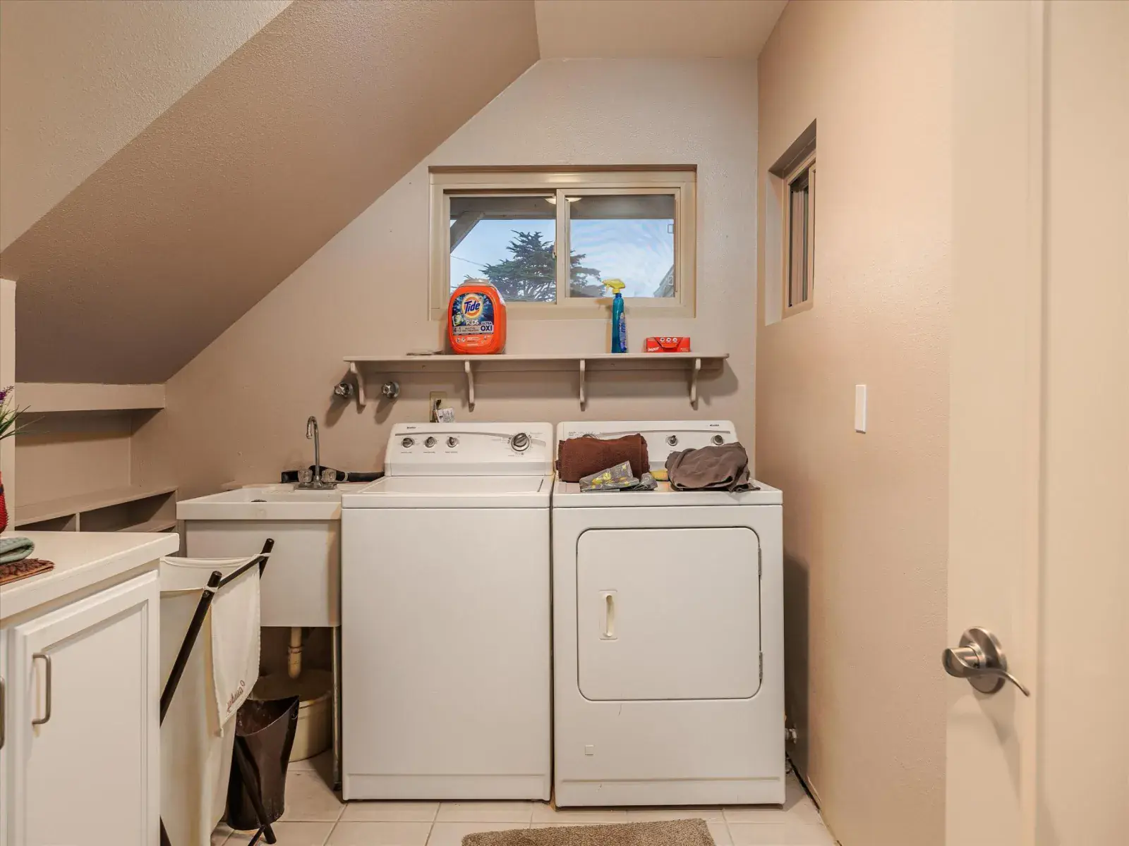 The master suite is a serene retreat, complete with a walk-in closet, ample storage, and a full bathroom—all complemented by the soothing sound of the waves. The main level also includes an office, a large family room with courtyard access, and a fully equipped laundry room for added convenience.
