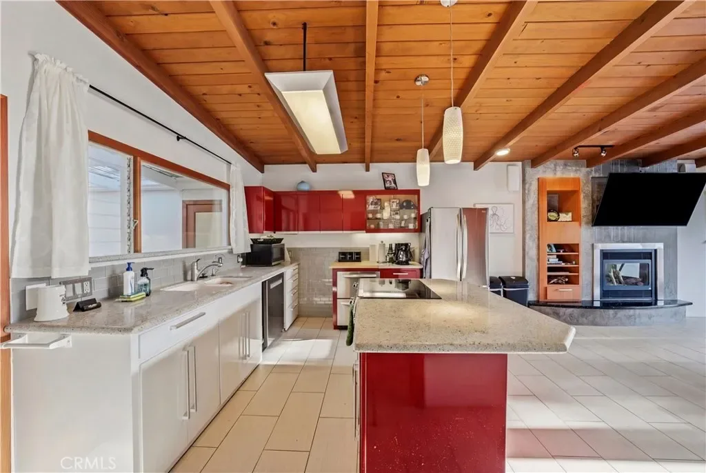 The main residence offers a modern four-bedroom, two-bathroom layout that is currently separated into upper and lower living areas, each with its own kitchen and private access, connected by an interior door when desired. This flexible design allows the home to function as a single expansive coastal residence or as two independent living spaces, ideal for maximizing income potential or accommodating extended family. The interiors are highlighted by fireplaces, sweeping ocean views, and an open, light-filled layout designed for both everyday comfort and refined coastal entertaining.