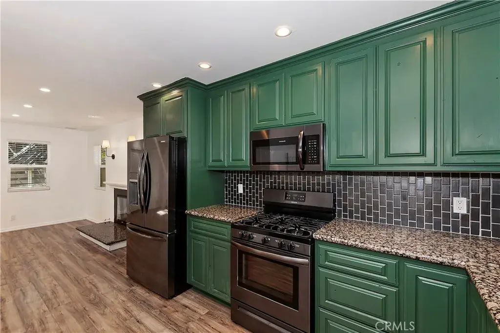 The kitchen is well equipped with a lovely shade of hunter green cabinets. The stainless steel appliances come with the sale.