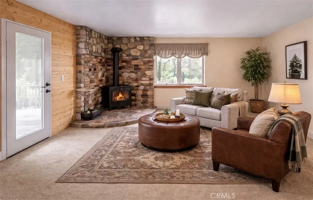 Inside, enjoy a warm and inviting layout featuring a rock fireplace, spacious living areas, and large decks ideal for relaxing or entertaining among the trees. The main level offers a welcoming living room, kitchen with quartz countertops, island with breakfast bar, walk-in pantry, and direct access to the covered wraparound deck.