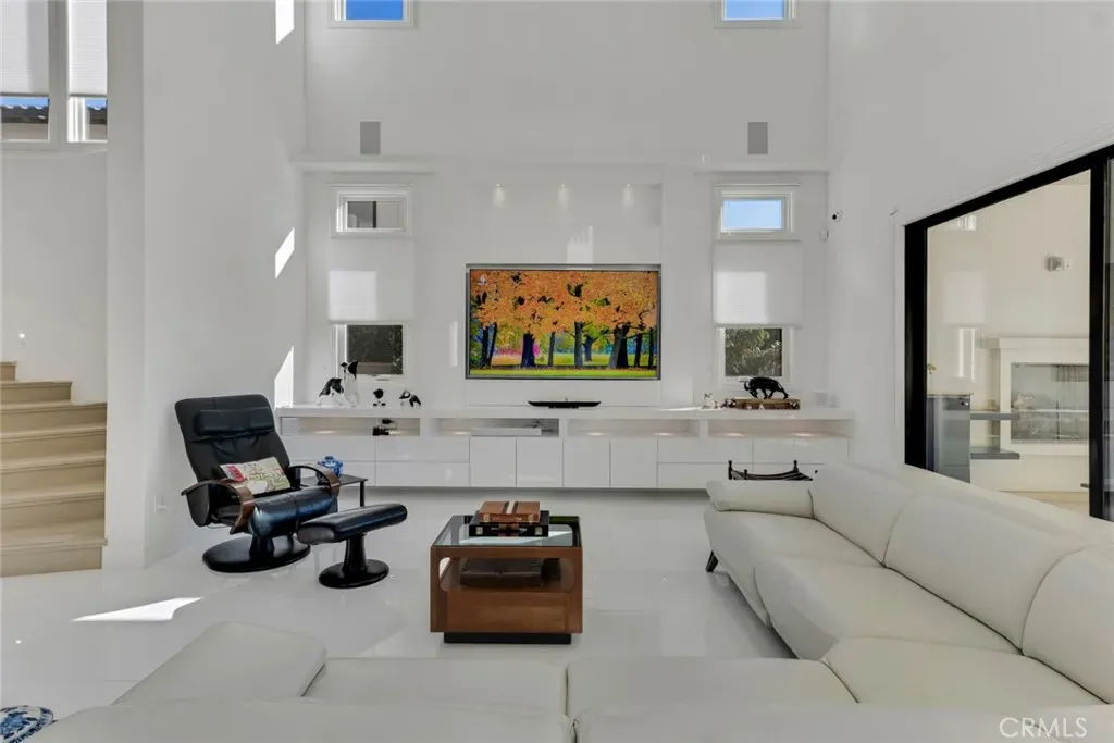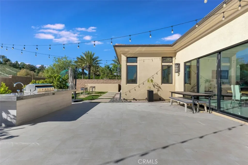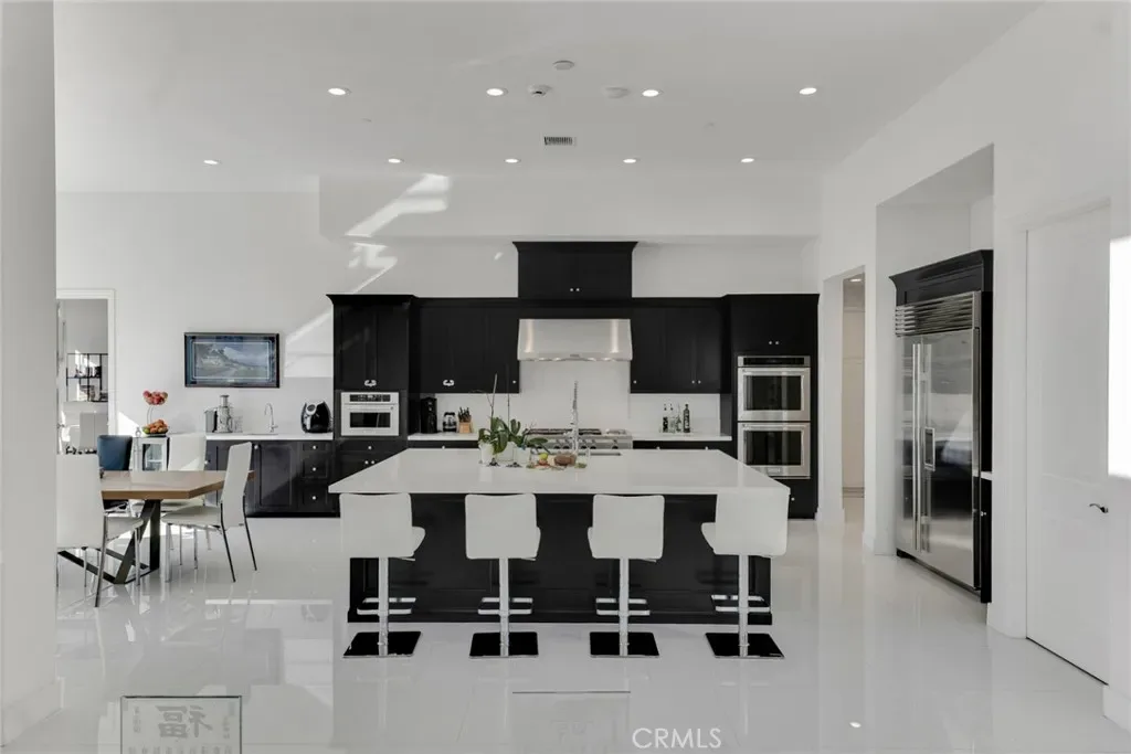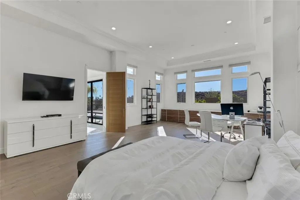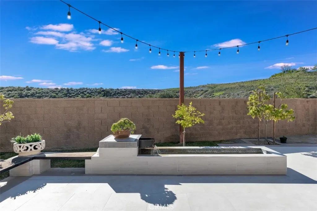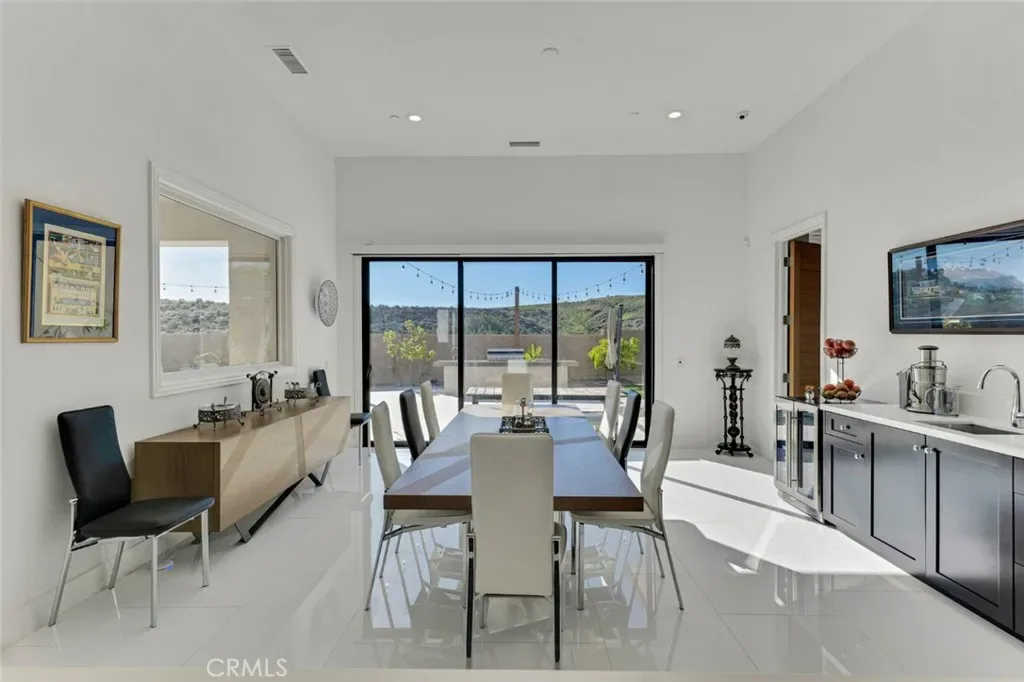 Set within the prestigious gated community of Canyon Oaks in Chatsworth, this stately contemporary estate offers approximately 5,587 square feet of refined living on an expansive lot, partially comprised of protected natural lands, with sweeping views. Designed to impress, the home delivers a clean, modern aesthetic highlighted by soaring ceilings, abundant natural light, recessed lighting throughout, and an open, flowing floorplan ideal for both everyday living and entertaining on a grand scale. A dramatic two-story formal entry leads to an awe-inspiring living room with clerestory windows, custom built-ins, and oversized sliding glass doors that dissolve the boundary between indoors and out. The showpiece kitchen features a striking black-and-white palette, white Corian countertops, automatic blinds, commercial-grade six-burner range with grill, Sub-Zero refrigerator, double ovens, walk-in pantry, and an enormous center island, leading seamlessly to the informal dining area and wet bar, all positioned to capture stunning views. A formal dining room with tray ceiling and built-in buffet adds elegance and storage space. The downstairs primary suite is a luxurious retreat with tray ceiling, crown molding, spa-caliber en-suite bath complete with double sinks, a vanity area, soaking tub, oversized multi-head shower, and expansive walk-in closet. Additional highlights include a downstairs en-suite guest bedroom, a stylish home office with glass barn door, dedicated laundry room, and convenient powder bath. A sweeping curved staircase leads to a spacious loft with wet bar and wine fridge overlooking the living space below. Upstairs, three additional en-suite bedrooms provide comfort and privacy. Designed for true indoor-outdoor living, the Arizona room and patios feature stone tile flooring, fireplace, ceiling fans, built-in seating, outdoor kitchen, water feature, grassy areas, and fruit trees, creating a resort-inspired space for you to enjoy. Additional features include Solar, multi-zone air conditioning, and high-end finishes throughout. Well situated near shopping, dining, entertainment, including the Vinyard, and major transportation thoroughfares. Don’t miss this exceptional offering in one of Chatsworth’s most exclusive enclaves.