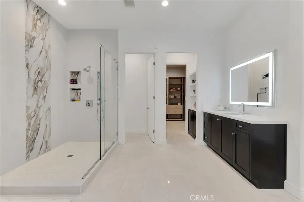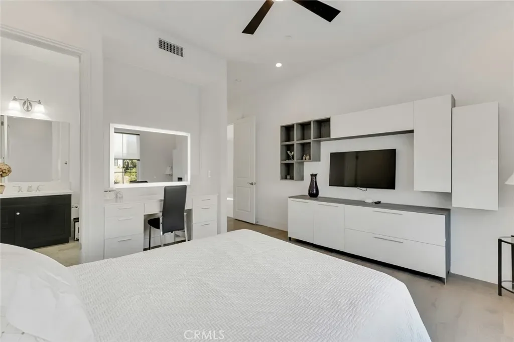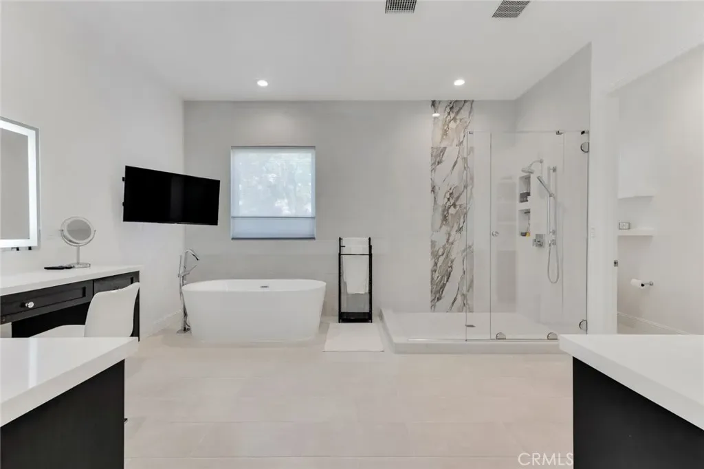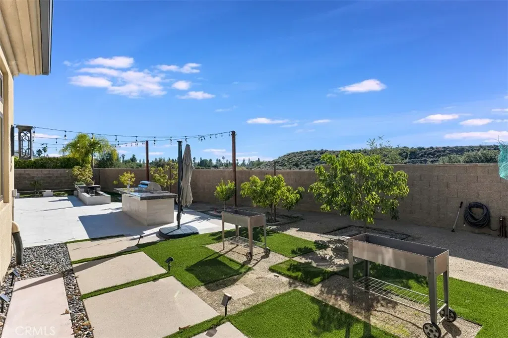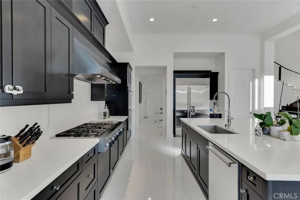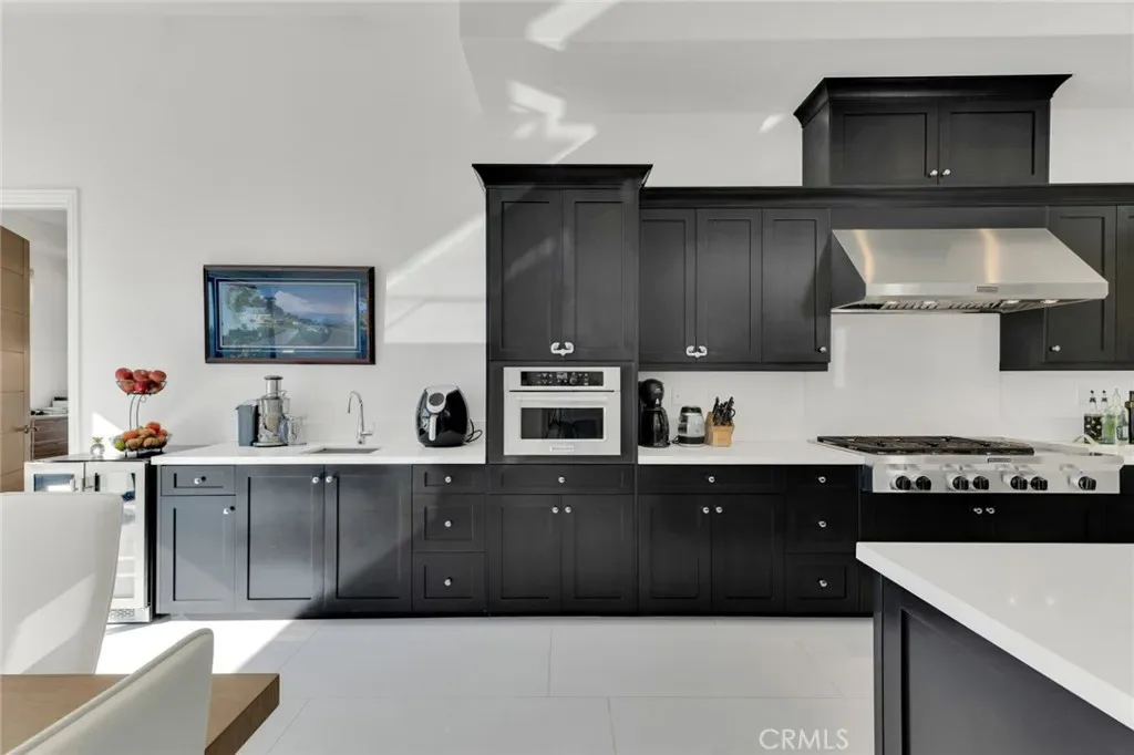 Set within the prestigious gated community of Canyon Oaks in Chatsworth, this stately contemporary estate offers approximately 5,587 square feet of refined living on an expansive lot, partially comprised of protected natural lands, with sweeping views. Designed to impress, the home delivers a clean, modern aesthetic highlighted by soaring ceilings, abundant natural light, recessed lighting throughout, and an open, flowing floorplan ideal for both everyday living and entertaining on a grand scale. A dramatic two-story formal entry leads to an awe-inspiring living room with clerestory windows, custom built-ins, and oversized sliding glass doors that dissolve the boundary between indoors and out. The showpiece kitchen features a striking black-and-white palette, white Corian countertops, automatic blinds, commercial-grade six-burner range with grill, Sub-Zero refrigerator, double ovens, walk-in pantry, and an enormous center island, leading seamlessly to the informal dining area and wet bar, all positioned to capture stunning views. A formal dining room with tray ceiling and built-in buffet adds elegance and storage space. The downstairs primary suite is a luxurious retreat with tray ceiling, crown molding, spa-caliber en-suite bath complete with double sinks, a vanity area, soaking tub, oversized multi-head shower, and expansive walk-in closet. Additional highlights include a downstairs en-suite guest bedroom, a stylish home office with glass barn door, dedicated laundry room, and convenient powder bath. A sweeping curved staircase leads to a spacious loft with wet bar and wine fridge overlooking the living space below. Upstairs, three additional en-suite bedrooms provide comfort and privacy. Designed for true indoor-outdoor living, the Arizona room and patios feature stone tile flooring, fireplace, ceiling fans, built-in seating, outdoor kitchen, water feature, grassy areas, and fruit trees, creating a resort-inspired space for you to enjoy. Additional features include Solar, multi-zone air conditioning, and high-end finishes throughout. Well situated near shopping, dining, entertainment, including the Vinyard, and major transportation thoroughfares. Don’t miss this exceptional offering in one of Chatsworth’s most exclusive enclaves.