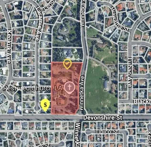 Rare 6 acres for sale in Chatworth. The property is located on the north side of Devonshire Street, west of Winnetka Avenue. Current buildings include church, offices and school. Improvements: 1966 building 6,871sf, 1991 building 2,437sf, 1991 building 6,588sf, coffee bar kiosk 100sf, shed building 260sf, playground with fixed in place canopy, cellular tower at street with supporting equipment, asphalt paved driveway and parking lots. Improvements contain a combined 15,896sf. 80ft of frontage on Devonshire. Cellular antenna (tree-type) and associated ground-based equipment located at the southeastern corner, approx. 1,500sf easement for a 50-year term commencing in 2013. Appraisal available upon request. Perfect for owner user or development. APN: 2707-023-021