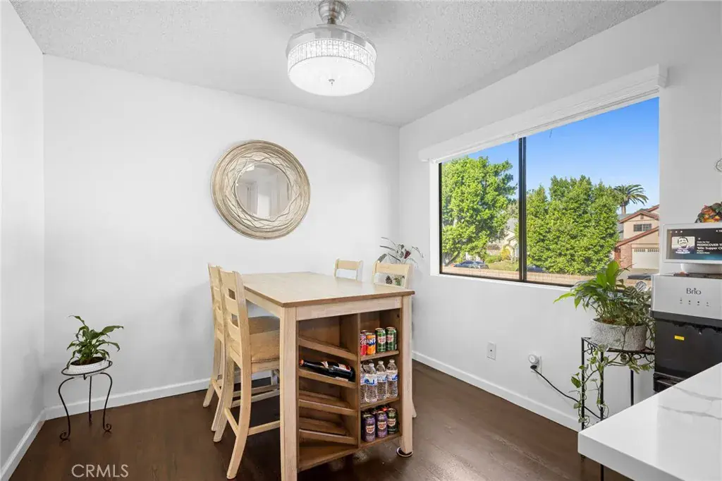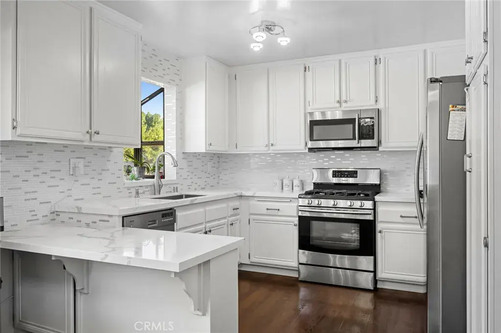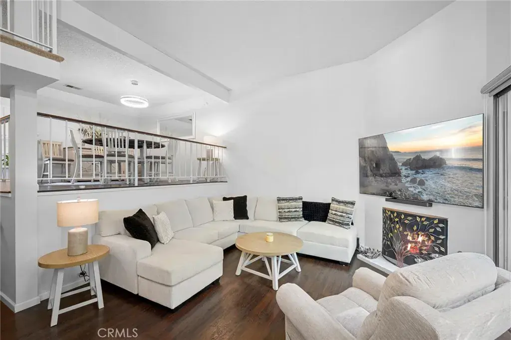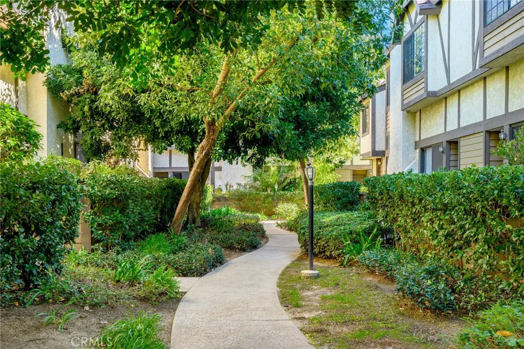 Terrific tri-level townhome located in the desirable Windsor Townhomes community. The thoughtfully designed floor plan features newer wood flooring, high ceilings, and a spacious living room with fireplace that opens to a private front patio. Carpeting in the bedrooms and upper levels provides added comfort. The bright, clean kitchen is appointed with new appliances, quartz countertops, tile backsplash, a breakfast nook, and an adjacent dining area, along with a convenient half bath on the main level. Upstairs are two generously sized primary suites, each offering a private bath, high ceilings, and walk-in closet. Additional highlights include an attached two-car garage with a newly installed garage motor, recently installed washer and dryer, and newly installed central air conditioning and furnace. The unit is situated toward the rear of the complex, offering added privacy, neighborhood views, and ample guest parking. Community amenities include a pool and spa. Conveniently located near shopping, dining, public transportation, Metrolink, charter schools, and major commuter routes. Low HOA dues include insurance, water, sewer, trash, and earthquake insurance.