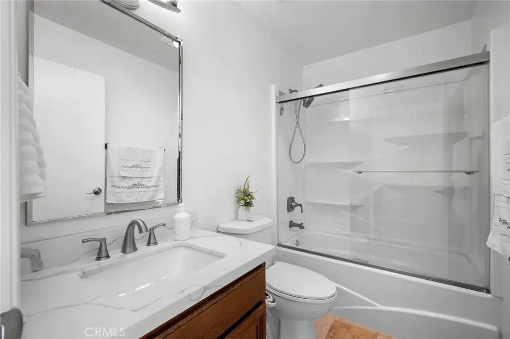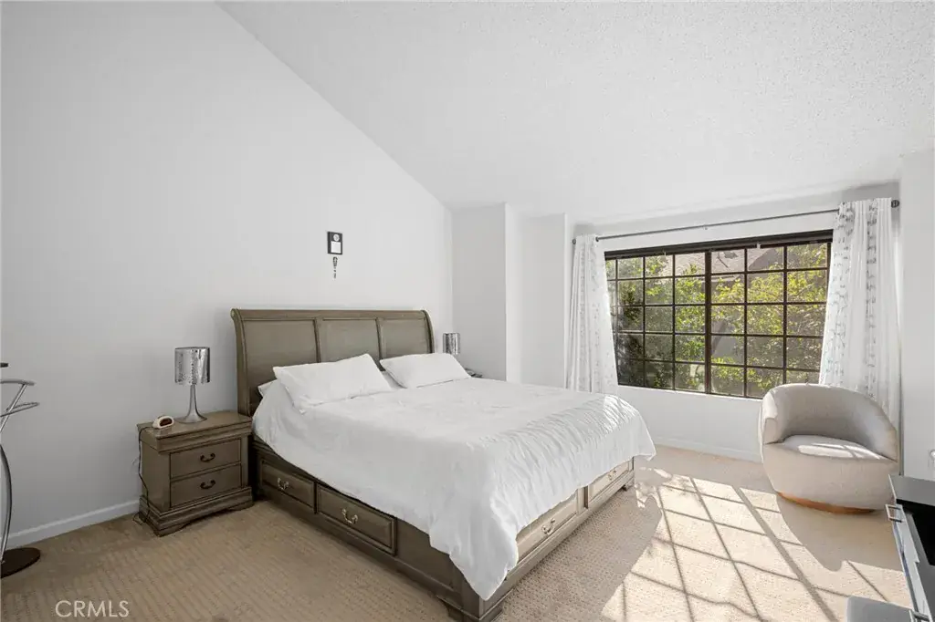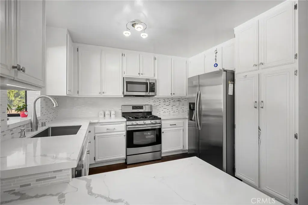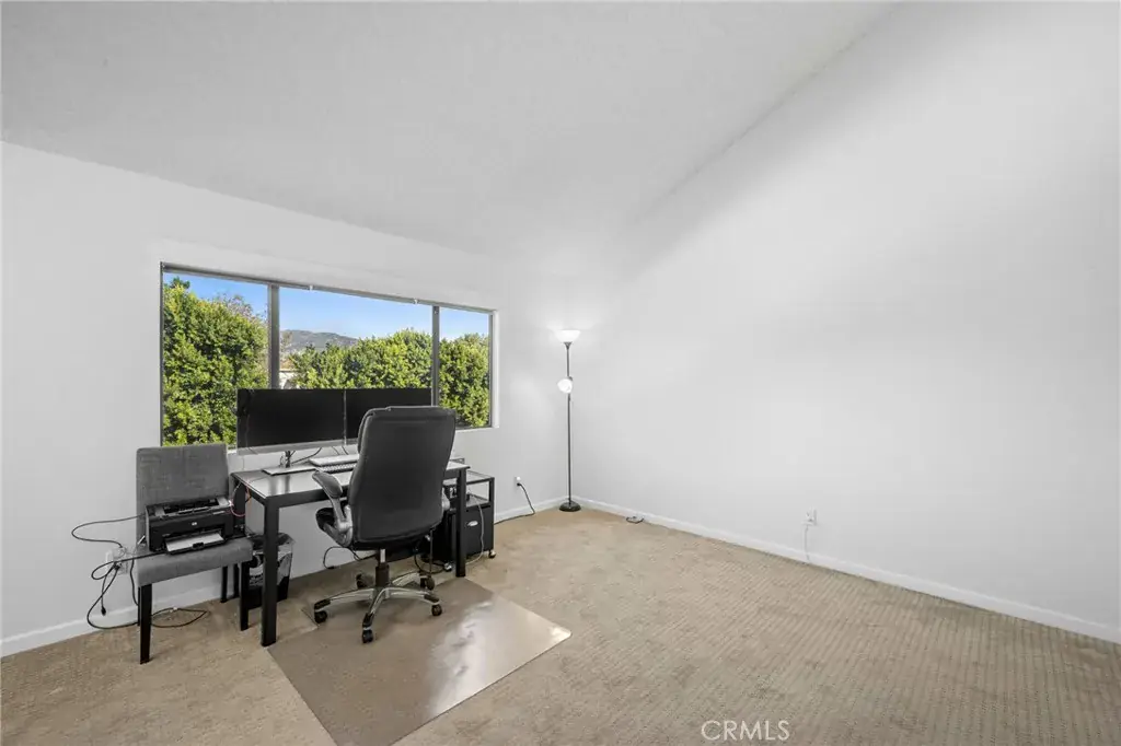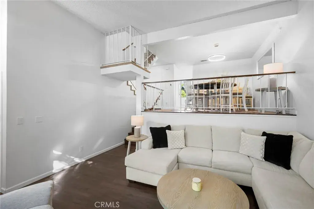 Terrific tri-level townhome located in the desirable Windsor Townhomes community. The thoughtfully designed floor plan features newer wood flooring, high ceilings, and a spacious living room with fireplace that opens to a private front patio. Carpeting in the bedrooms and upper levels provides added comfort. The bright, clean kitchen is appointed with new appliances, quartz countertops, tile backsplash, a breakfast nook, and an adjacent dining area, along with a convenient half bath on the main level. Upstairs are two generously sized primary suites, each offering a private bath, high ceilings, and walk-in closet. Additional highlights include an attached two-car garage with a newly installed garage motor, recently installed washer and dryer, and newly installed central air conditioning and furnace. The unit is situated toward the rear of the complex, offering added privacy, neighborhood views, and ample guest parking. Community amenities include a pool and spa. Conveniently located near shopping, dining, public transportation, Metrolink, charter schools, and major commuter routes. Low HOA dues include insurance, water, sewer, trash, and earthquake insurance.