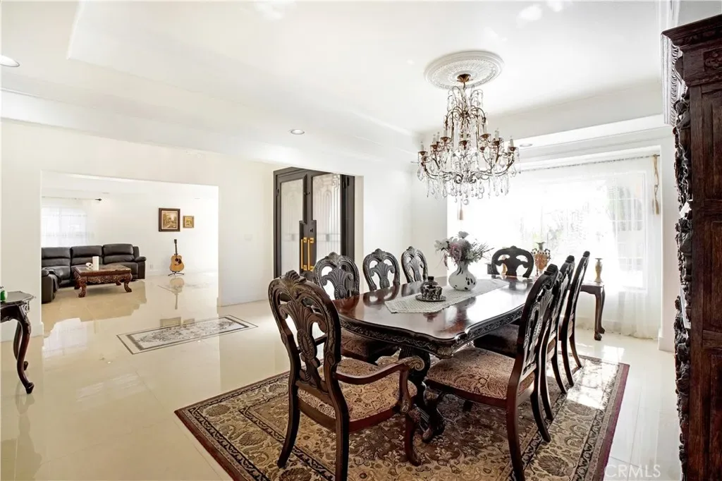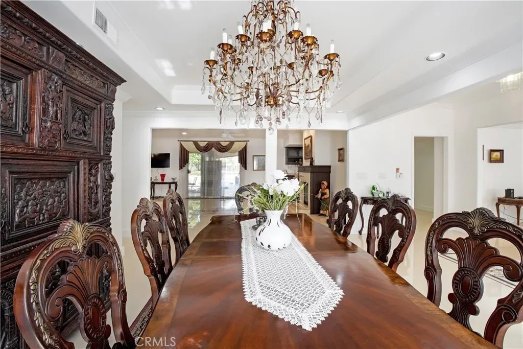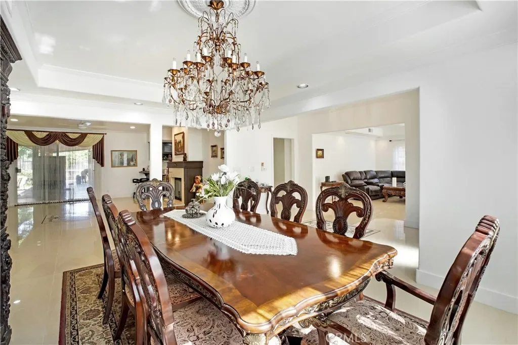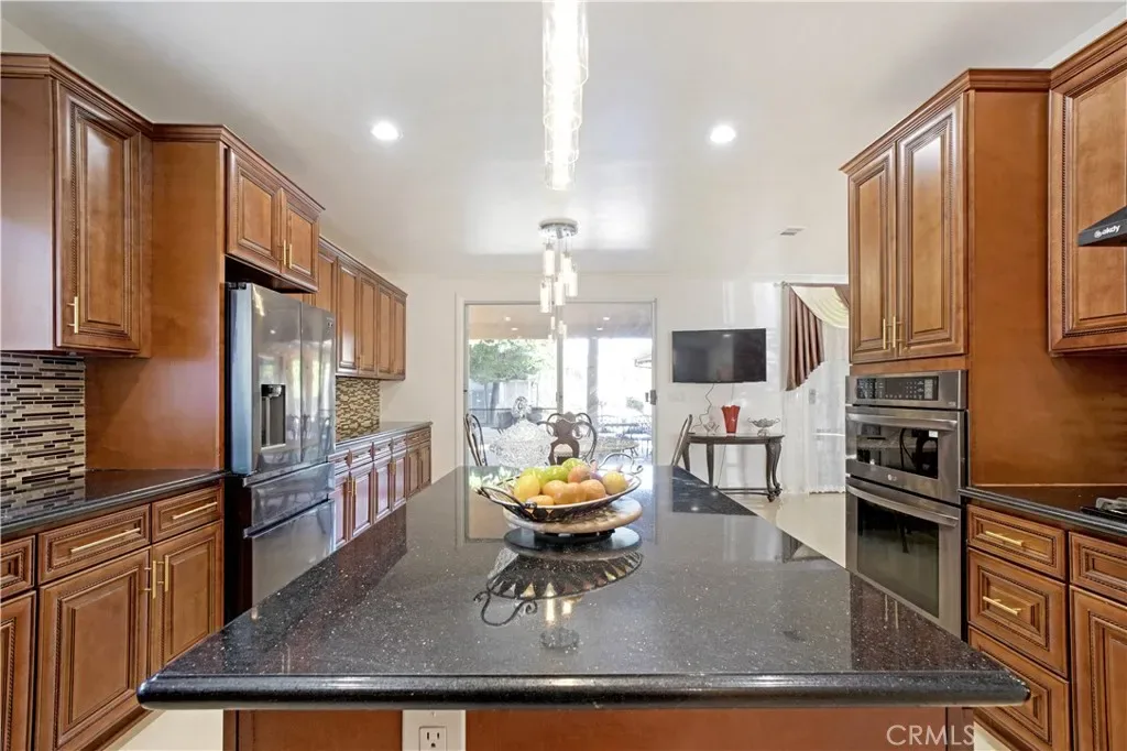 Designed for seamless indoor-outdoor living, the home features an open layout with high ceilings, dual fireplaces, and expansive sliding doors leading to a family room and vine-covered outdoor dining area. The remodeled chef’s kitchen showcases high-end finishes and premium stainless steel appliances.
