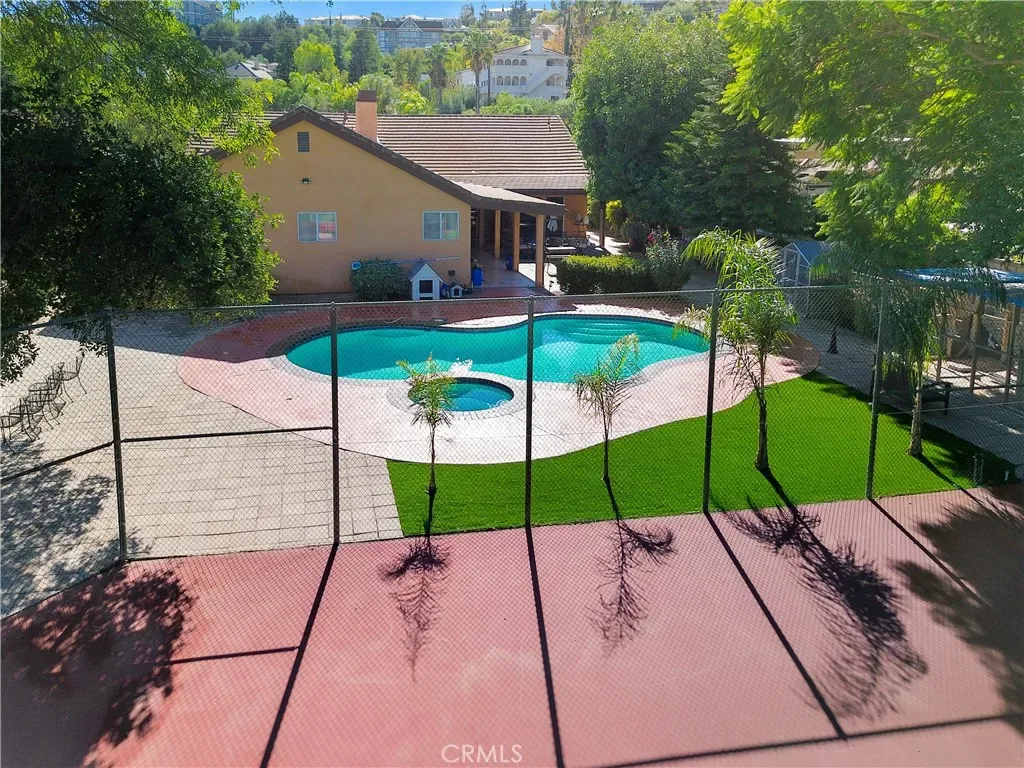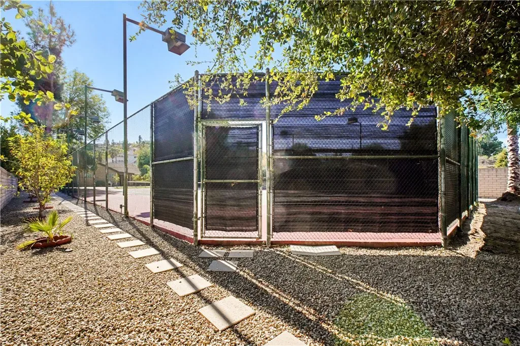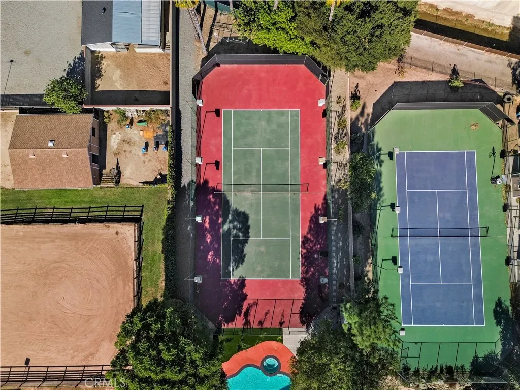 Resort-style grounds feature a pool, multiple seating areas, a professional tennis court, a basketball court, and a private bike track. The property is also designated as a horse property, with ample space for equestrian facilities.