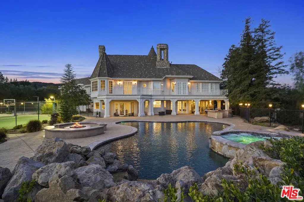 Chateaux Loire, Indian Springs Estates Behind the gates of one of the Valley’s most prestigious 24-hour guard-secured enclaves sits an estate that captures the romance of the French countryside and the scale of a true Southern California compound. Set on approximately two acres of lush, park-like grounds, this residence delivers privacy, presence, and architectural elegance rarely offered. From the moment you enter, the home reveals a level of craftsmanship reserved for luxury estates with rich hardwood flooring, custom artisan millwork, dramatic ceiling heights, and curated designer lighting create a warm yet grand atmosphere throughout. At the heart of the home is a showpiece gourmet chef’s kitchen, equipped with premium Thermador appliances, custom cabinetry, and striking Carrara marble counters and backsplash. Designed for both entertaining and everyday living, the kitchen flows seamlessly into expansive living and family spaces, all opening through French doors to the resort grounds beyond. The backyard lives like a private retreat: a sparkling pool and spa, statement fountain, fire-pit lounge, outdoor kitchen with BBQ, multiple entertaining terraces, mature fruit trees, and unobstructed views of the Santa Susana Mountains all complemented by a full-size tennis court, creating a true resort experience equally suited for large gatherings or peaceful evenings at home.
