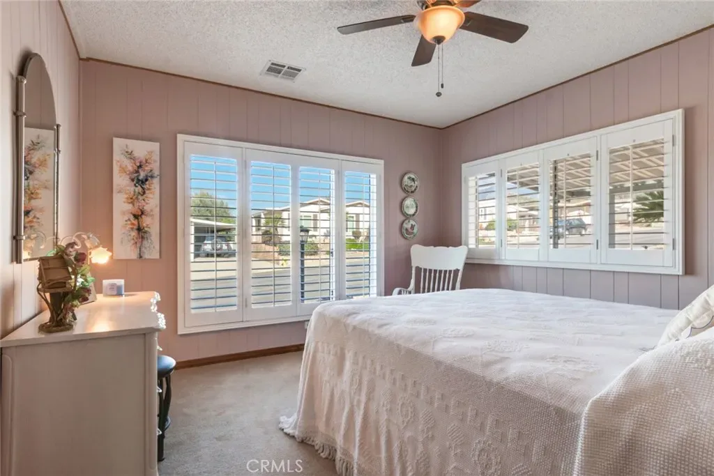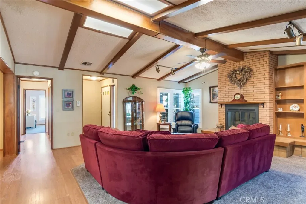 Located in the Beautiful Highland Springs Village a 55+ Community where you own your lot. This triple wide home shows pride of ownership and many updated features. The exterior is freshly painted, nicely landscaped, vinyl fencing and a newer composition roof. The Interior boasts laminate flooring with carpet, open beam ceiling and fireplace in the living room, plantation shutters, newer A/C unit, stainless steel appliances, Corian countertops, updated fixtures and more. The layout is very open with the impressive large living room anchoring the center of the home. The raised hearth, gas fireplace makes this area comfortable for gatherings. Library or music room is off of the living room. The kitchen is light and cheery, enjoying some pull-out cabinet shelving, counter space, a big stainless steel sink, a double door refrigerator and an eating area. The dining room is separate but open to the grand living area. The den has two closets so could be an additional bedroom. The primary suite is spacious and separate from the guest area. A spa style bath is enjoyed from this room with: a jetted tub, a separate shower, dual sinks, a vanity, upper mirrored cabinets and all in neutral colors. A huge walk-in closet with built-ins is a real bonus. The guest room has natural light that lifts the heart. The sun room has heat/cooler and a closet, this is an additional approximate 280sf, for a total of 2490 sf. This is a large room, great for a gym, hobby room, or a game room. Storage is abundant in this home with extra closets, built-in cabinets and shelving. The laundry room has a full wall of cabinets and uppers above the w/d. An under roof walkway between the home and the workshop is perfect for seamless access, out of the weather and private. The details of this home are well thought out and nicely put together. Off of the sunroom is access to an enclosed golf cart storage with double doors opening from the exterior for easy access. This home is impeccably maintained and upgraded, with an abundance of interior space and storage and a totally flexible layout. The patio atmosphere feels like you are in the country, when you are just a few miles from major shopping centers. The community offers golfing, fishing lake, swimming, tennis/pickleball and more with low dues.