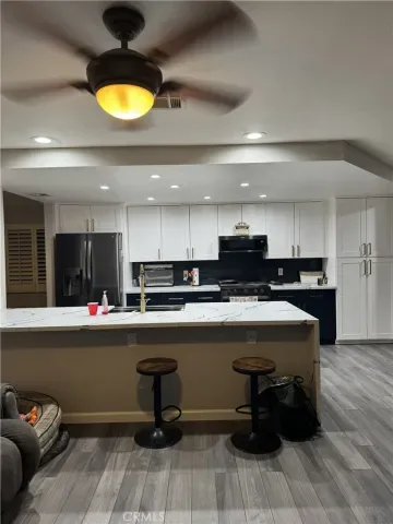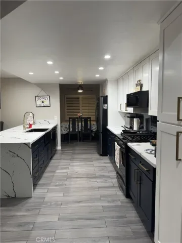 Step inside to discover a fully remodeled interior featuring wood-look tile flooring, recessed lighting, and an open, flowing layout ideal for both everyday living and entertaining. The kitchen is the heart of the home, showcasing crisp white shaker cabinetry, rich navy lower cabinets, striking quartz countertops with waterfall bookend, stainless steel appliances, a farmhouse sink, and a large island — perfect for gatherings.