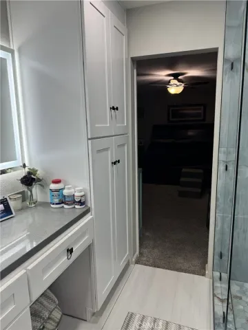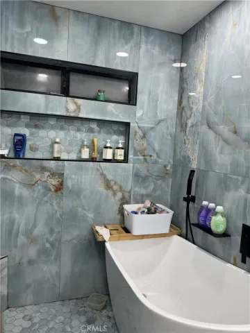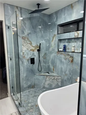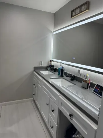 The bathrooms have been thoughtfully renovated with upscale finishes. The primary suite offers a spa-inspired retreat with a custom walk-in shower wrapped in dramatic floor-to-ceiling designer tile, a rain shower head, sleek black fixtures, dual vanities with illuminated and heated mirror, and modern cabinetry. Secondary bath upgrades continue the clean, contemporary aesthetic with a vessel sink and quartz countertop.