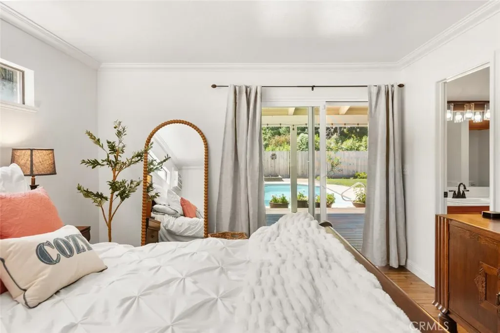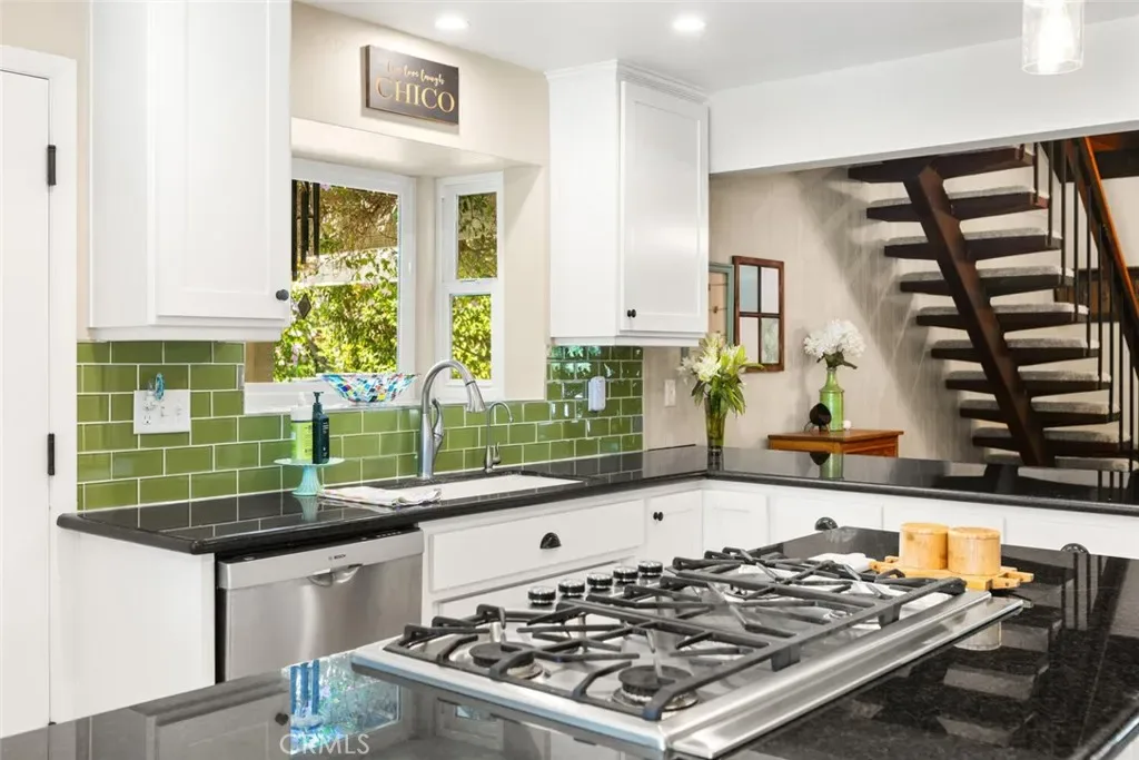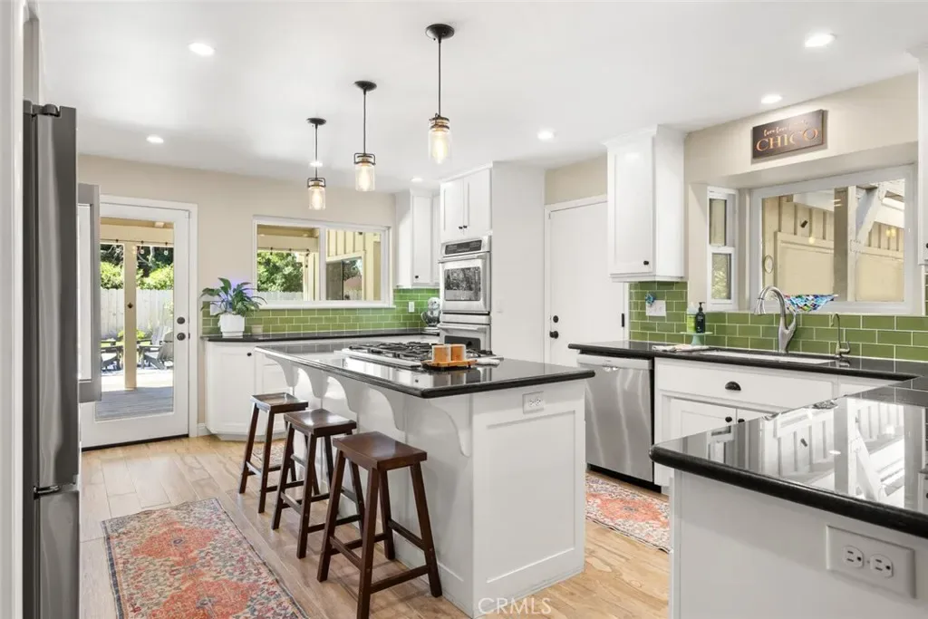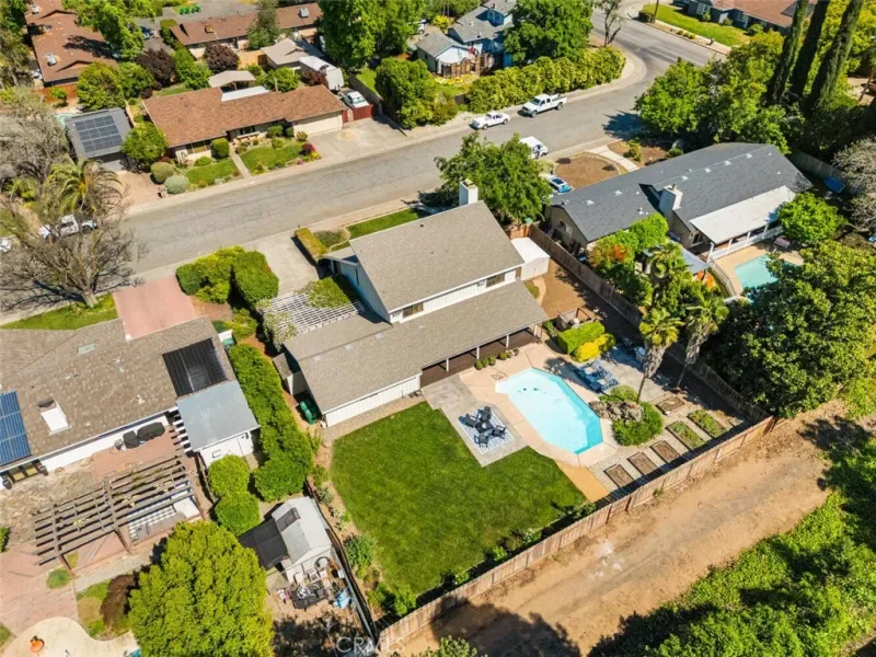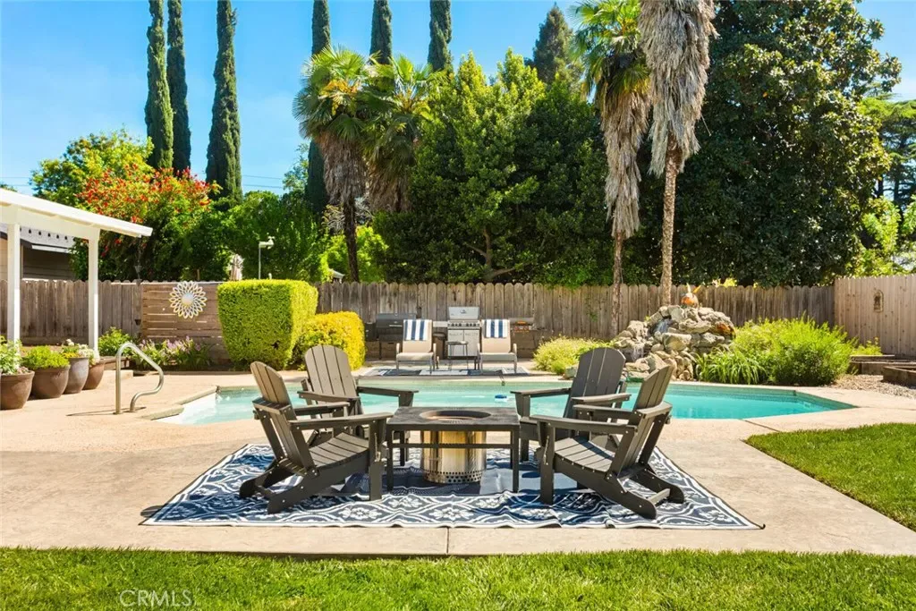 Nestled in a wonderful Chico cul-de sac offering an unparalleled blend of architectural volume and outdoor serenity. This home immediately commands attention with its vaulted ceilings, built-ins and an expansive open floor plan that flows naturally toward the heart of the home: a true chef’s kitchen. Cooking enthusiasts will appreciate the purposeful design featuring crisp white cabinetry, granite countertops, double ovens, and high-end appliances. The central island and extended breakfast counter provide ample work/eating space, complemented by a walk-in pantry for organization. Upstairs, the layout transitions to a clever Jack-and-Jill configuration where the bedrooms feature unique loft areas, perfect for elevated study nooks or creative retreats. The primary suite serves as a main-floor sanctuary with backyard access, offering significant space and a bathroom equipped with a dedicated soaking tub and a separate glass-enclosed shower. The exterior is an entertainer’s paradise. A massive back deck overlooks a meticulously landscaped backyard characterized by mature greenery and vibrant garden beds. The centerpiece is a pristine swimming pool, framed by a yard that offers both privacy and scale with direct access to a walking path located immediately behind the property. Complete with a two-car garage and a deep driveway for multi-vehicle parking, this home is a rare find. Opportunities in this quiet cul-de-sac are far and few between.