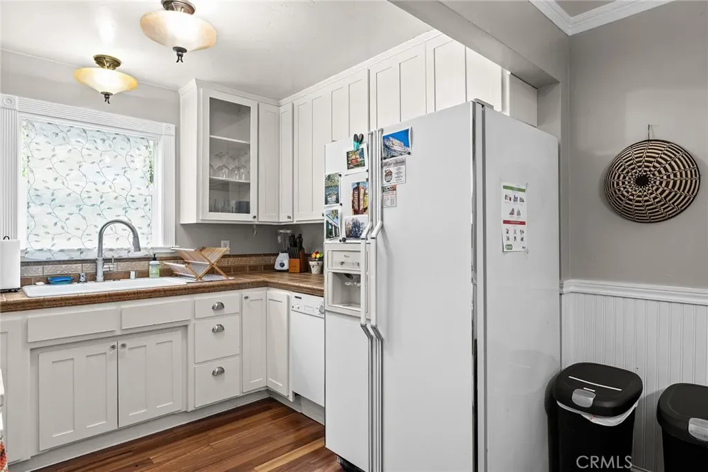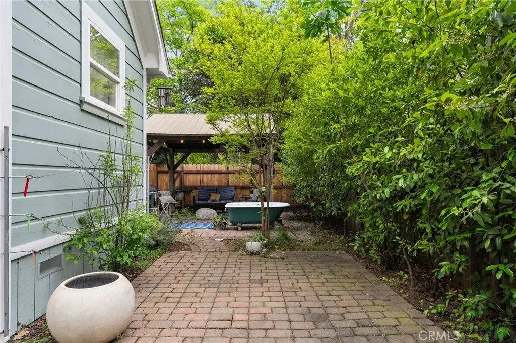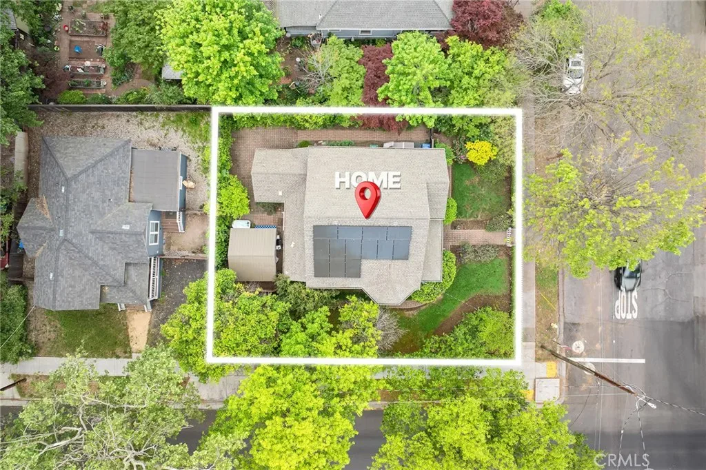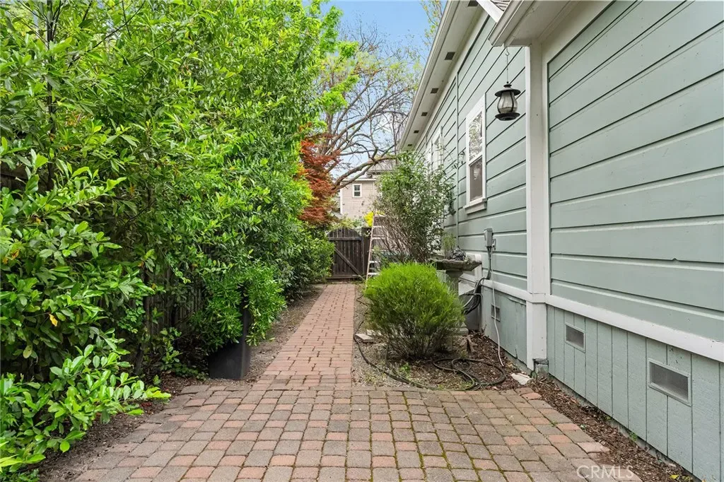 Welcome to this storybook home that blends classic Chico character with updated amenities and solar. A white picket fence, cobblestone pathways, mature landscaping and an inviting front porch set the tone before you step inside the mahogany door. Soaring ceilings and rich floors enhance the bright, spacious living room, anchored by a large bay window perfect for sunlight and reading nooks. The dining area and kitchen are ideal for entertaining, featuring white cabinetry, white appliances and a built-in buffet. Three roomy bedrooms offer updated flooring and high ceilings for an airy feel. The bathroom is timeless with black-and-white tile and a new shower. Thoughtful details include crown molding, wood-paneled doors, dual-pane windows with blinds, and convenient indoor laundry. Outside, the fully gated backyard provides privacy and a generous patio for relaxing, BBQs or weekend brunches. Excellent location—just moments from Bidwell Park and Downtown Chico. A beautifully maintained home with timeless curb appeal and modern livability.