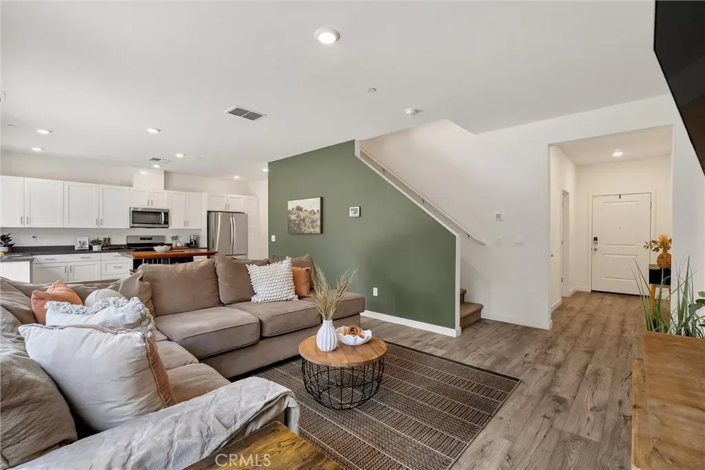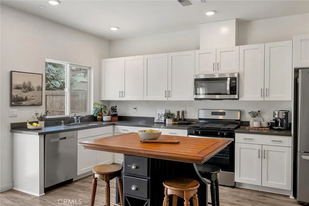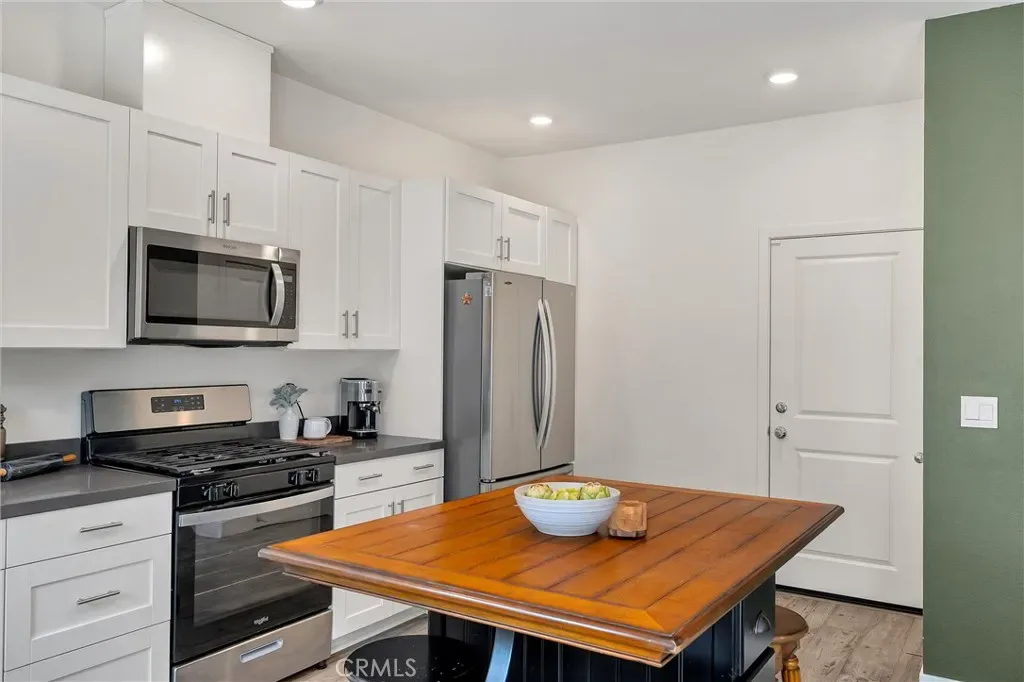 The modern and functional kitchen features quartz countertops, stainless steel appliances (including LG refrigerator), soft-close cabinetry & drawers, and a spacious pantry for ample storage.