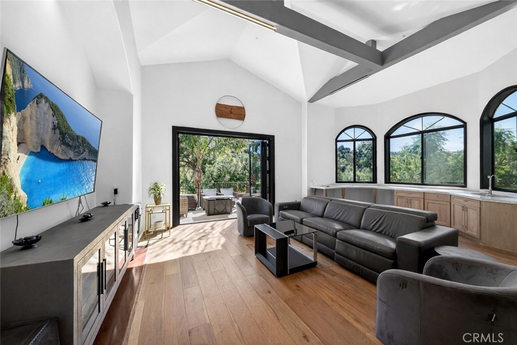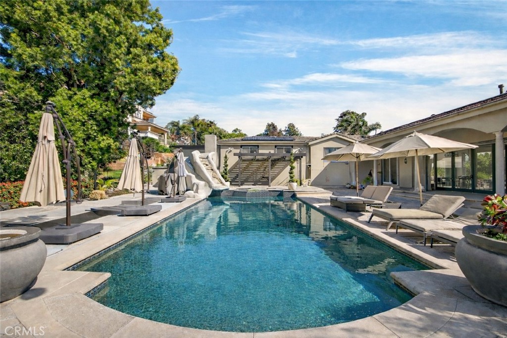 Experience elevated estate living in the prestigious gated enclave of Western Hills with panoramic golf course views. This custom architectural residence spans approximately 6,661 square feet on an expansive 55,750 square foot lot, offering 5 bedrooms and 6 bathrooms with exceptional scale and privacy. A custom modern gate and contemporary garage doors open to a circular motor court framed by manicured landscaping and sweeping fairway vistas. The double-door entry reveals a dramatic interior defined by soaring ceilings, skylights, upgraded flooring, and refined architectural detail. A stunning main hallway lined with French doors captures pool views on one side and golf course vistas on the other. Designed for entertaining, the living areas feature whole-home surround sound and a dual-sided fireplace flowing seamlessly into the remodeled chef’s kitchen showcasing a waterfall quartz island, rich European cabinetry, and integrated appliances. Expansive bifold door systems fully retract along the golf course side, creating true indoor-outdoor living with unobstructed views. The formal dining room opens to the golf course terrace, while a separate family and game lounge with a custom bar and wood beam accents connects to both the golf terrace and the private pool side. The main level also includes a private bedroom suite and guest bathrooms. The lower level forms a residential wing featuring four bedrooms and access to a full-length covered patio. The expansive primary retreat offers a sitting area and bifold doors framing fairway views. The spa-inspired bath includes dual vanities, a soaking tub, an oversized shower, and an extraordinary 1,400 square foot custom walk-in dressing room. A secondary bedroom features an ensuite bath, while two additional bedrooms share a beautifully appointed hallway bath. The resort-style grounds offer a private setting separate from the golf course exposure. The saltwater pool with waterslide and spa features updated equipment, complemented by a sport court, built-in BBQ, outdoor fireplace, and multiple entertaining decks. Additional highlights include a three-car garage with EV charging and 59 solar panels. A rare estate offering architectural presence and resort-caliber living in one of Chino Hills most exclusive gated communities.