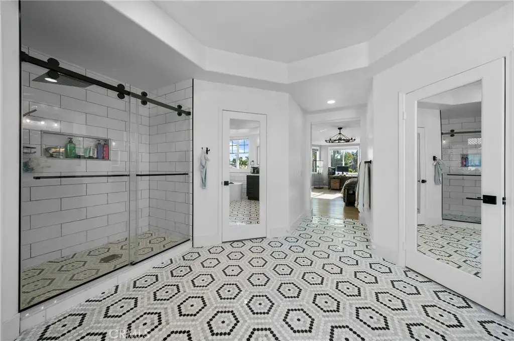 The main floor features a bedroom and a full bathroom, ideal for guests or multi-generational living. The expansive primary suite offers a private sitting area, two walk-in closets, and a beautifully renovated primary bathroom with a soaking tub, separate shower, dual vanities, and a makeup vanity.
