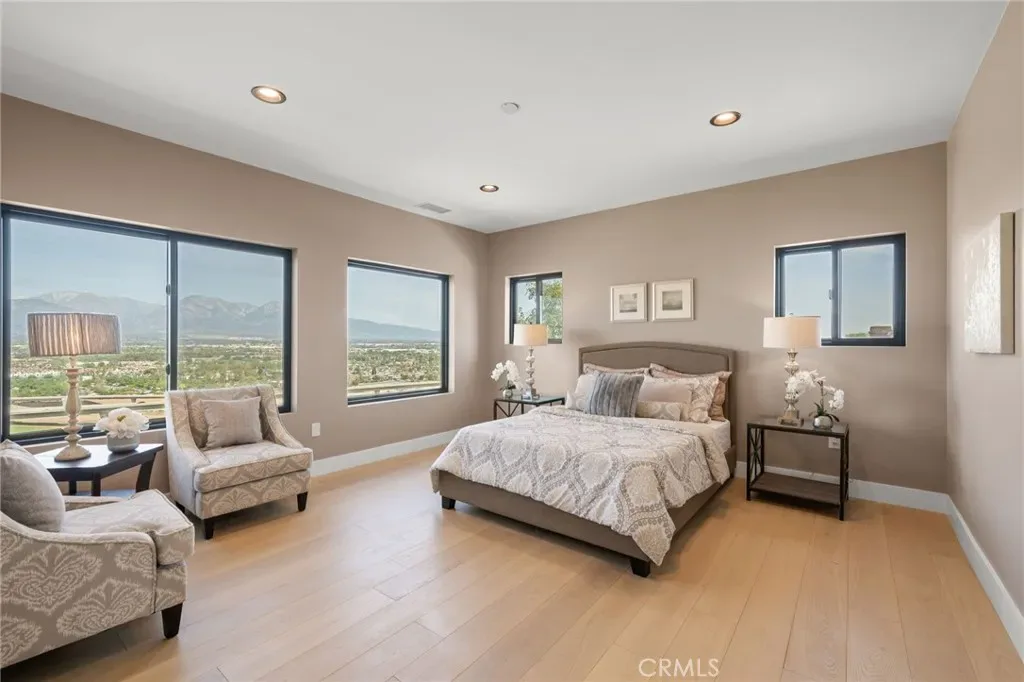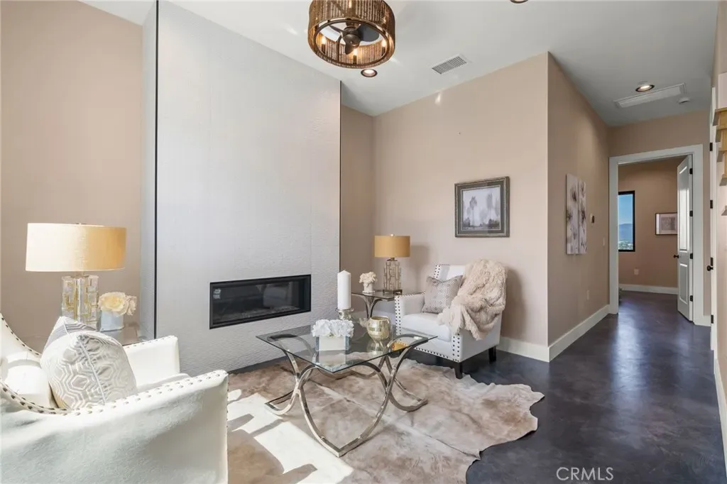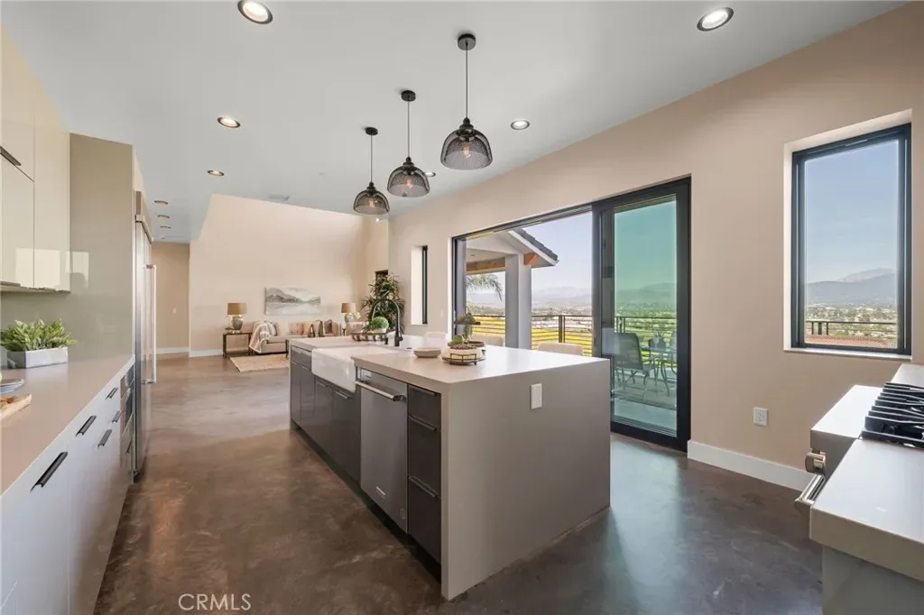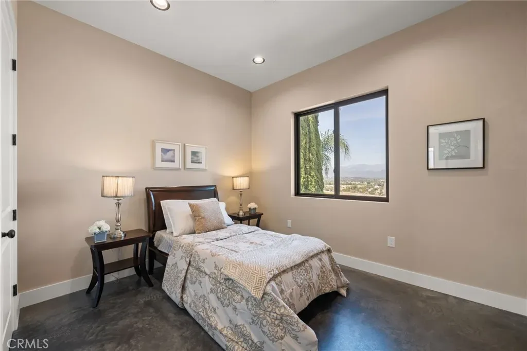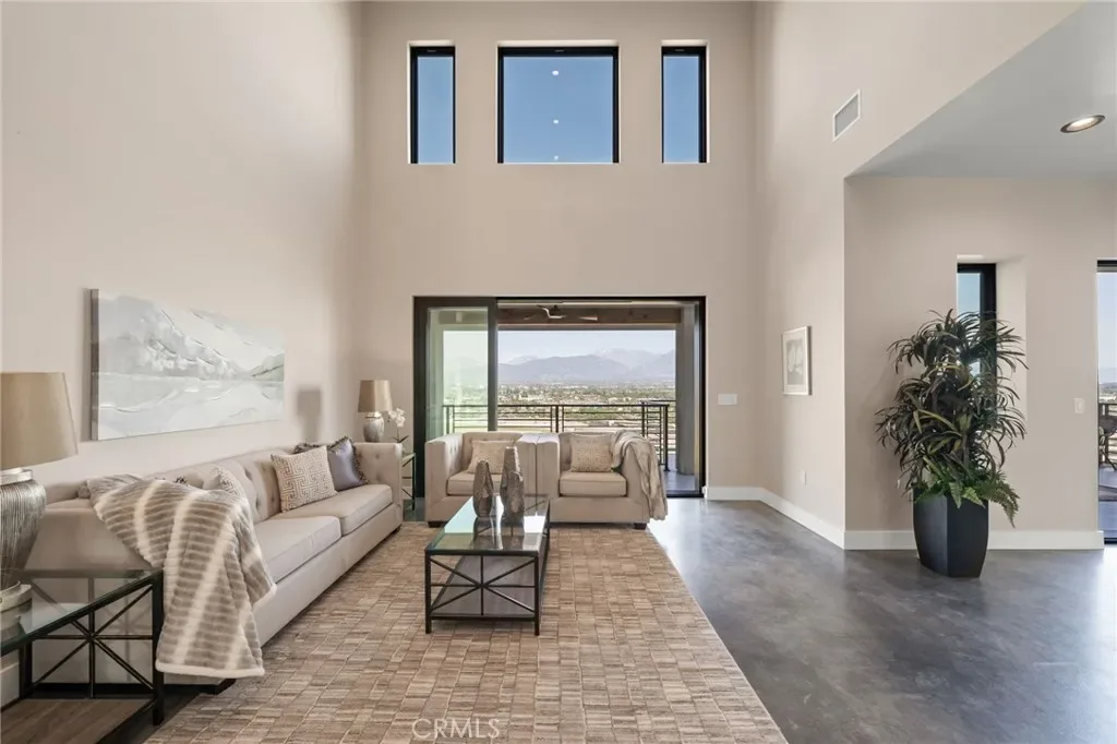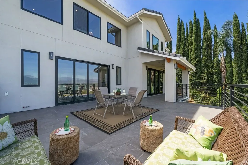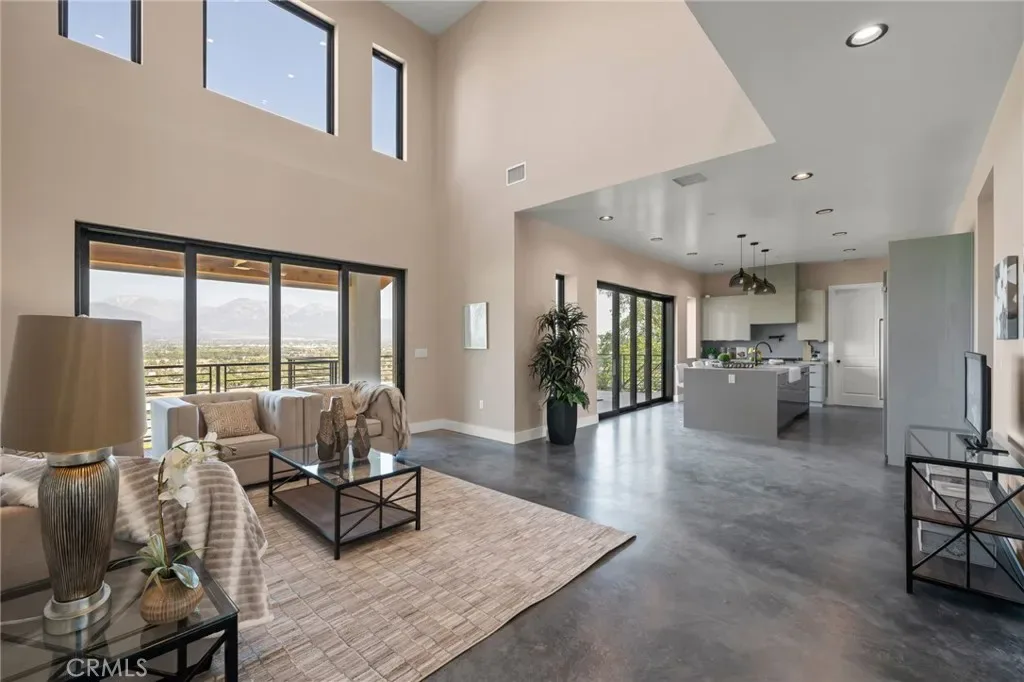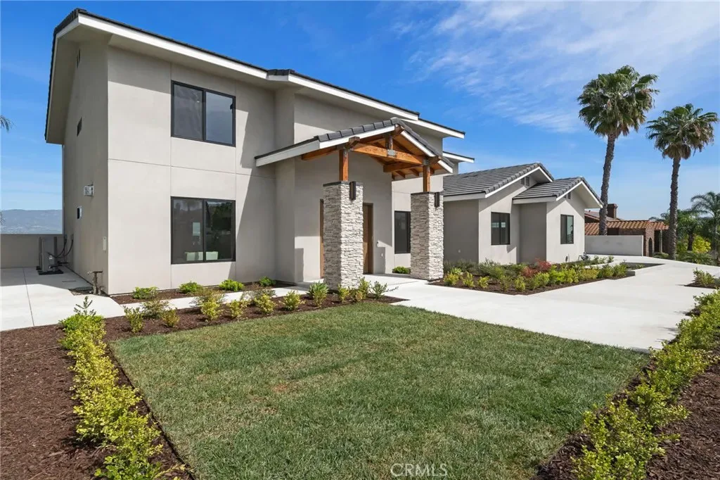 The main level includes a desirable en-suite bedroom, ideal for guests or extended family. At the heart of the home, the chef’s kitchen showcases sleek modern cabinetry, a 6-burner range, generous prep space, and a clean contemporary aesthetic that opens to the dining and living areas. The first floor features designer-finished concrete floors, adding a bold modern touch and durable style. Upstairs, the luxurious primary suite captures spectacular views and offers a walk-in closet and spa-inspired bath with beautiful tile finishes, dual vanities, soaking tub, and separate shower. Additional upstairs bedrooms are well-sized and thoughtfully arranged, including another en-suite and two bedrooms connected by a shared bath. Architectural highlights include a modern staircase with steel framing and wood accents, a bridge-style upper landing overlooking the great room, designer tilework throughout, and selected finishes that give the home a polished, upscale feel. The finished approximately 650 sq. ft. two-car garage offers excellent utility, while the oversized driveway provides abundant parking. Built for hillside conditions with substantial structural support, including caissons, this home combines beauty with peace of mind. Additional features include paid solar, dual HVAC condensers, an oversized water heater, quality insulation, and a private front courtyard entry. Conveniently located near major freeways, shopping, dining, parks, and Chino Hills State Park, this is a rare opportunity to own a brand-new custom home with commanding views in one of Chino Hills’ most desirable hillside settings.