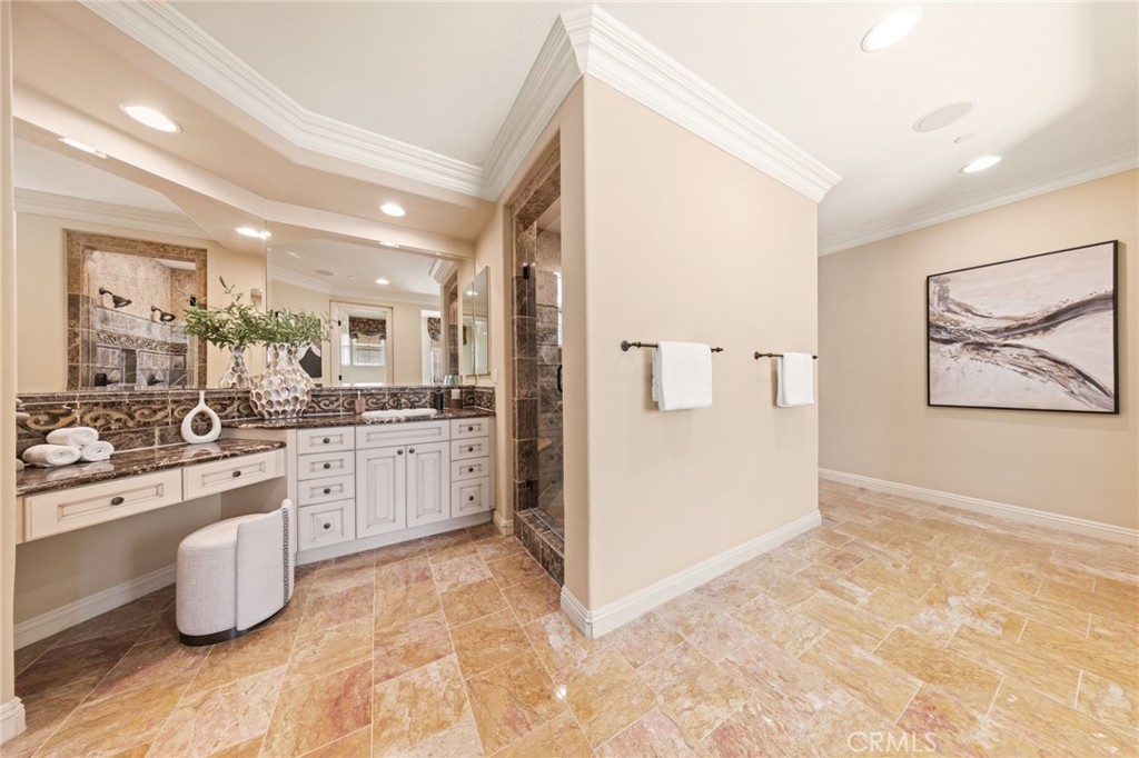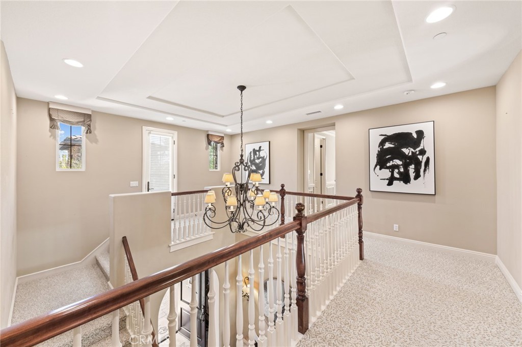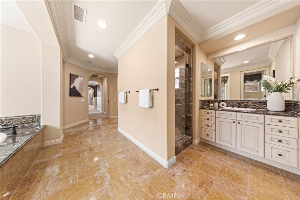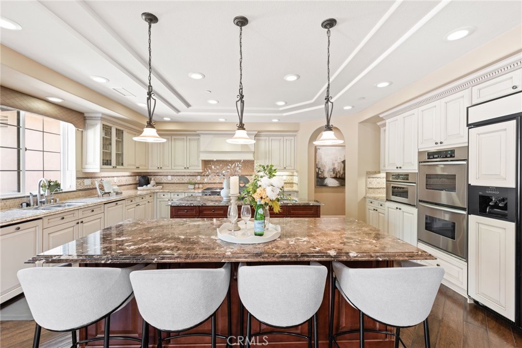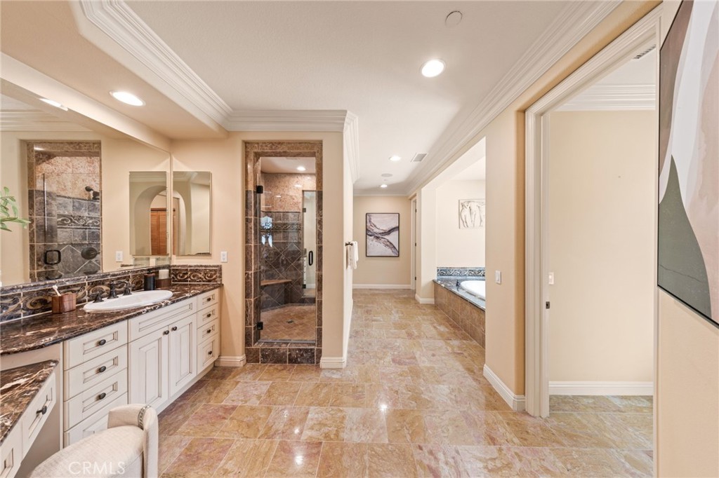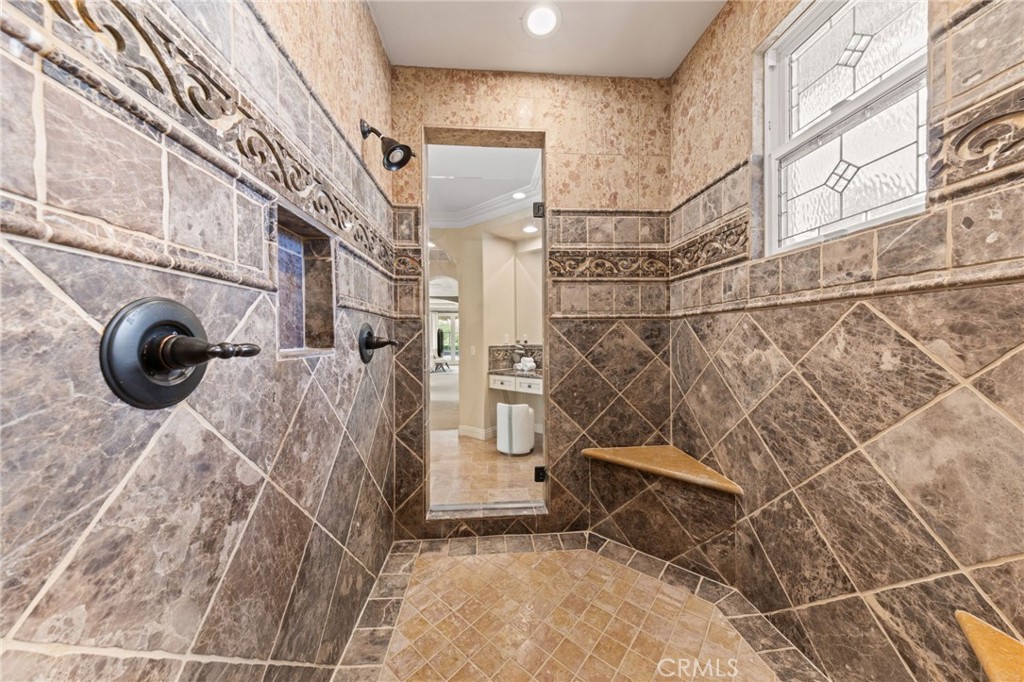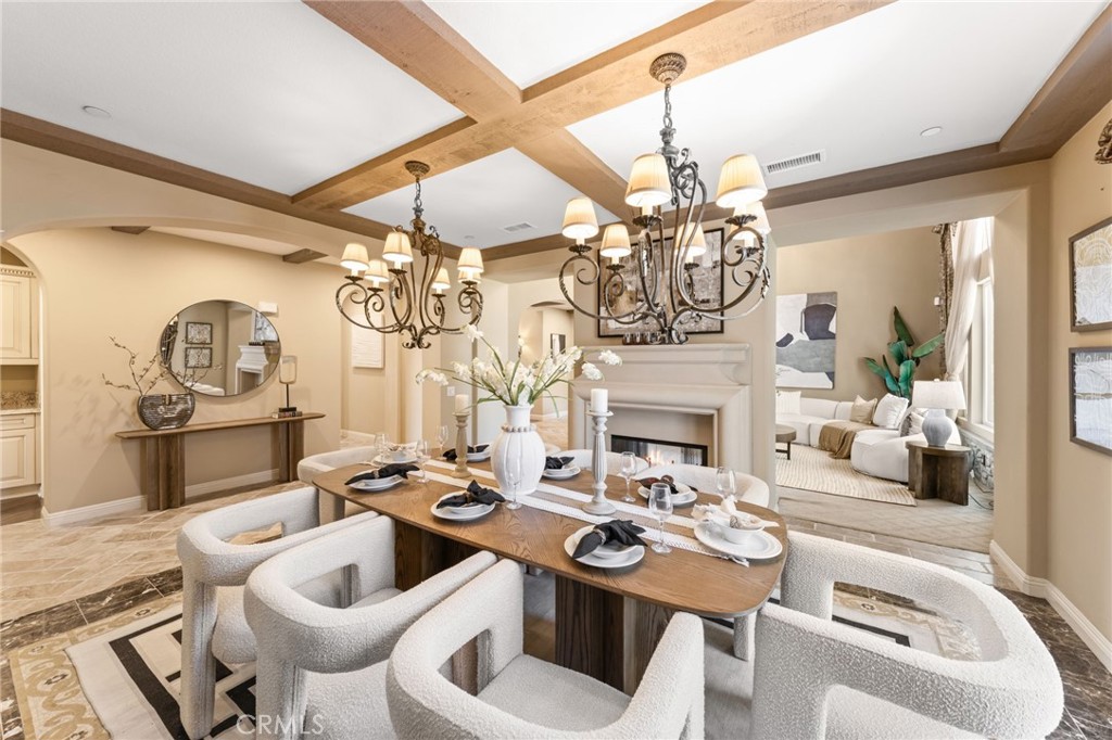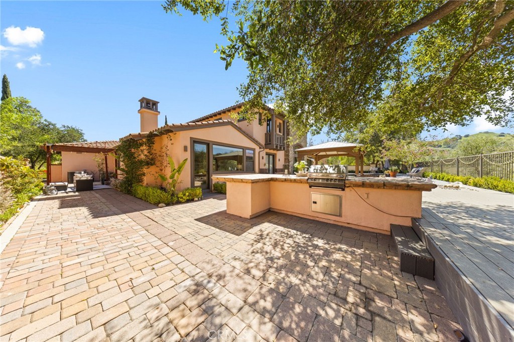 Located in the prestigious 24-hour guard-gated Vellano community of Chino Hills, this exceptional Tuscan-style estate offers 5,432 sqft of living space on an oversized 24,025 sqft lot, combining privacy, elegance, and functional luxury. A private front courtyard welcomes you into the property, featuring a detached casita—ideal for guests, multi-generational living, or a private entertainment space. Inside, the home opens to a grand living area with soaring ceilings and a beautifully designed fireplace, creating an impressive and airy atmosphere. Natural light fills the space, enhancing the home’s open and refined layout. The main level includes a spacious private office with built-in bookshelves and with direct courtyard access—perfect for working from home. The gourmet kitchen is designed for both everyday living and entertaining, featuring dual center islands, premium granite countertops, and stainless-steel appliances, including KitchenAid built-in refrigerator, 6-burner cooktop with griddle, dual ovens, built-in microwave, dual dishwashers. The kitchen flows into a generous family room with direct access to the backyard and views of the rolling hills beyond. The property has second wok kitchen, ideal design for daily cooking. The family room with built-in media center and fireplace. The formal dining room with custom wood beams and custom chandelier. The primary suite is conveniently located on the first floor, offering a retreat area, dual walk-in closets, and direct access to the backyard for seamless indoor-outdoor living. Primary bathroom with large shower, soak bathtub, dual sinks. Upstairs, three well-appointed en-suite bedrooms are positioned along a wide hallway, each offering its own private bathroom for comfort and privacy. A lot of notable features, including marble flooring, custom two-tone paint, premium wallpaper, custom window coverings, crown moldings, large laundry room with sink. The backyard is expansive and thoughtfully designed, offering exceptional privacy. Enjoy outdoor living with a built-in BBQ, covered pavilion, and open space to relax or entertain, all set against scenic hillside views. A long private driveway leads to an additional flat area, providing endless possibilities for future expansion, a sport court, or custom outdoor enhancements. As a former model home, the property showcases quality finishes and thoughtful design throughout.